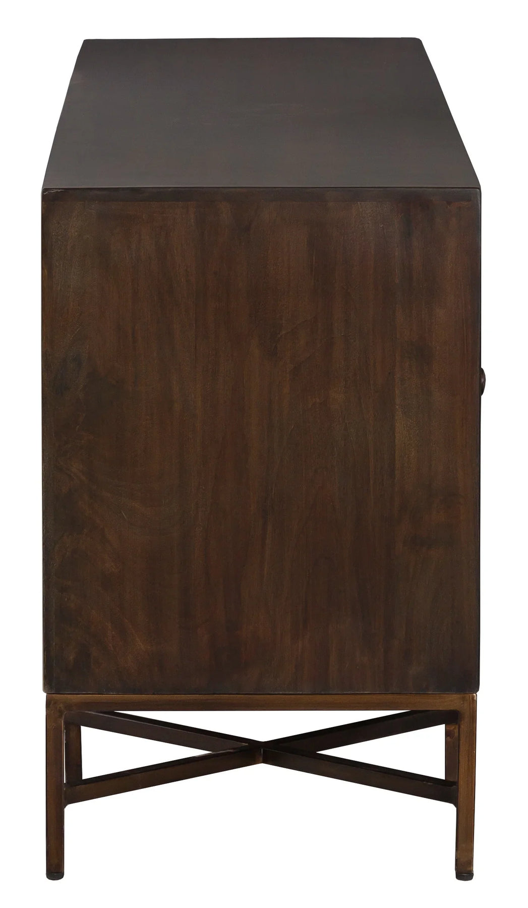 The Palm Leaf Credenza features intricate door fronts inspired by the leaves of a desert palm. The unique finishing of this piece is achieved from layered glazing of various colors.