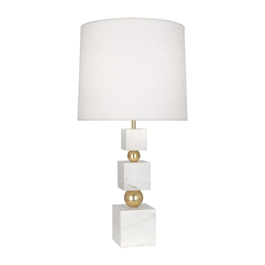 Three blocks of black marble separated by two polished brass orbs to create a stacked pyramid silhouette. Gravity-defying modern glamour topped with an oyster linen shade. Singular on a side table or fabulous flanking your bed.