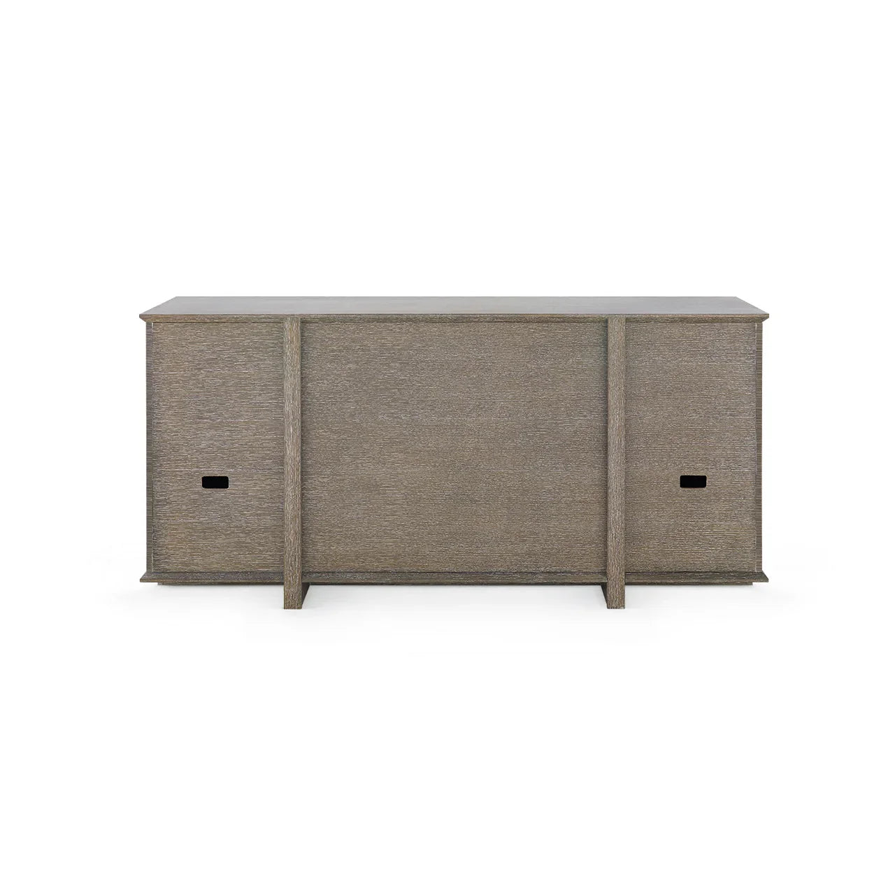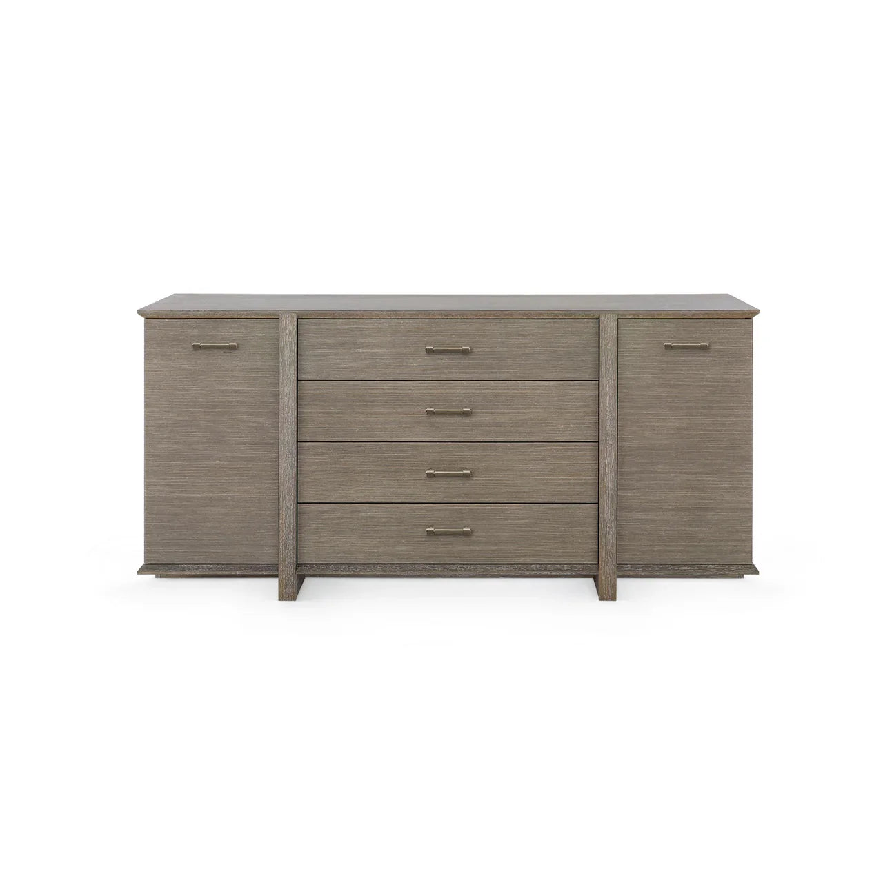 The Watson Collection showcases a custom shimmer grasscloth in an elegant grey-brown tone, offering a sleek, modern aesthetic with a bold, masculine appeal. It features unique cast bronze bar pulls that enhance its striking design. With two cabinet doors and four spacious drawers on soft-closing glides, this collection blends contemporary sophistication with rich textures, making it an eye-catching addition to any space.