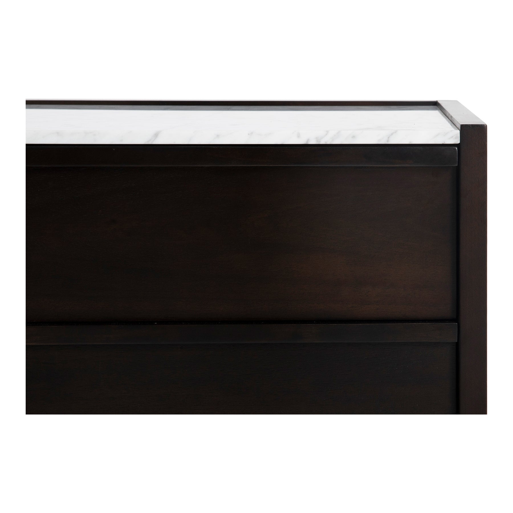 The perfect bedroom companion. The brown finish brings a modern warmth to the piece that pairs naturally with a variety of interior palettes. A white marble tabletop lies firmly over acacia veneer based drawers. A drawer or shelf keeps bedside essentials — books, charging cables, and reading glasses — organized and within easy reach through the night. The modern aesthetic makes it a natural fit for design-forward interiors that favor character over convention.