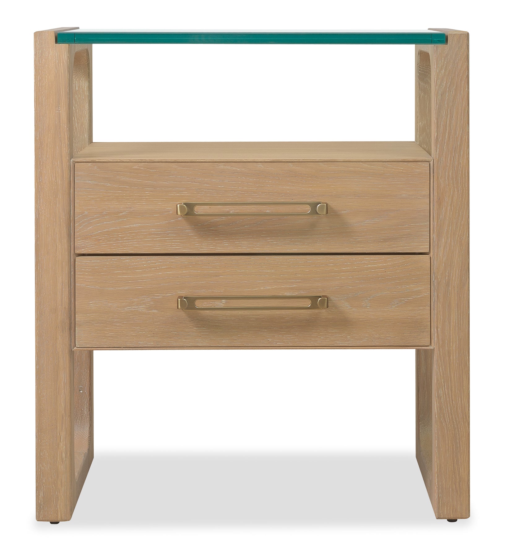 The Banyon Bay Two Drawer Nightstand offers a balance of function and design. With its light Desert Oak finish, this nightstand features white oak solids and oak veneers with tempered glass. The multi-step finish includes wire-brushing and cerusing for added texture, while stainless steel custom bar hardware adds a modern touch. It has two drawers with oak veneer bottoms, an open storage area beneath the glass top, and an open side design, offering stylish storage for your essentials. Perfect for contemporary bedrooms, this nightstand enhances your space with a sleek and refined look.