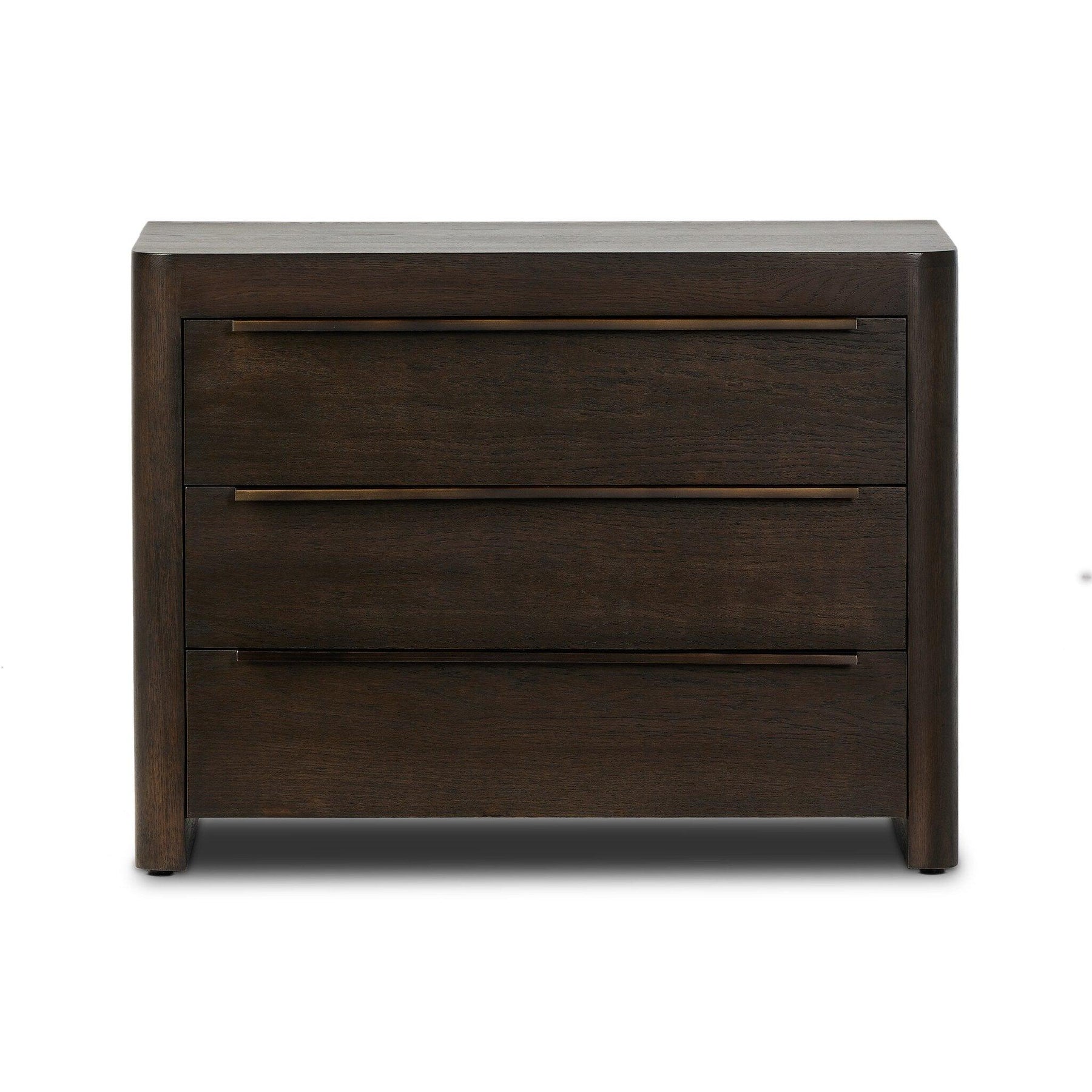 Crafted from espresso-finished oak, the Bruce Nightstand features a minimalist design approach that allows the natural wood graining to stand out. Three roomy drawers with long horizontal pulls offer generous bedside storage in a clean, contemporary package. The construction is solid and the drawer operation is smooth — a nightstand that holds up to daily use while maintaining its visual integrity.