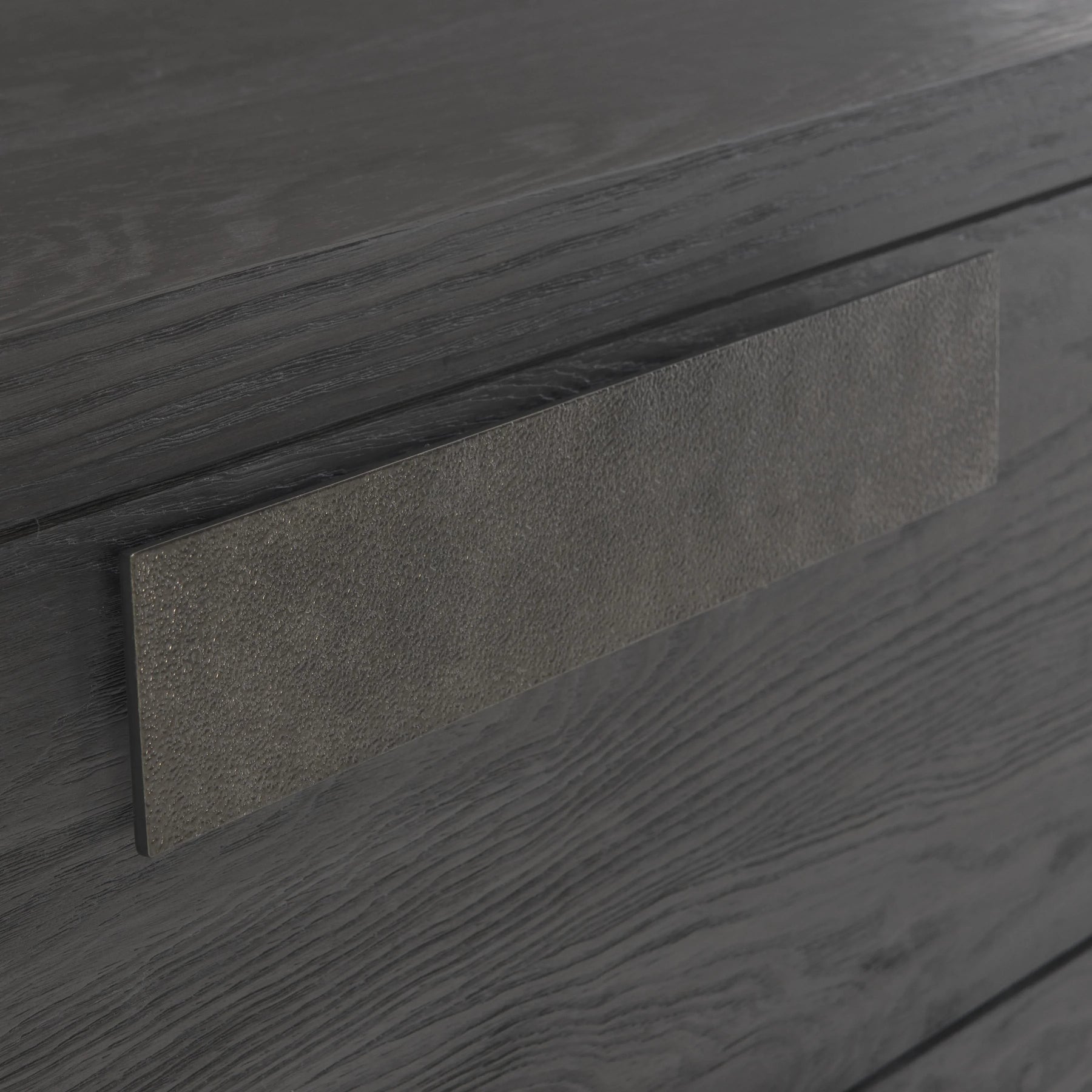 The construction of this piece reflects Bernhardt's uncompromising standards at every stage of manufacture. The keali nightstand showcases straightforward lines and a strong geometric shape for a modern design on a plinth base, bold and textured cast aluminum hardware complements the nightstand's shape on two drawers, and an ebonized pine finish creates a dark visual interest with depth. The cumulative effect of these construction choices is furniture that will maintain its beauty, structural integrity, and functional precision through years of daily use.