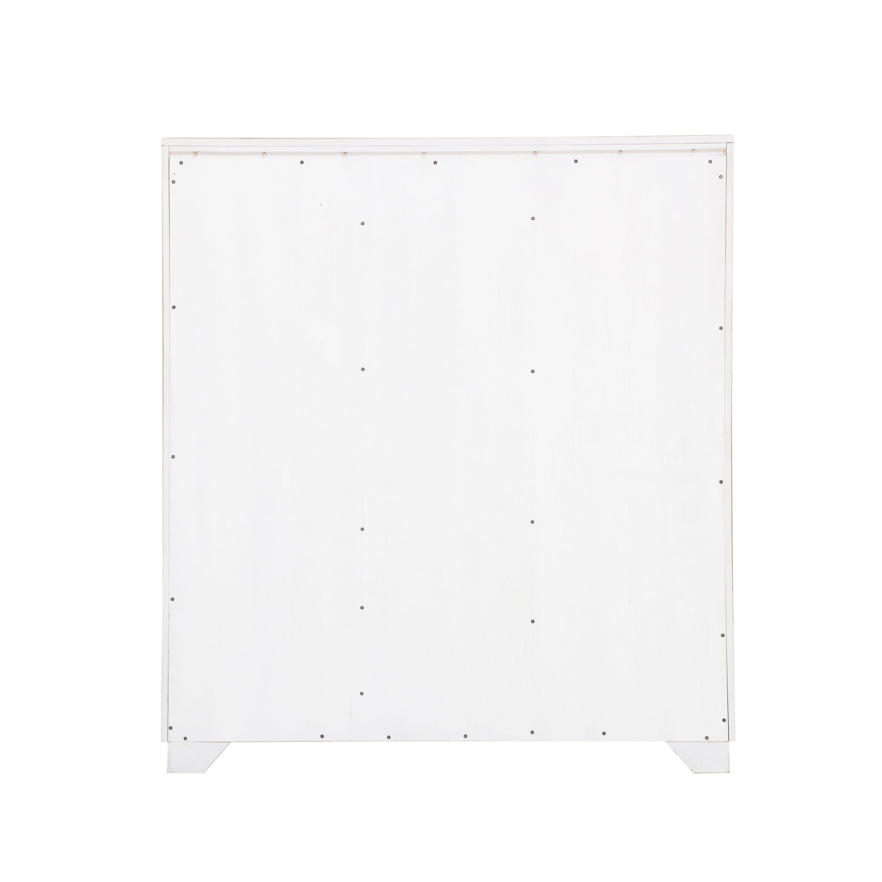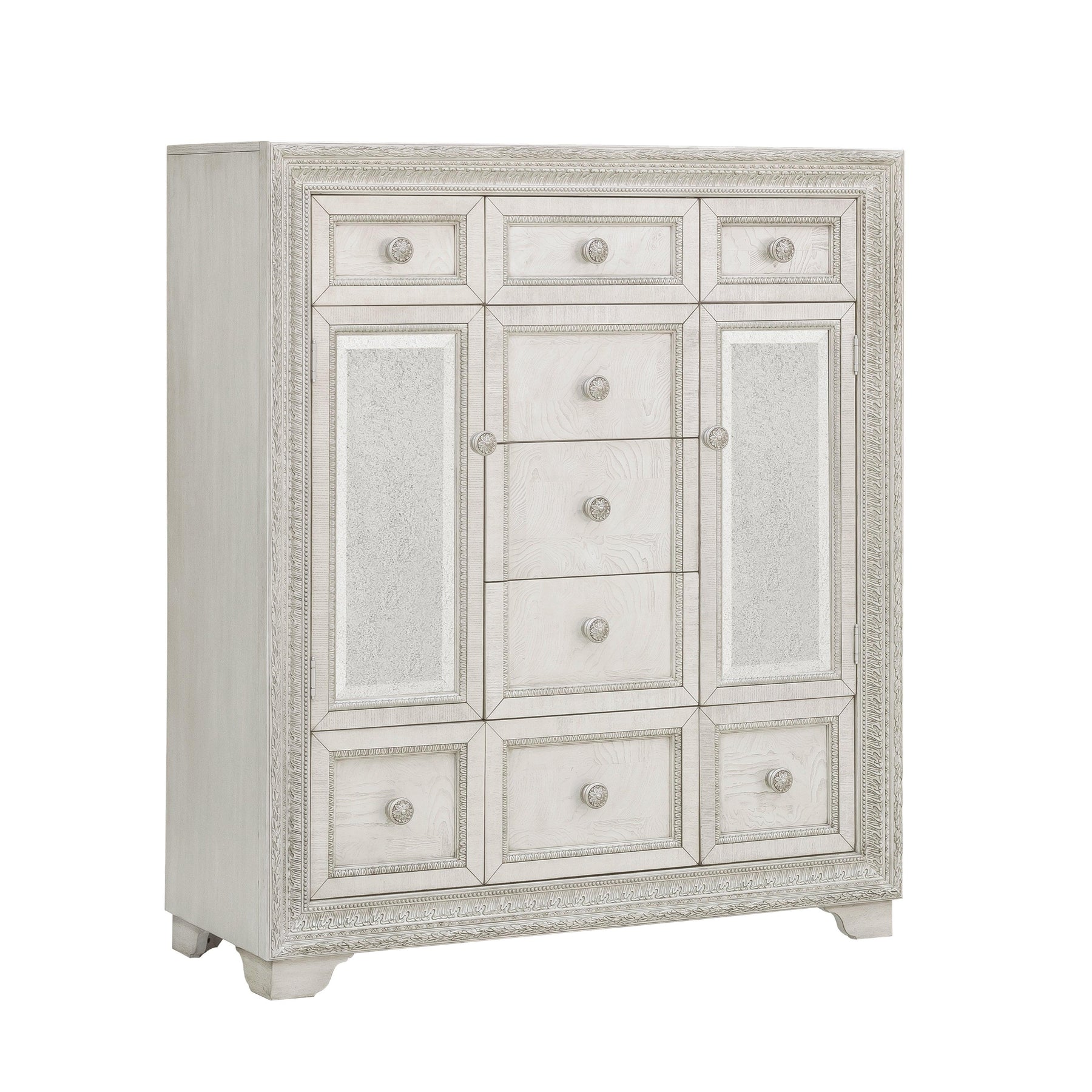 Bring elegance and functionality to your bedroom with our Camila Door Chest. This piece displays a quiet, regal presence, featuring nine drawers, two doors with antique mirror panels, and silver-tipped intricate moldings for a shimmering, luxurious touch. A semi-transparent creamy white finish enhances the distinctive swirly ash veneer construction. Behind each door are two adjustable shelves. Rosette-shaped silver drawer pulls and bracket feet complete the look, adding elegance to the overall aesthetic.