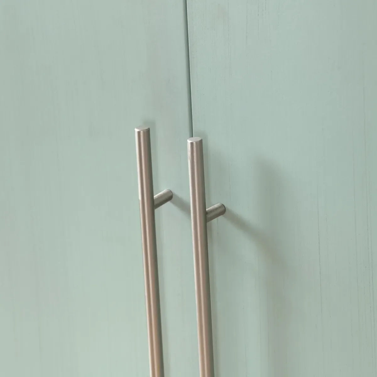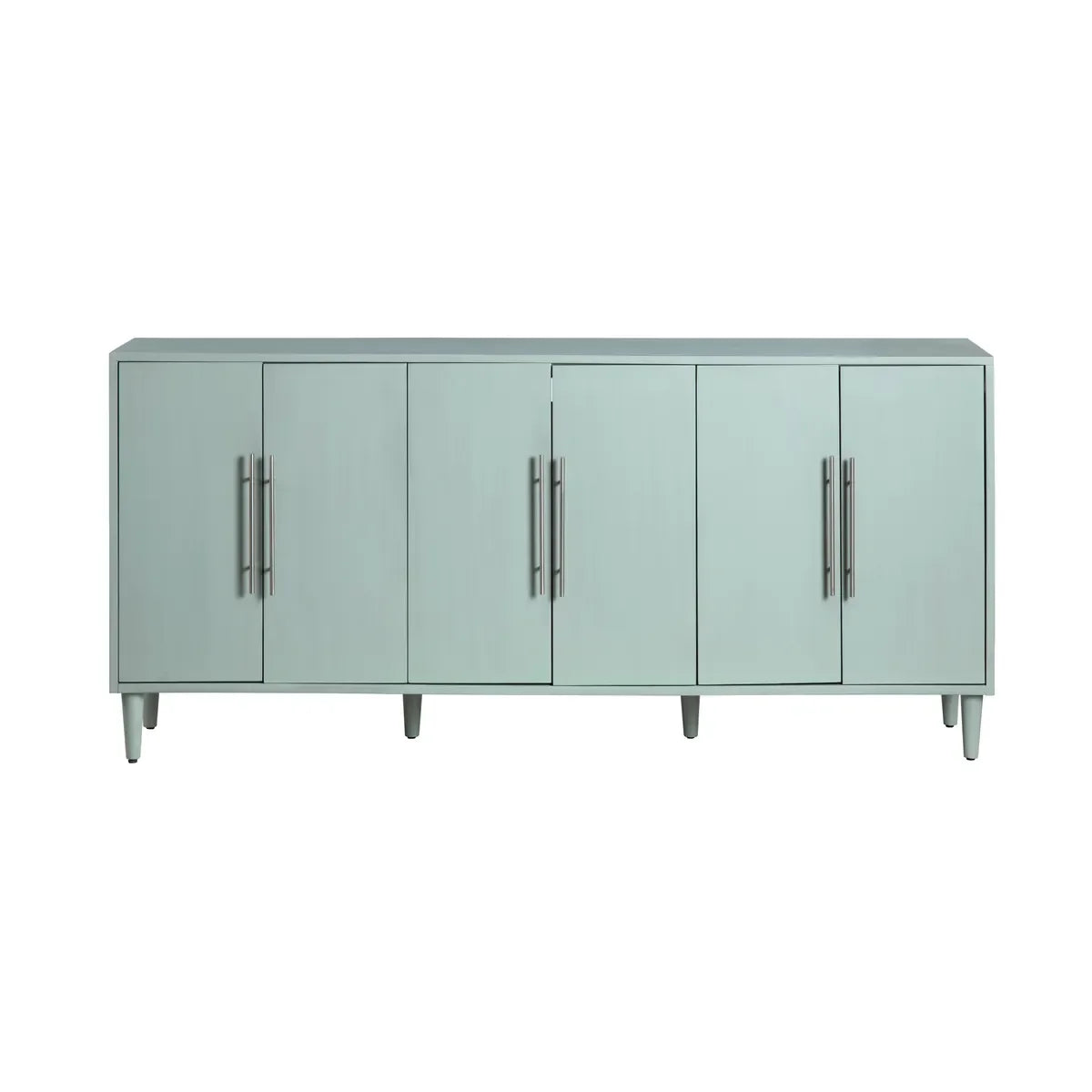 Transform your space with our 6 Door Media Credenza/Sideboard in a relaxing smooth sea foam green painted finish. The six doors, featuring upgraded European hinges and oversized brushed nickel bar handles, offer a blend of elegance and modern functionality. Inside, three fixed shelves provide ample storage, while cord management holes keep cables tidy. Tapered legs and adjustable levelers ensure stability. Easy to assemble—just add the legs—for a serene yet sophisticated addition to any room.