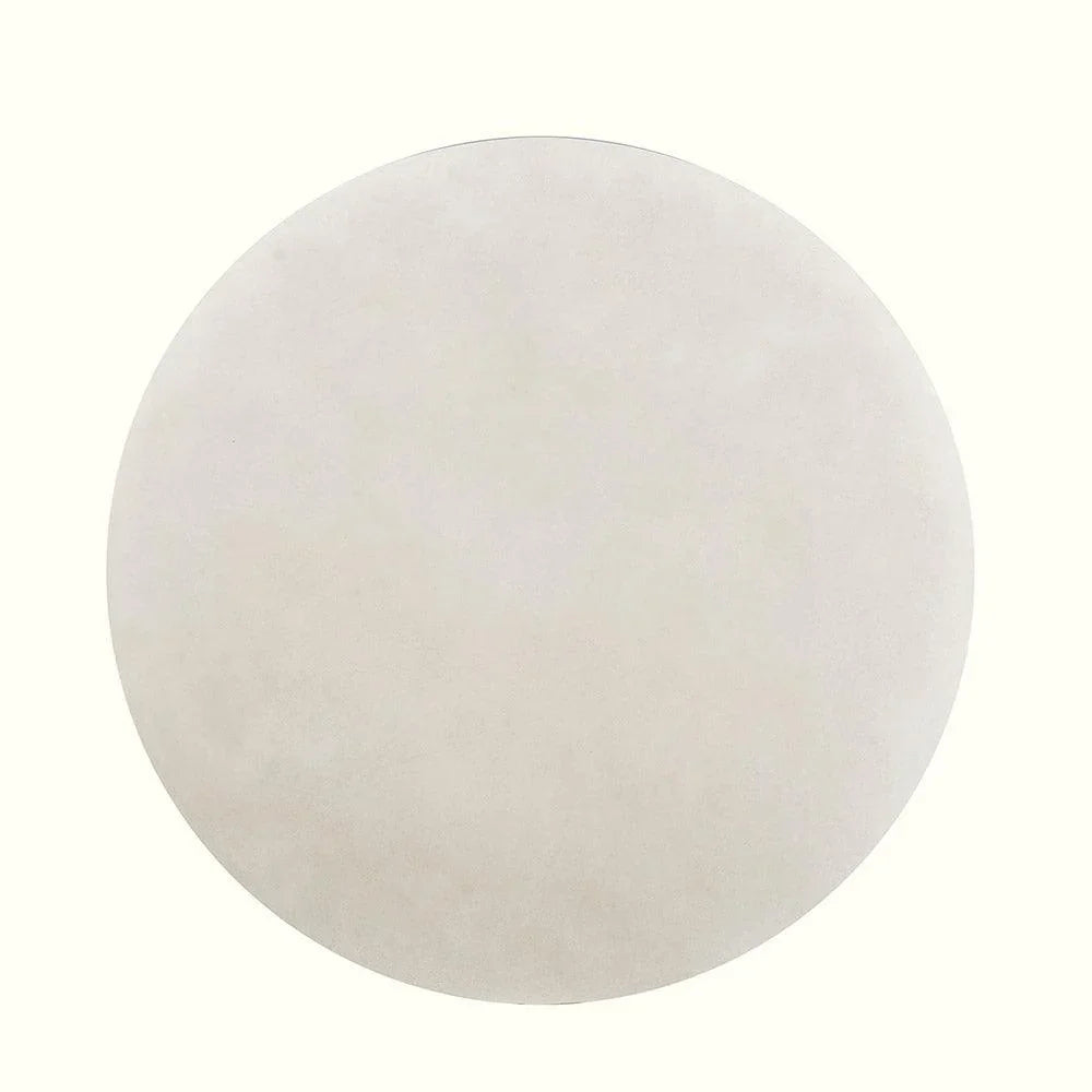 Our Fresco Coffee Table features a sculpted, round, smooth top, a thick, tapered top edge, and a tapered plinth base