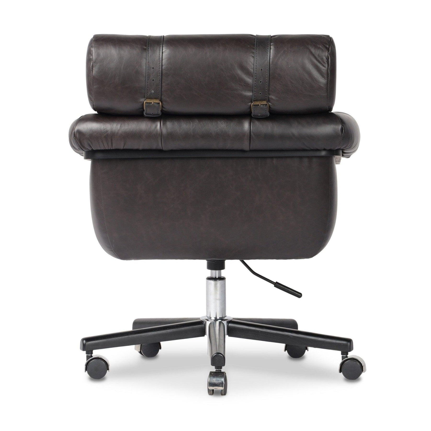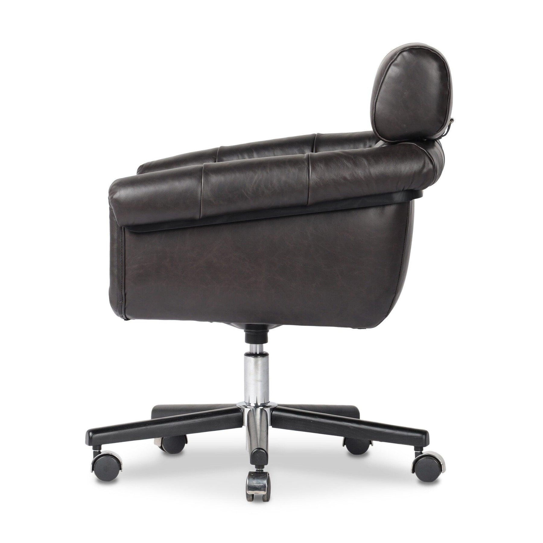 A detail-driven take on a new favorite desk chair. Made from black top-grain leather a fully tufted seat means maximum comfort while casters and seat height adjustability make for ease in the modern office.
