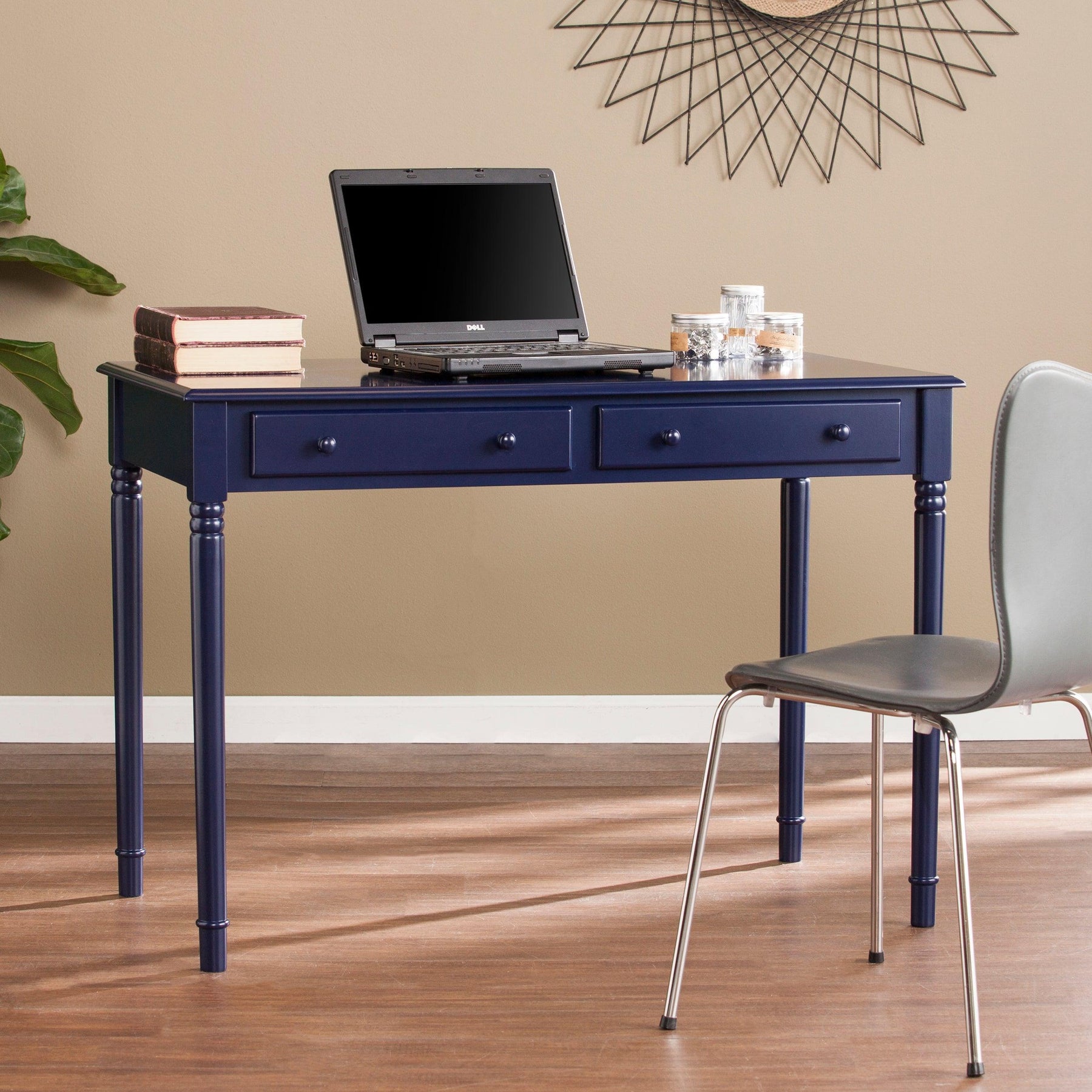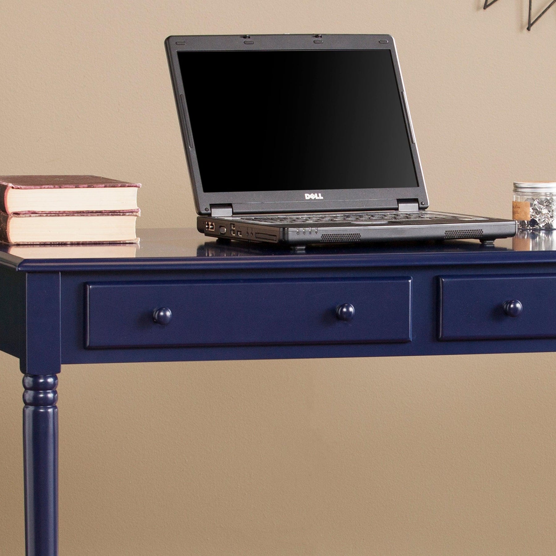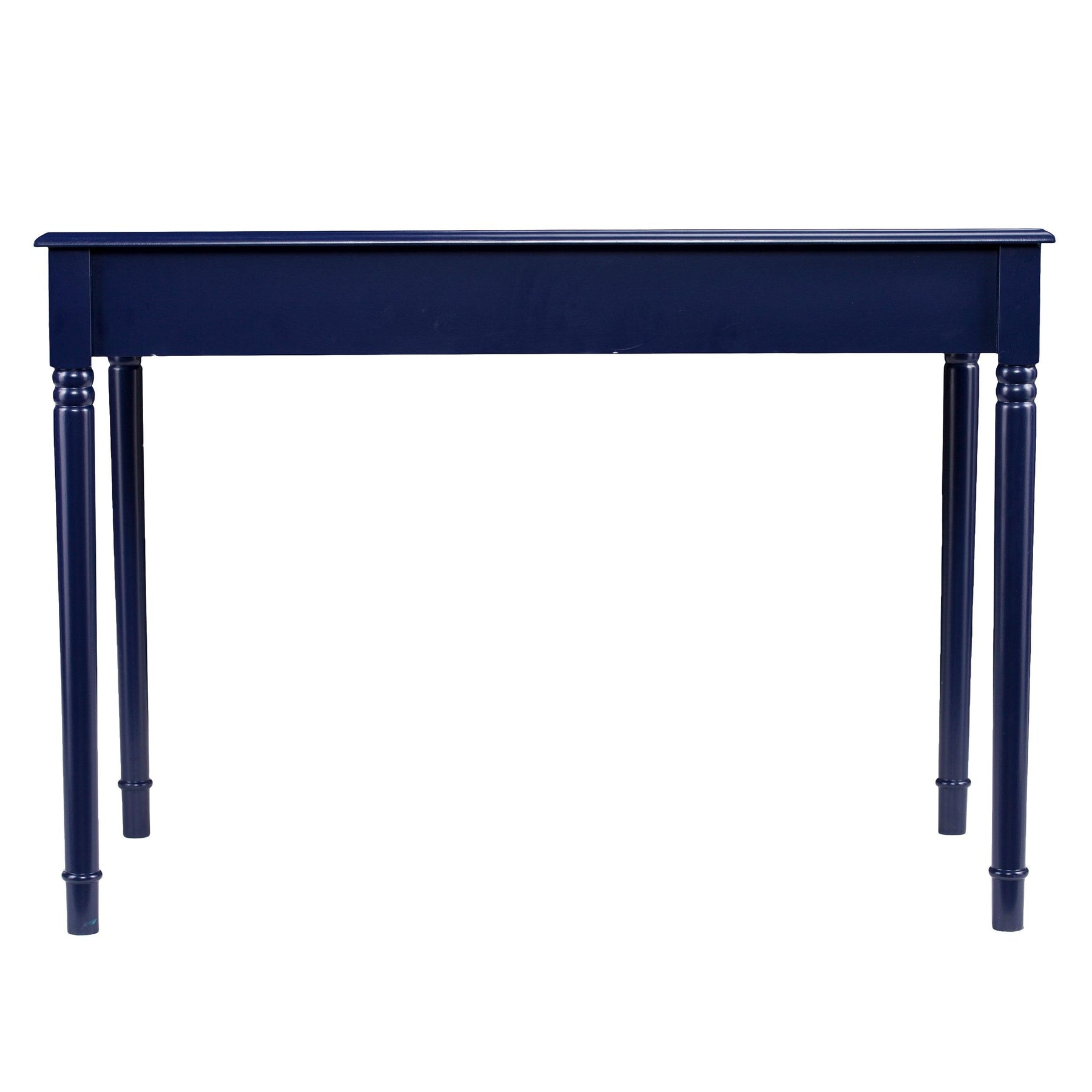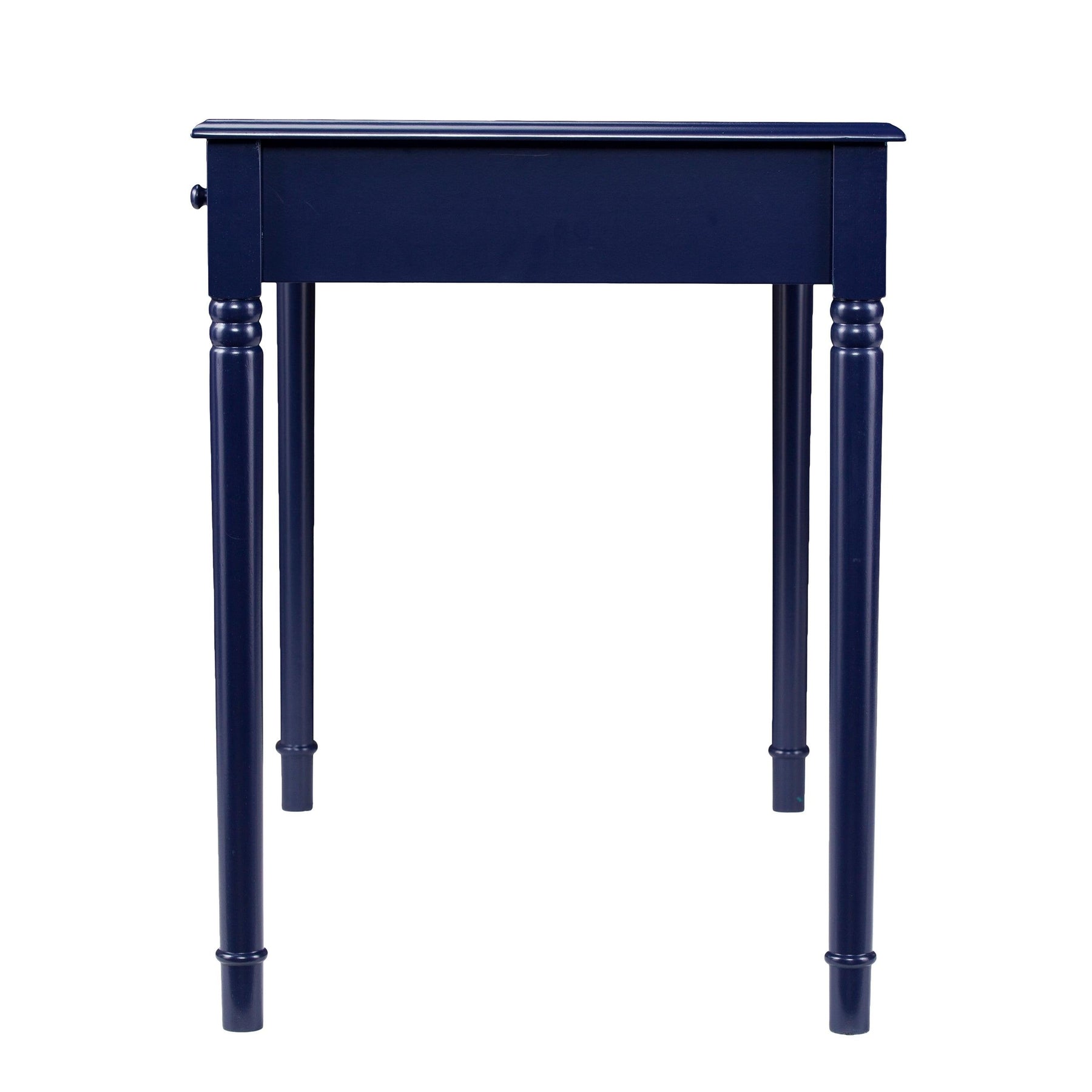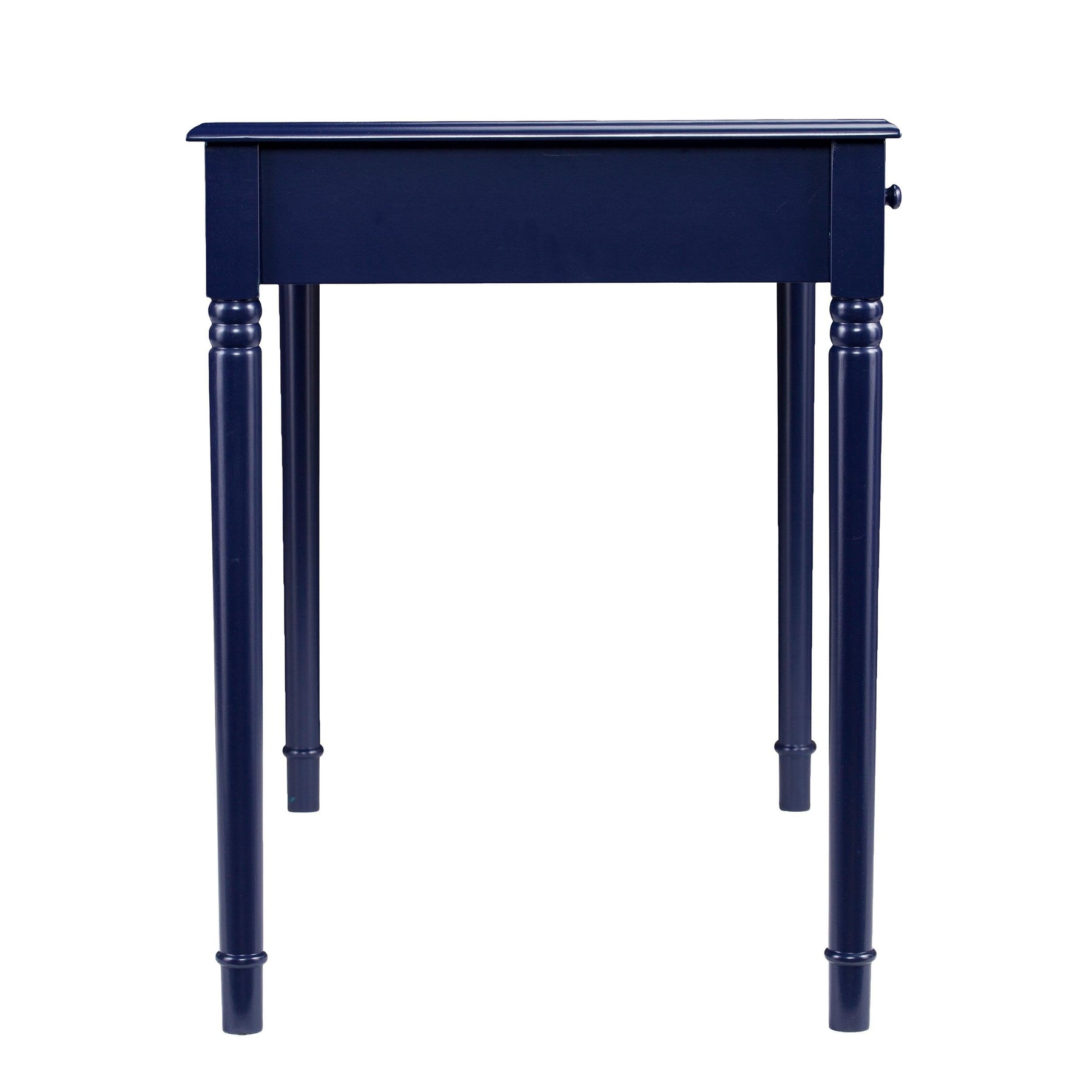 Study in style with this colorful soft country desk. Bold blue hue puts a primary twist on the farmhouse look. Traditional turned legs and simple, fully finished silhouette work well in any room. Deep drawers tidy your office accessories, craft supplies, or even recipes and flatware; spacious desktop provides ample workspace for writing, drafting, or a small kitchen appliance station. Ace feng shui with this easygoing desk in the home office, craft room, or eat-in kitchen.
