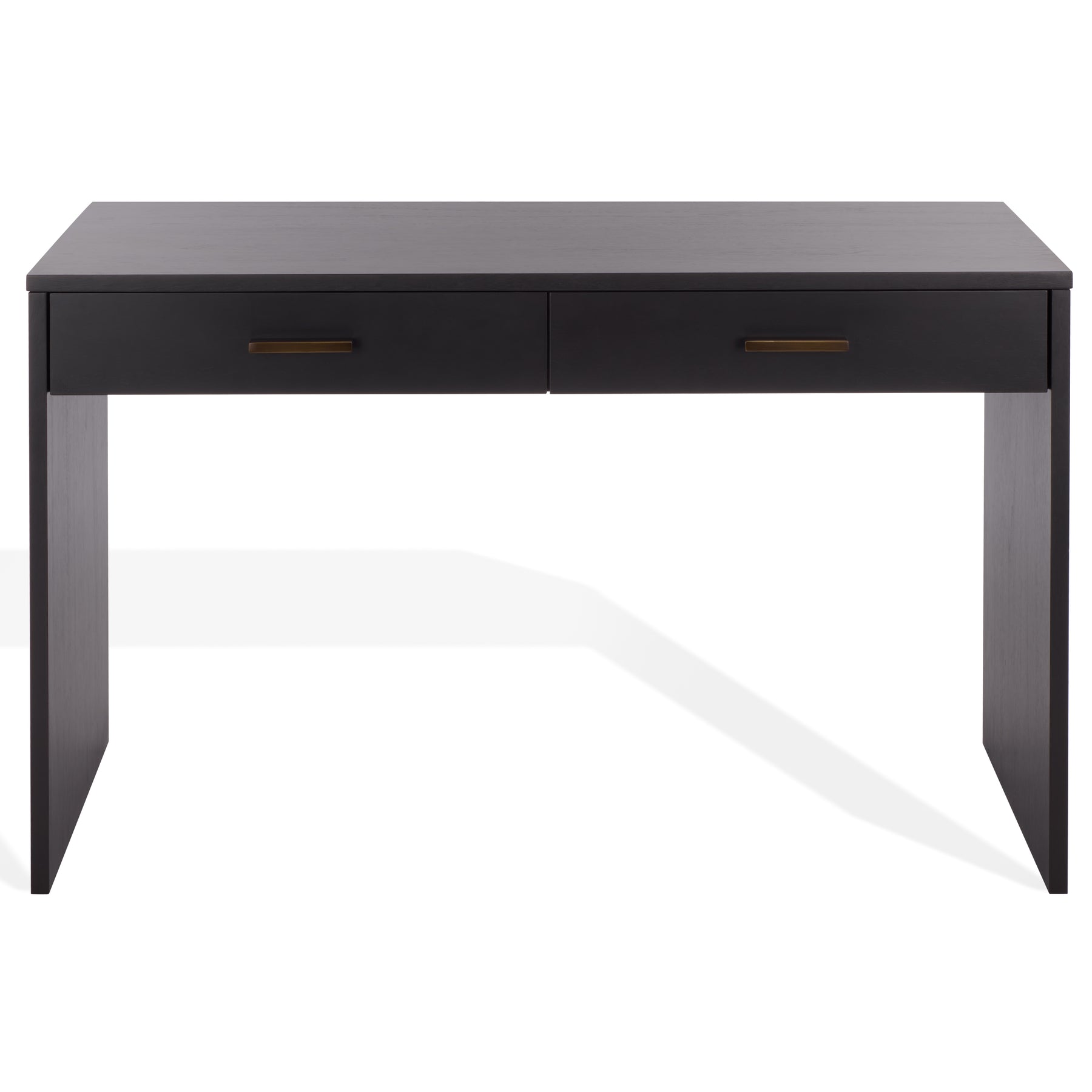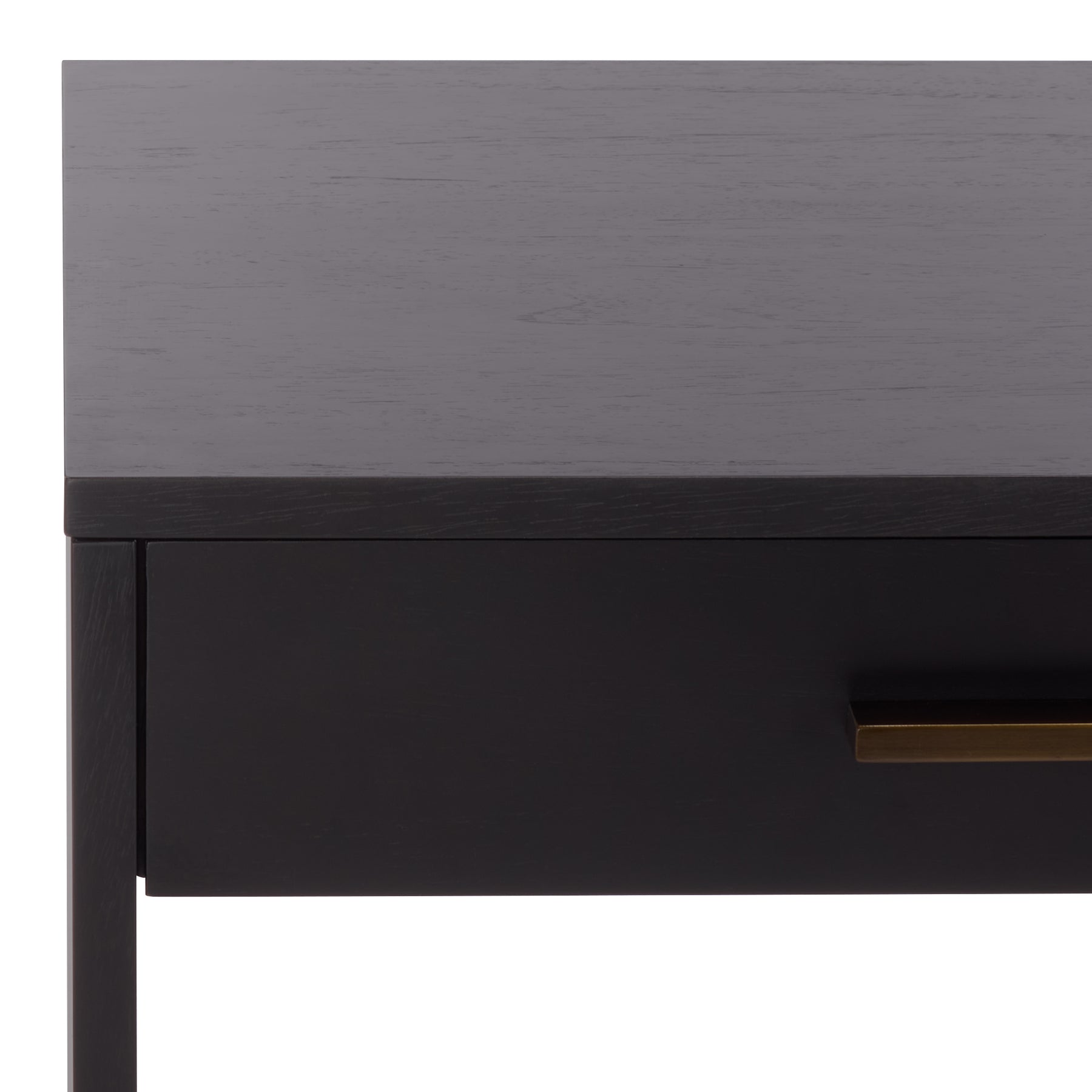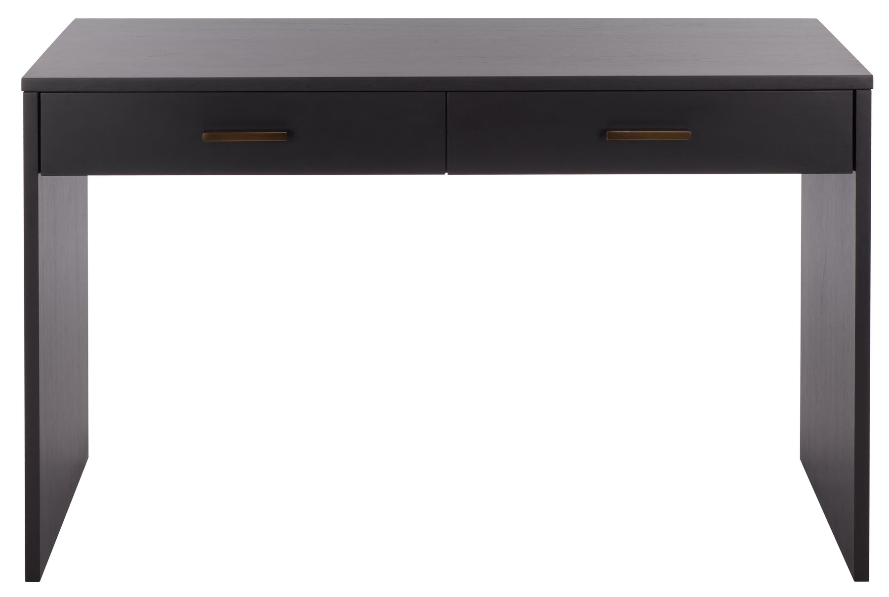 Introducing the Jessey 2 Drawer Wood Desk in Black and Brass, a synthesis of style and functionality that transforms any workspace. With its sleek black finish and striking brass accents, this desk brings a touch of elegance to your home or office. Designed with two spacious drawers, it provides ample storage for your essentials, helping you maintain an organized and clutter-free environment.