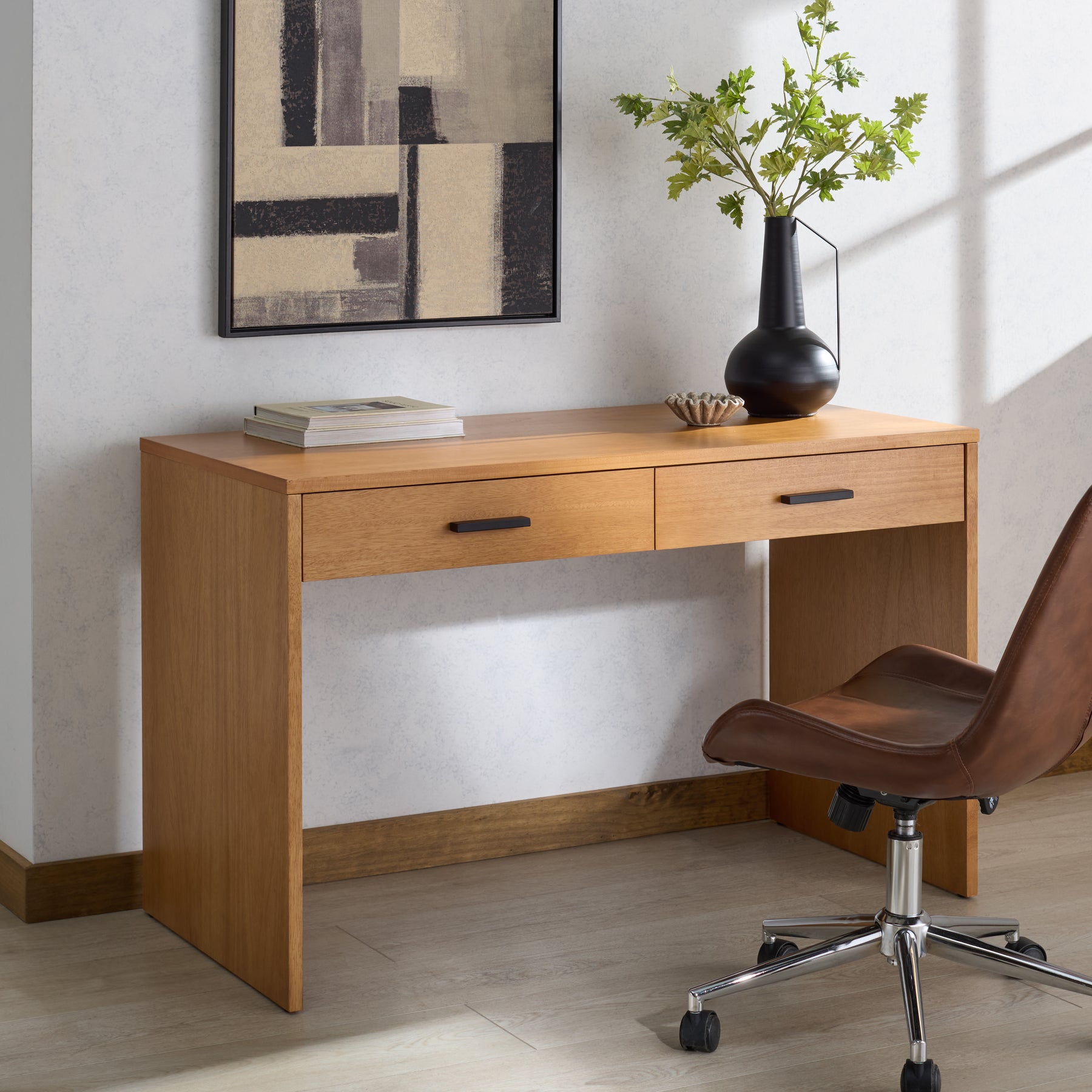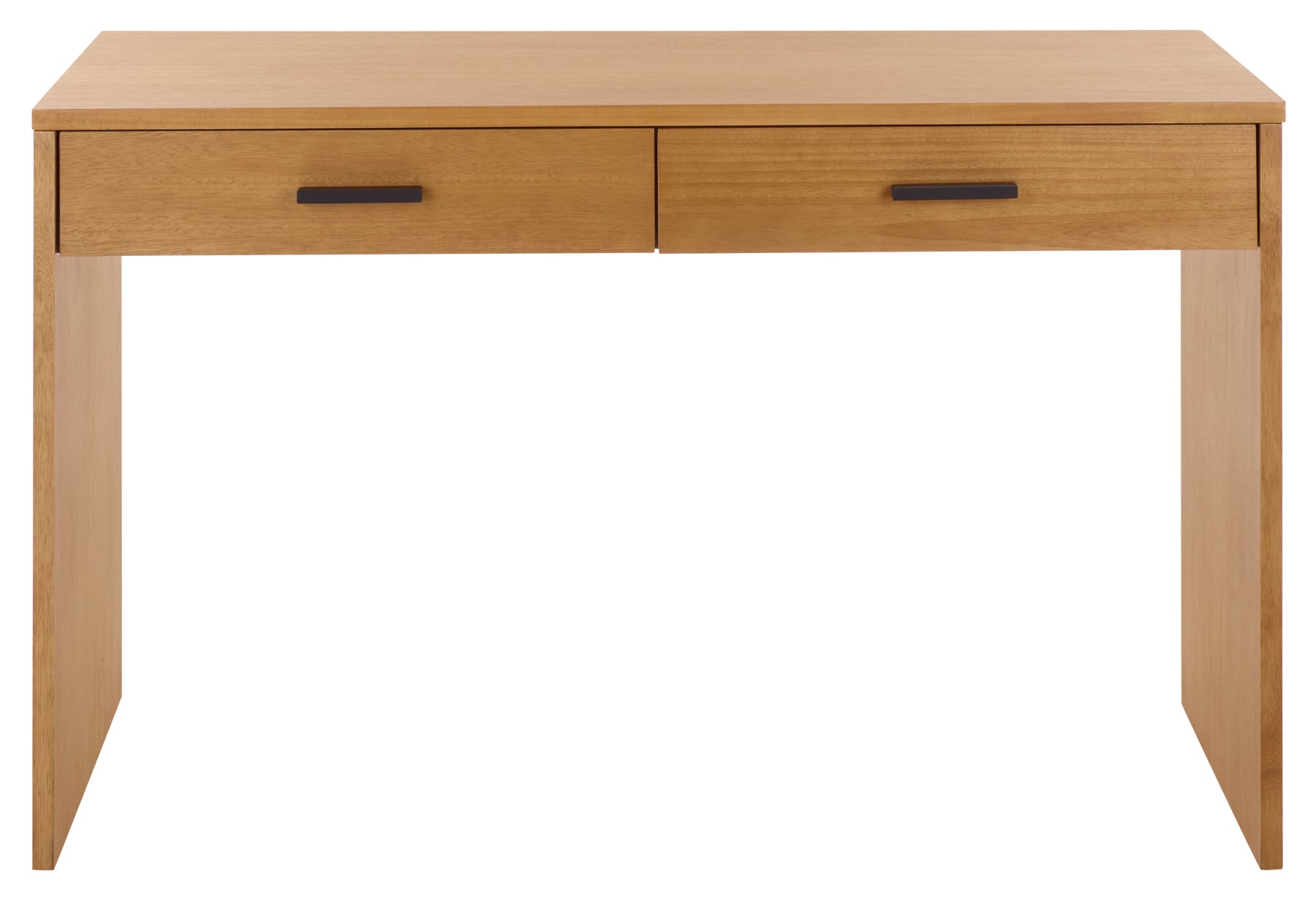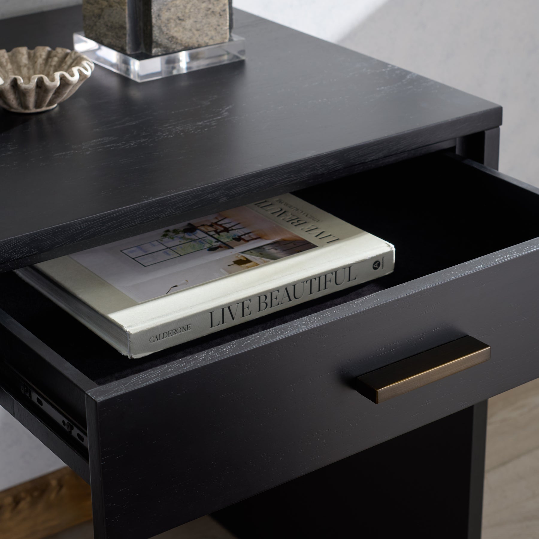 Introducing the Jessey 2 Drawer Wood Desk in Black and Brass, a synthesis of style and functionality that transforms any workspace. With its sleek black finish and striking brass accents, this desk brings a touch of elegance to your home or office. Designed with two spacious drawers, it provides ample storage for your essentials, helping you maintain an organized and clutter-free environment.