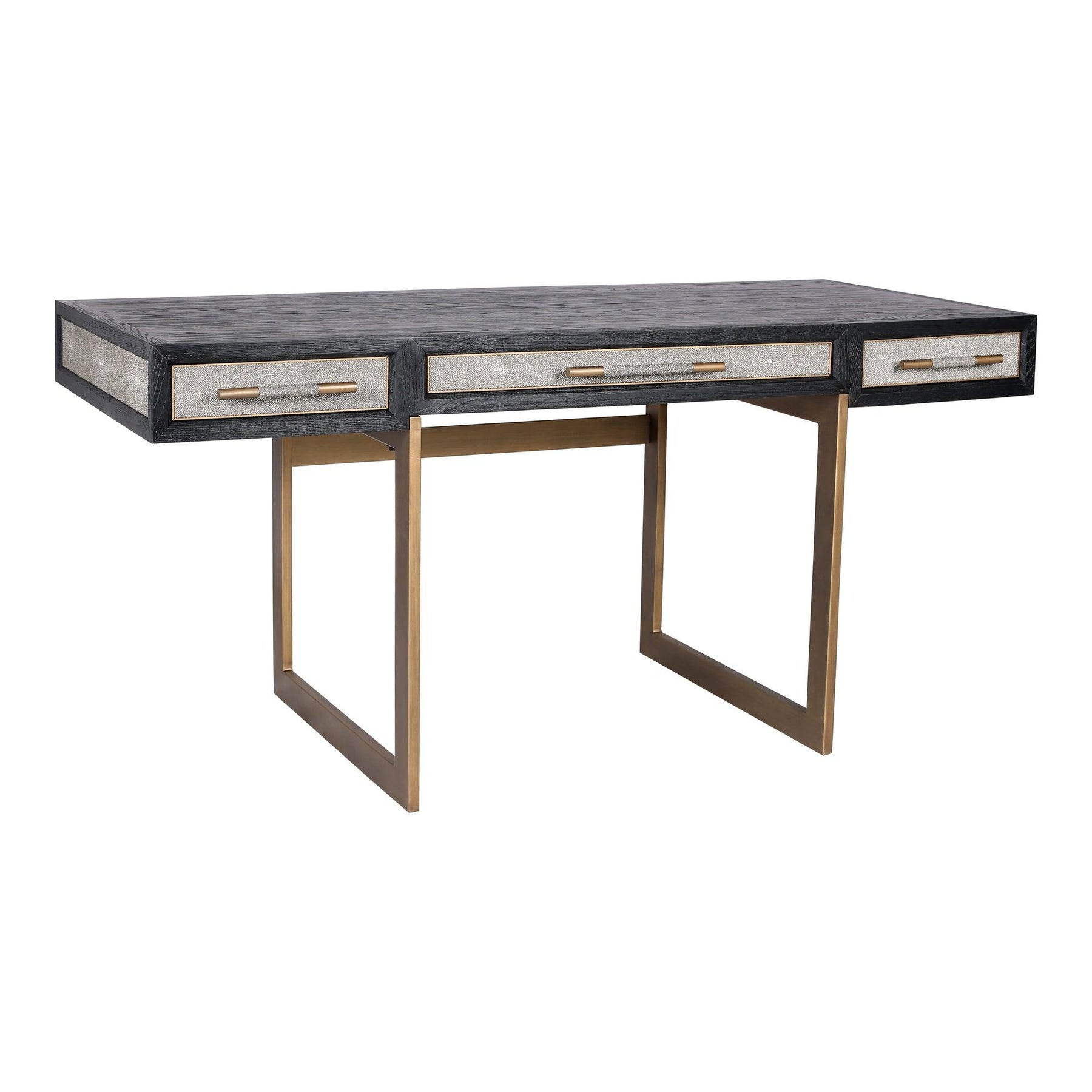 Feeling for the timeless glamor of art deco with a modern twist? Meet the Mako collection. With each item upholstered in the highest quality vegan leather shagreen, the Mako collection brings effortless style, visual texture and substance to your living space. With a three-drawer design and spacious tabletop, this desk offers an elemental chic to any office or living space. An elegant and minimalistic icon, the Mako desk will have you counting down the hours till you can get back to work.