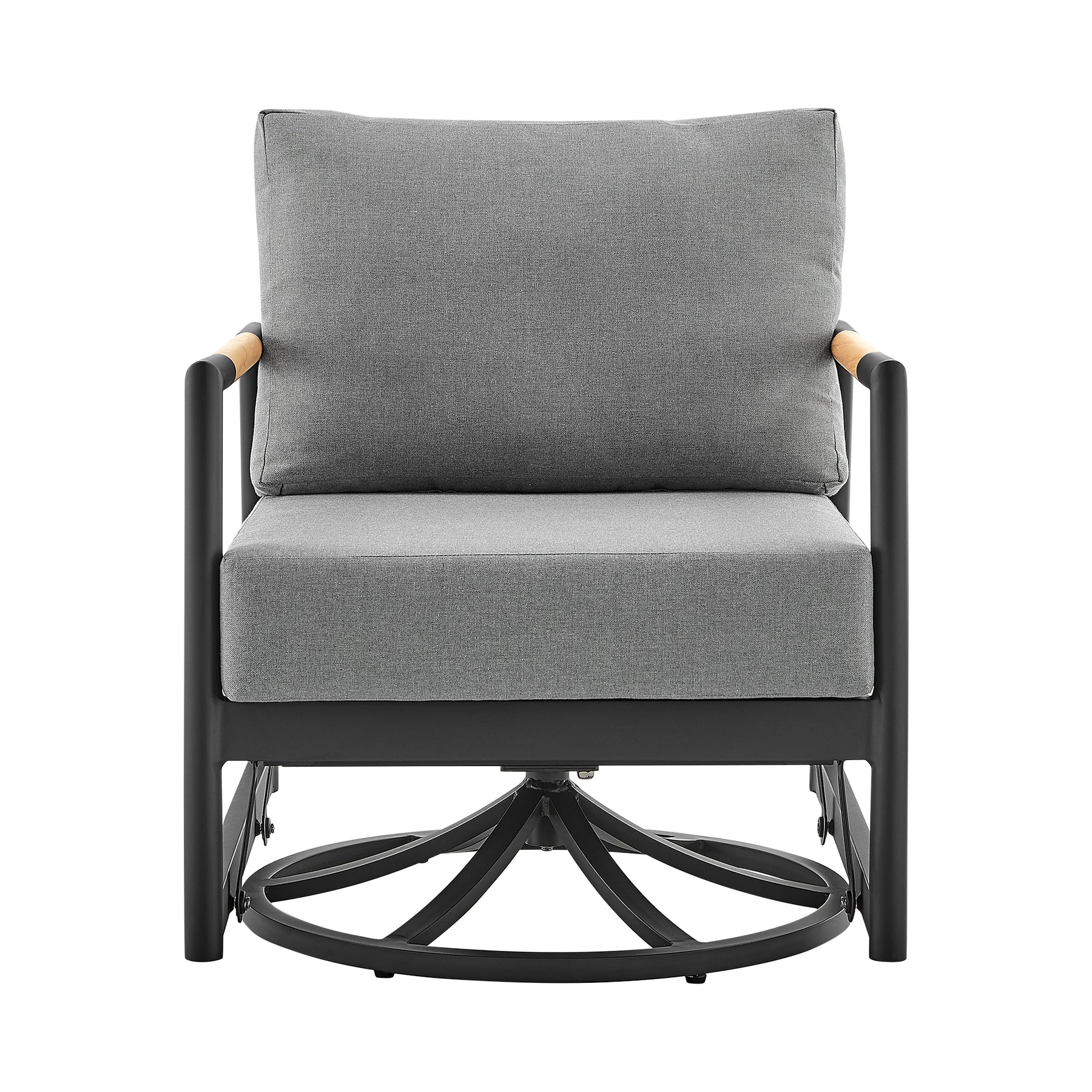 The Royal Outdoor Patio Swivel Glider Lounge Chair in Black Aluminum and Teak Wood with Cushions combines comfort and convenience. This outdoor gliding chair features durable and lightweight aluminum frame complete with warm teak accents on the arms. This combination is timeless, and its modern look is sure to please for many seasons and years to come. The UV and water-resistant cushions are ideal for any home and conveniently feature a zipper closure, making clean up a breeze. Moisture and water are an ongoing concern for outdoor furniture. Even if your furniture stays out of the rain, condensation is likely going to build up on the furniture regularly. Polyester is not permeated easily by water. Secondly, polyester resists the types of molds and mildews that will take root in fabrics made of natural fibers. This means the furniture will have a longer life if it is made from polyester. Minimal maintenance is required for the aluminum frame. Often, using a typical garden hose to rinse off the patio furniture will do. For more stubborn residue, a little warm water and soap will usually suffice. Besides cleaning occasionally, there is no other upkeep. The 360-degree swivel functionality and gliding motion give you the ideal seating experience. The Royal outdoor lounge chair is available in a black aluminum finish with natural teak accents and gray cushions.
