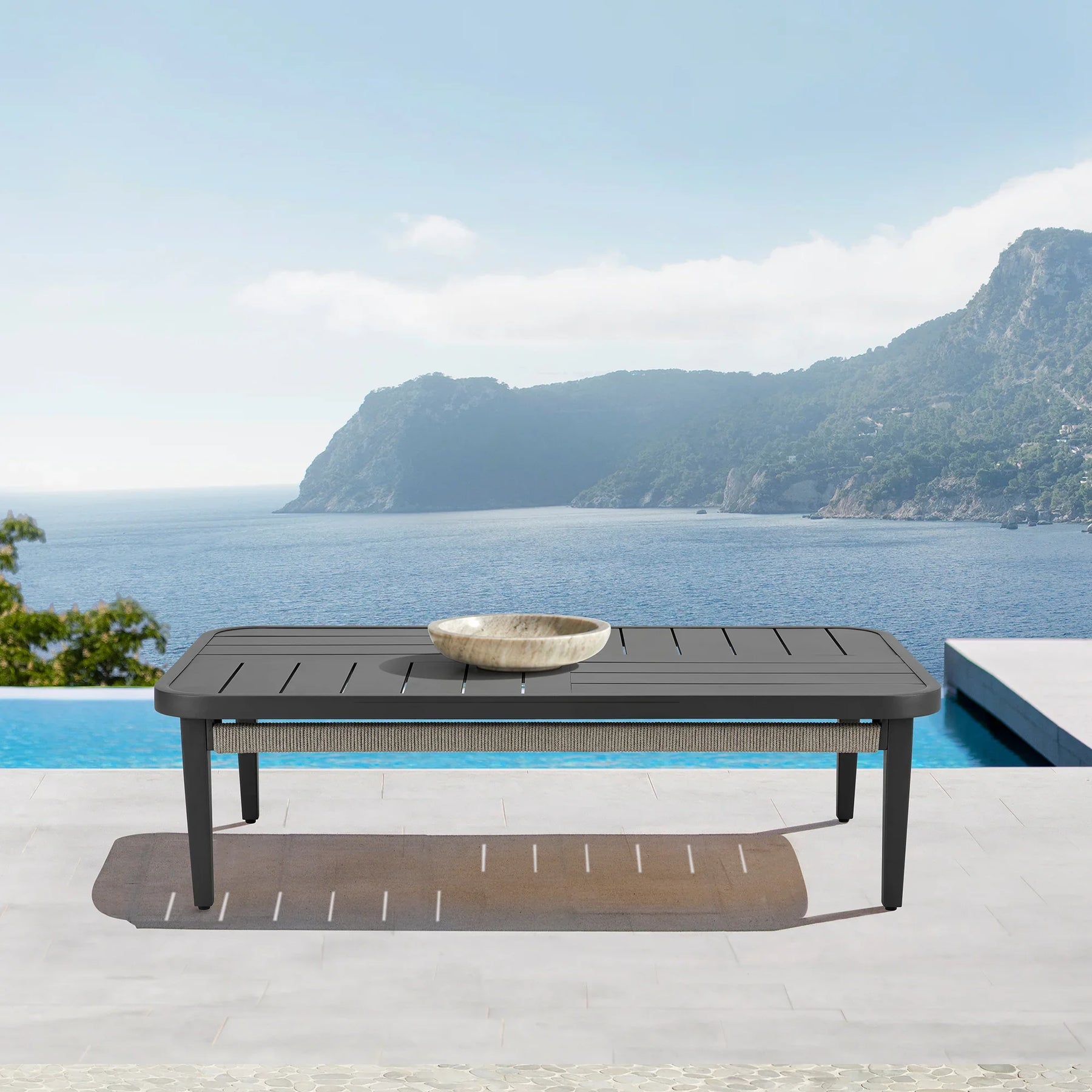 Introducing the Zella Rectangular Coffee Table – a contemporary masterpiece meticulously crafted to elevate your outdoor living space. This outdoor coffee table seamlessly marries the sleek appeal of aluminum with a refined charcoal finish and the tactile elegance of light gray rope detailing, creating a stylish and enduring addition to your patio ensemble. Crafted with precision, the Zella Rectangular Coffee Table boasts a sturdy aluminum frame, ensuring durability and a modern aesthetic that effortlessly complements various outdoor settings. The charcoal finish adds a touch of sophistication, enhancing the table's visual allure and making it a versatile centerpiece for your patio furniture collection. Designed for outdoor durability, the Zella Coffee Table is equipped with water-resistant and UV-resistant features, making it a steadfast and stylish addition to your patio. Whether exposed to sunlight or unexpected rain, this coffee table remains a reliable and eye-catching focal point for your outdoor gatherings. The inclusion of light gray rope detailing adds unique dimension to the design, creating a captivating contrast with the smooth aluminum frame. This thoughtful detail not only introduces a modern touch but also provides a subtle texture that harmonizes with the overall aesthetic of your outdoor space. The Zella Rectangular Coffee Table is not just a stylish accent; it serves as a functional and inviting surface for your outdoor living needs. Whether you're enjoying a refreshing drink with friends or unwinding in the open air, this coffee table is designed to enhance your outdoor lounging experience.