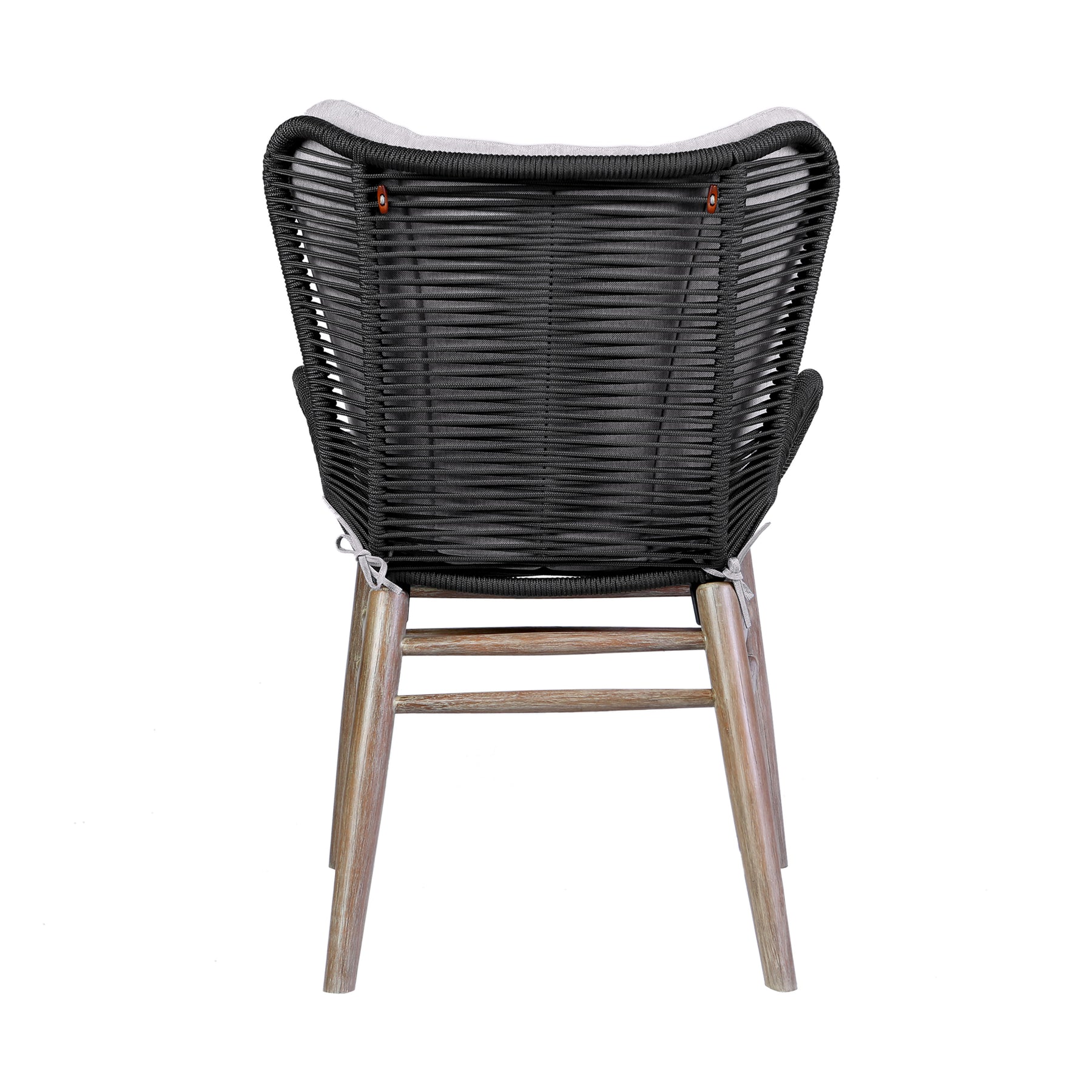 Embrace a comfy retreat with our Fanny outdoor dining chair in eucalyptus wood and rope. The dynamic and sculptural profile of the dining arm chair is accentuated with an elegant rope weave. The modern charm of the resilient and weather resistant rope harmoniously pairs with the architectural eucalyptus base. Featuring an elongated seat that seamlessly flows into the armrest and a gracefully curved back, our outdoor accent chair simply wraps you in comfort. Its expertly tailored cushioning follows the contours of the chair for an utterly comfortable stay. Moisture and water are ongoing concerns for outdoor furniture. Even if your furniture stays out of the rain, condensation is likely going to build up. Polyester is not permeated easily by water. Secondly, polyester resists the types of molds and mildews that will take root in fabrics made of natural fibers. This means the patio furniture will have a longer life if it features polyester upholstery. One of the best reasons to choose Eucalyptus wood for your outdoor furniture or four-seasons porch is that it is exceptionally resistant to decay and rot. It naturally resists the influence of moisture because of the high oil content it naturally contains. That means it can get damp without you worrying about whether damage will occur. It can withstand several different outdoor elements while lasting for many years if it receives proper care. The Fanny outdoor dining chair is perfect for your porch, backyard, patio, or indoor space! This patio chair is available with a natural eucalyptus wood finish, gray cushion, and your choice of charcoal or truffle gray rope.