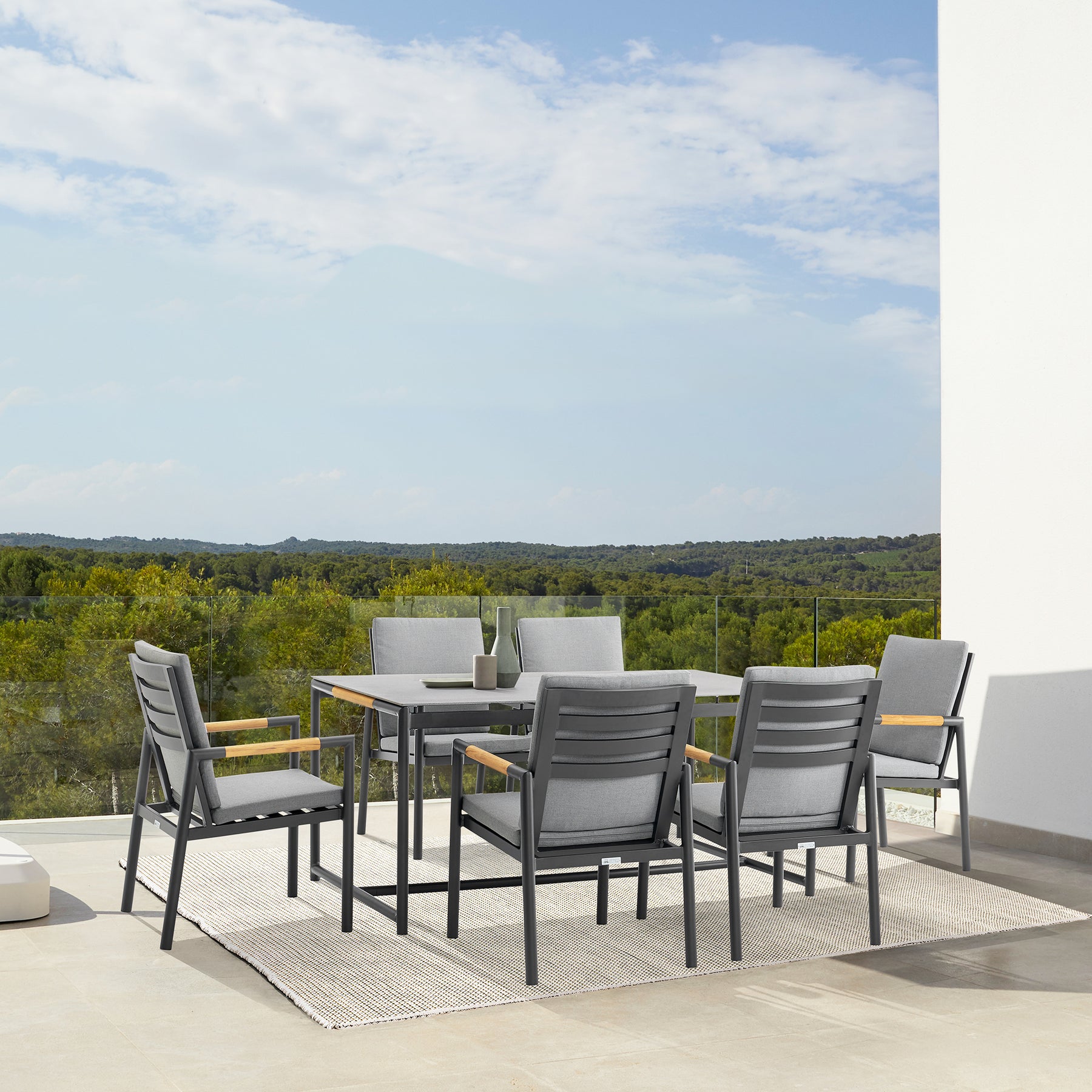 The Royal black aluminum and natural teak outdoor dining chair with dark gray fabric features a chic durable and lightweight aluminum frame complete with warm teak accents on the arms. The Royal outdoor dining chairs come in a and are available in your choice of a black frame with dark gray cushions or a white frame with light gray cushions. The UV and water-resistant cushions are ideal for any home and conveniently feature a zipper closure, making clean up a breeze. This combination is timeless, and its modern look is sure to please for many seasons and years to come.