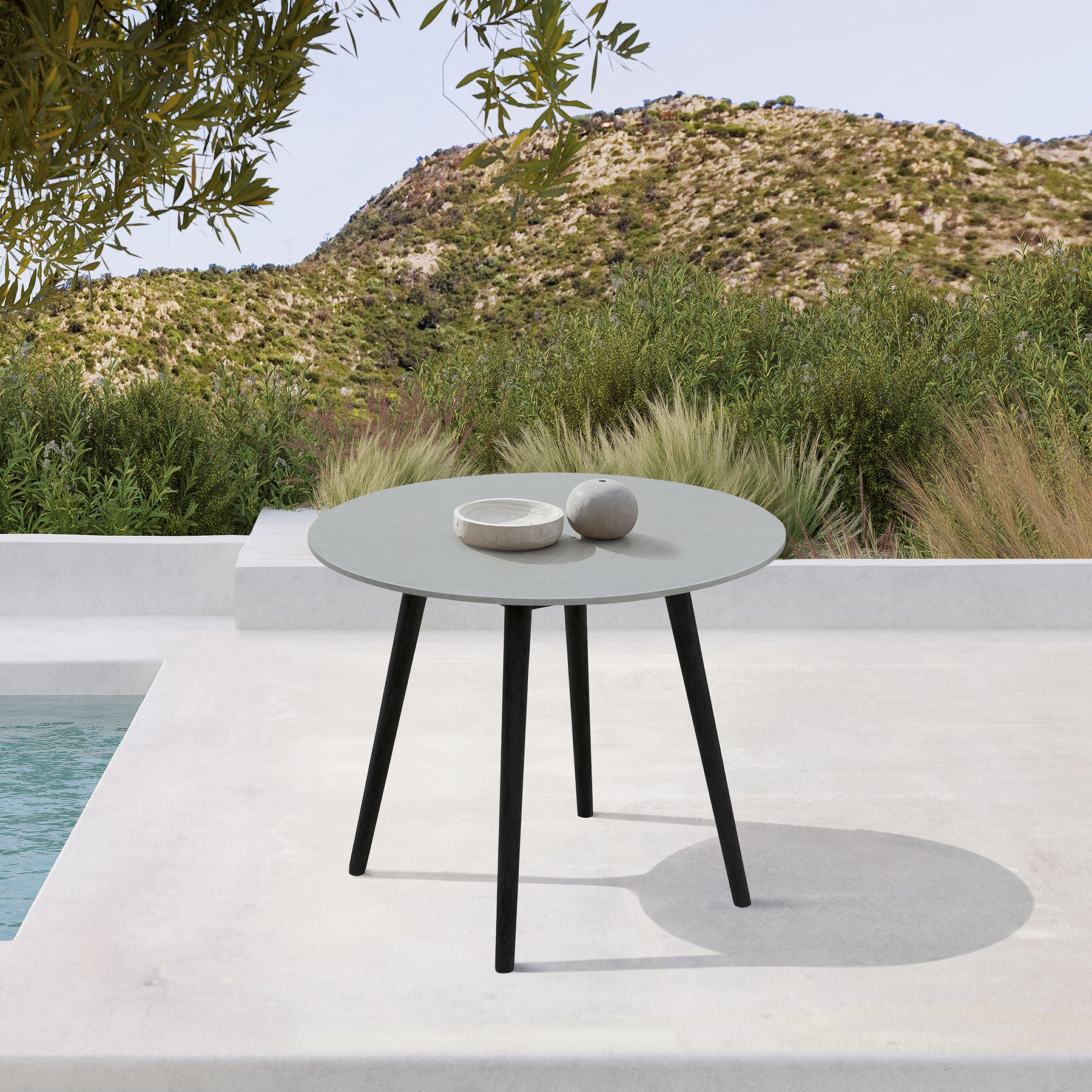 Dine alfresco with friends and family by gathering around the Sydney outdoor round dining table from Armen Living. Constructed from eucalyptus wood and a gray super stone top, this table is a modern addition that easily fits into any space. This patio dining table features sleek tapered wood legs that allow for ample leg room. One of the best reasons to choose Eucalyptus wood for your outdoor furniture or four-seasons porch is that it is exceptionally resistant to decay and rot. It naturally resists the influence of moisture because of the high oil content it naturally contains. That means it can get damp without you worrying about whether damage will occur. It can withstand several different outdoor elements while lasting for many years if it receives proper care. Defined by functional simplicity and timeless beauty, the dining table delivers a harmony of natural textures to complement any outdoor space. The stone top features a 5-layer composite with 2 layers of cement fiberboard surrounding the aluminum honeycomb core. This beautiful tabletop is durable and robust - capable of withstanding inclement weather and everyday wear and tear. This outdoor dining table is available with a black finish on its eucalyptus wood base and a 36 inch diameter gray super stone top. The Sydney patio dining table can seat up to 4 guests and remains perfect for entertaining in your patio, backyard, or balcony.