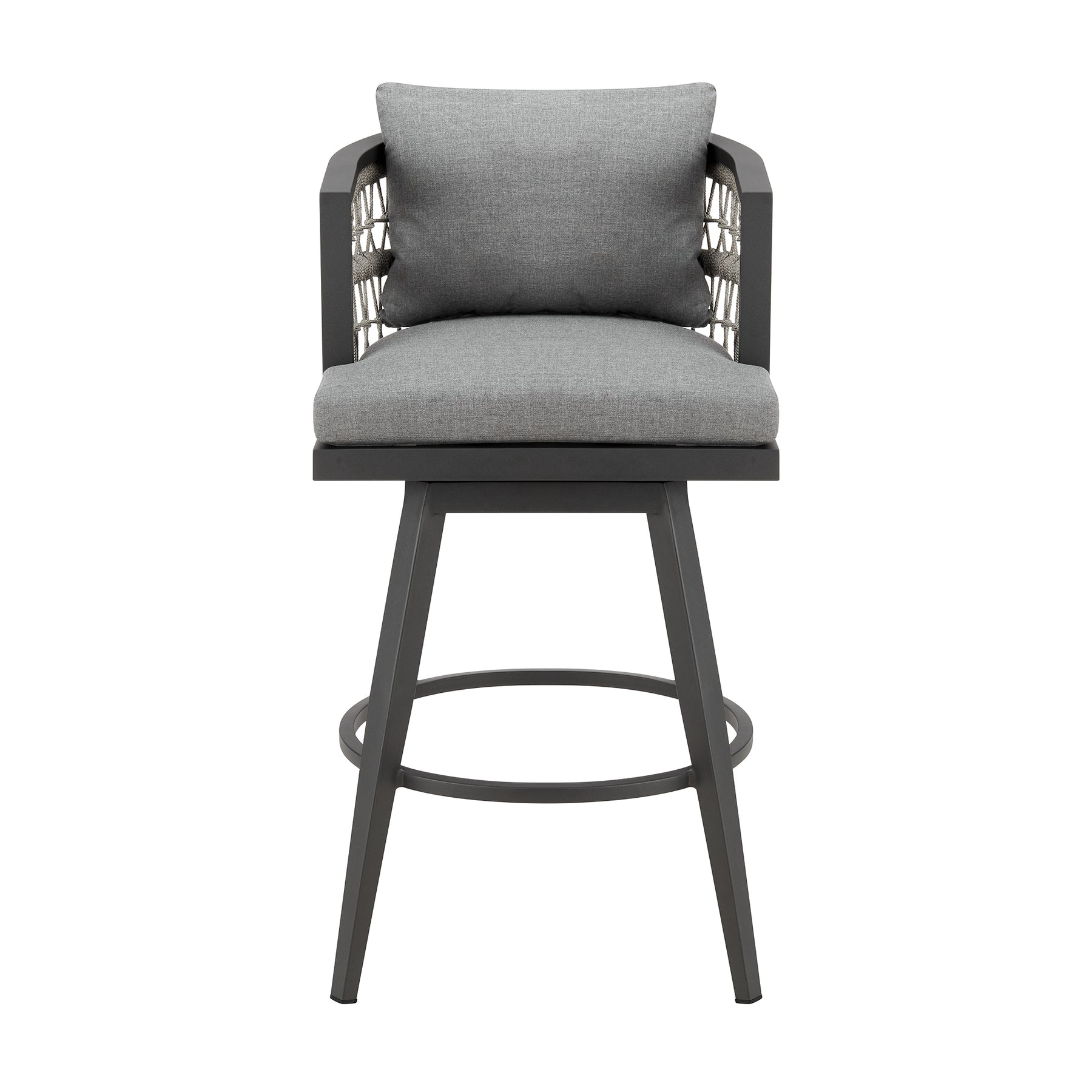Introducing the Zella Outdoor Patio Swivel Bar or Counter Stool – a pinnacle of modern design and outdoor functionality meticulously crafted to enhance your experience. This versatile stool seamlessly marries the contemporary allure of aluminum with the tactile elegance of rope detailing and the luxurious comfort of removable cushions, creating a sophisticated and enduring piece of outdoor furniture. Crafted with precision, the Zella Outdoor Patio Swivel Stool features a robust aluminum frame, ensuring durability and a sleek aesthetic that effortlessly complements various outdoor settings. Available in both 26-inch and 30-inch heights, this stool caters to both bar and counter heights, offering versatility to meet your specific needs. The water-resistant and UV-resistant features of the Zella Stool make it a resilient choice for your outdoor space. Whether bathed in sunlight or facing unexpected rain, this stool stands as a steadfast and stylish seating solution for your patio or outdoor bar area. The incorporation of rope detailing adds a distinctive tactile dimension to the design, creating a visually appealing contrast with the smooth aluminum frame. Paired with removable cushions, the Zella Swivel Stool invites you to relax in both style and comfort, providing a luxurious seating option for your outdoor gatherings. Whether you're enjoying a refreshing drink at the bar or a casual meal at the counter, the swivel feature of the Zella Stool enhances mobility, allowing you to effortlessly engage with your surroundings. Elevate your outdoor entertaining experience with the Zella Outdoor Patio Swivel Bar or Counter Stool in Aluminum. Invest in quality outdoor furniture that seamlessly blends modern aesthetics with functional design, and choose the Zella Swivel Stool – where contemporary elegance meets the demands of modern outdoor living.
