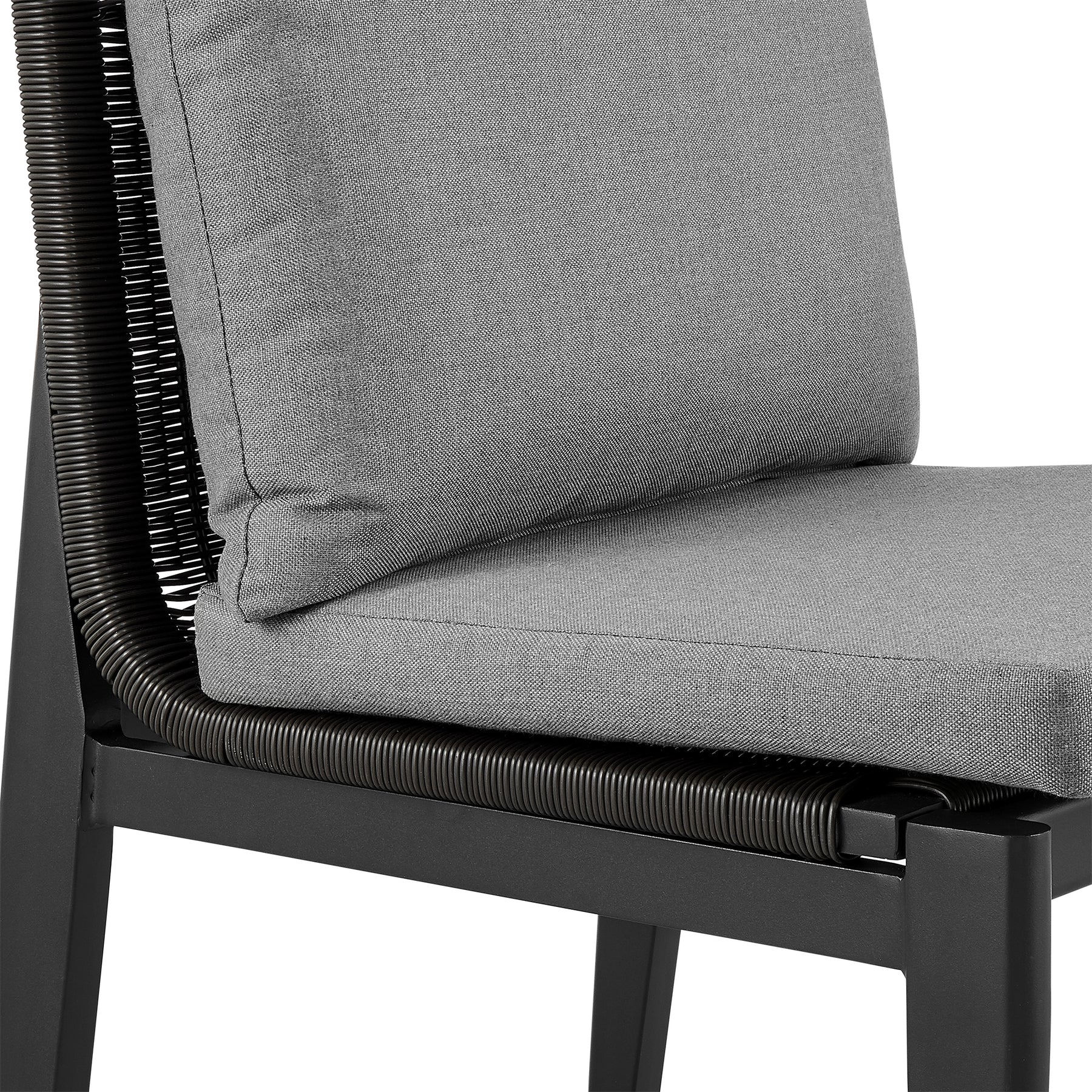 Bring modern elegance to your outdoor space with the Cayman outdoor dining chairs – from Armen Living. Featuring a gracefully curved hand-woven rattan back, the outdoor chairs vouch for a sleek and inviting design while offering ergonomic properties to keep your back properly aligned. These metal and wicker patio furniture pieces include plush dark gray high-density foam cushions to offer a wonderfully comfortable sitting experience. The cushions feature a zipper closure that allows for easy removal and cleaning, making these a convenient outdoor furniture addition! It vouches for a breezy and comfortable look, allowing you to dine in and relax outdoors. Made up of lightweight and durable aluminum framework, the Cayman dining chairs are the ideal piece of outdoor patio furniture. They are easily portable and feature a multi-layer powder coating for further effective protection from the elements and everyday wear and tear. This is a perfect piece to use indoors and is treated to withstand being outdoors. Without having to worry about UV, rust, or weather damage, the Cayman outdoor patio dining chairs are ideal for your home, regardless of your location. The armless design is convenient and allows you to move your seat as close as needed to any surface. The Cayman outdoor chairs with cushions are sold as a and feature a beautiful black powder coat finish and dark gray cushions. With a 19-inch seat height, the Cayman chairs can support up to 250lbs per seat.