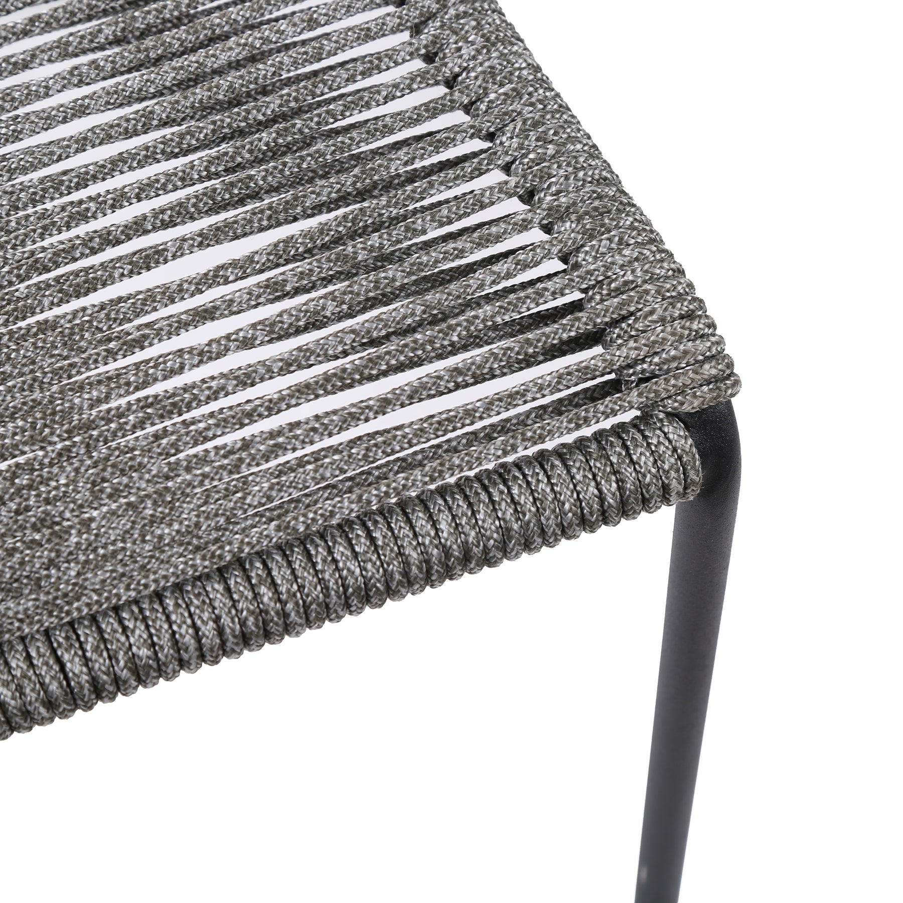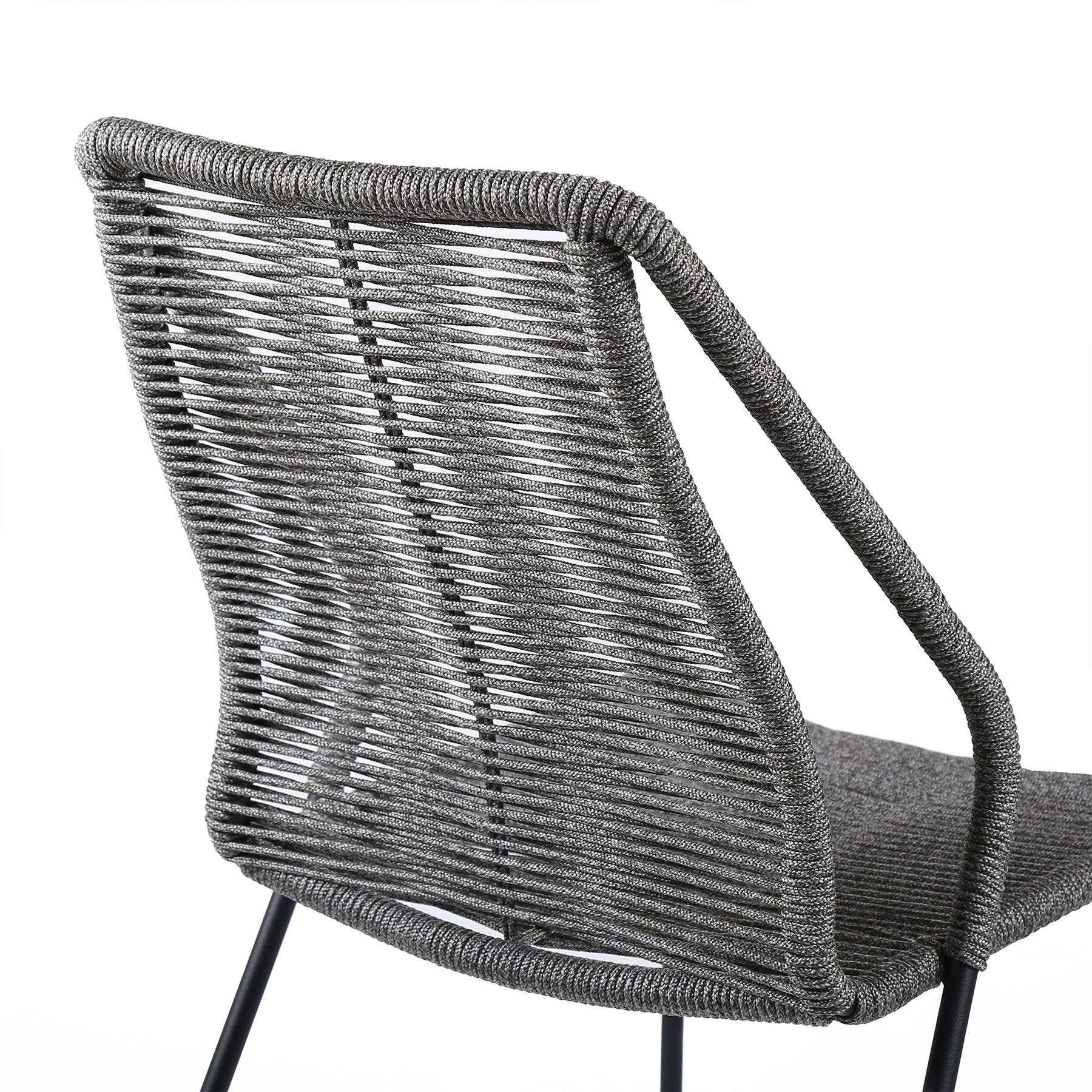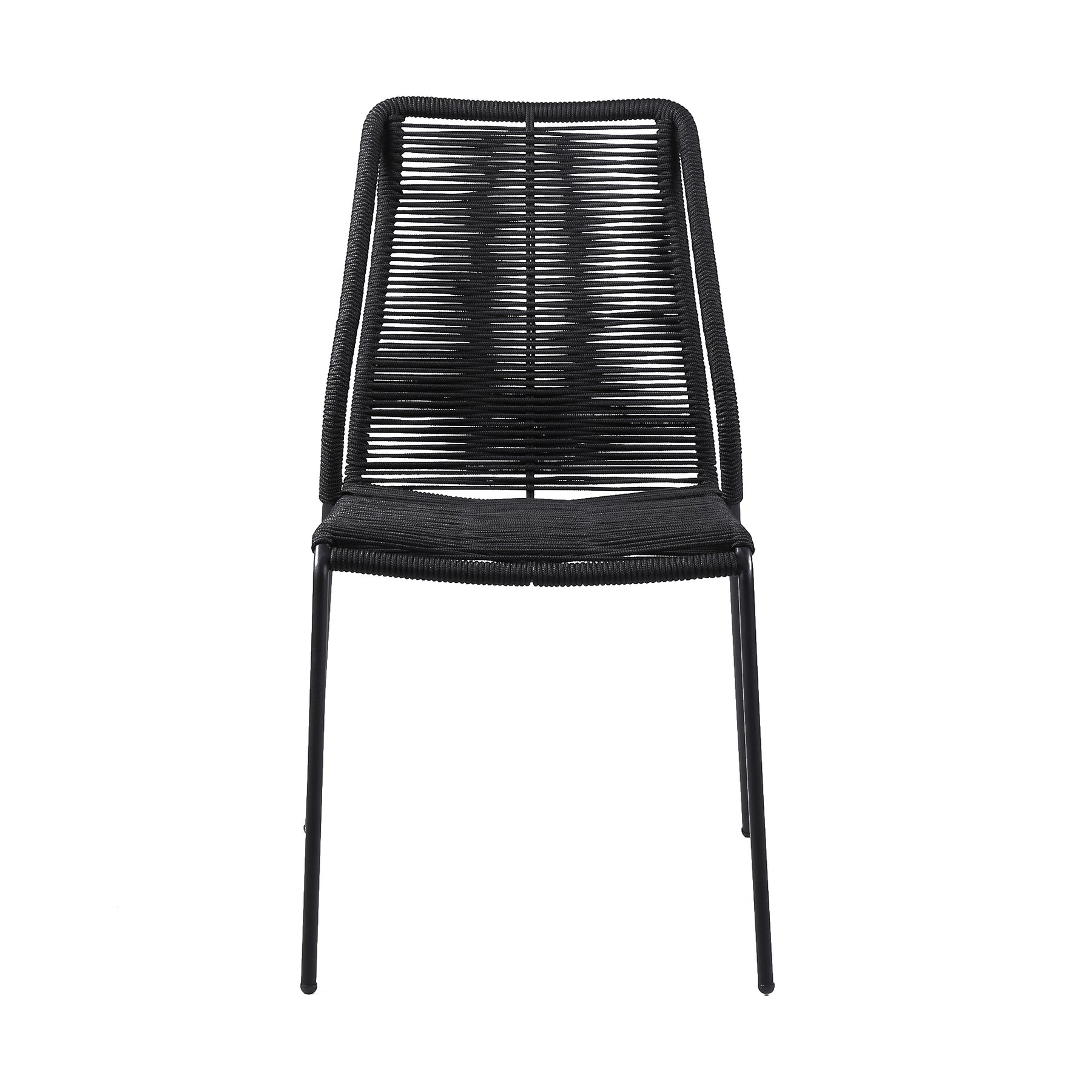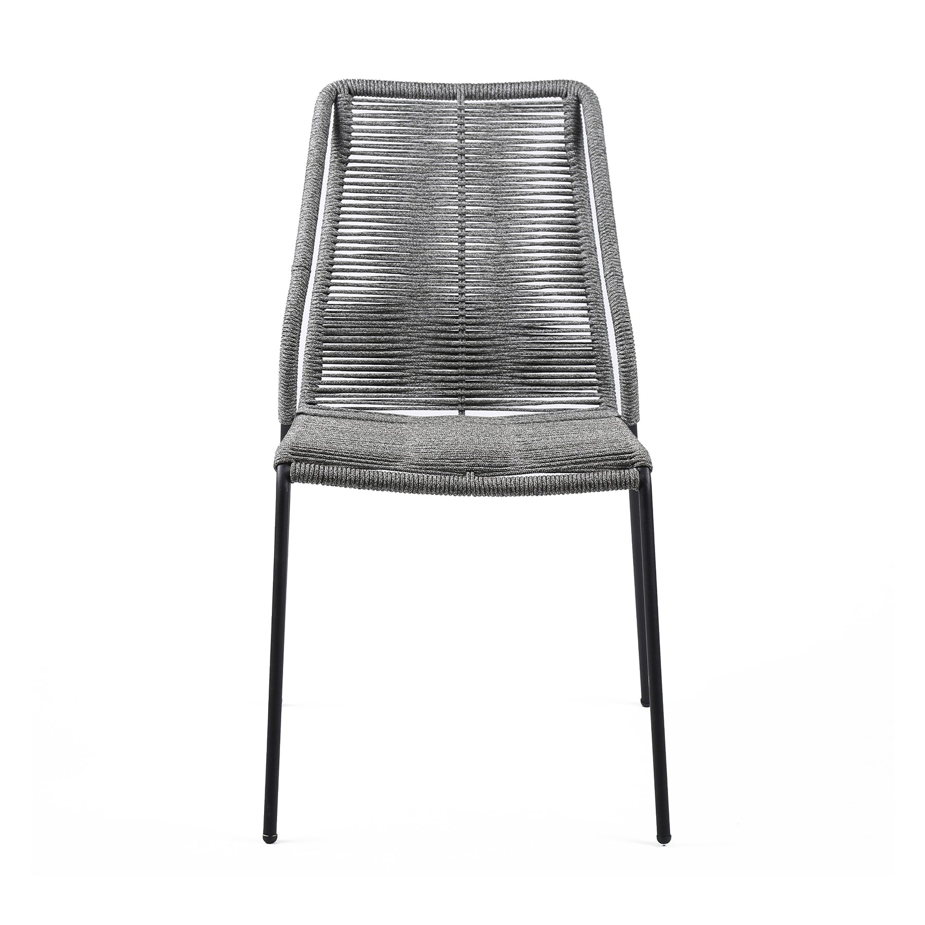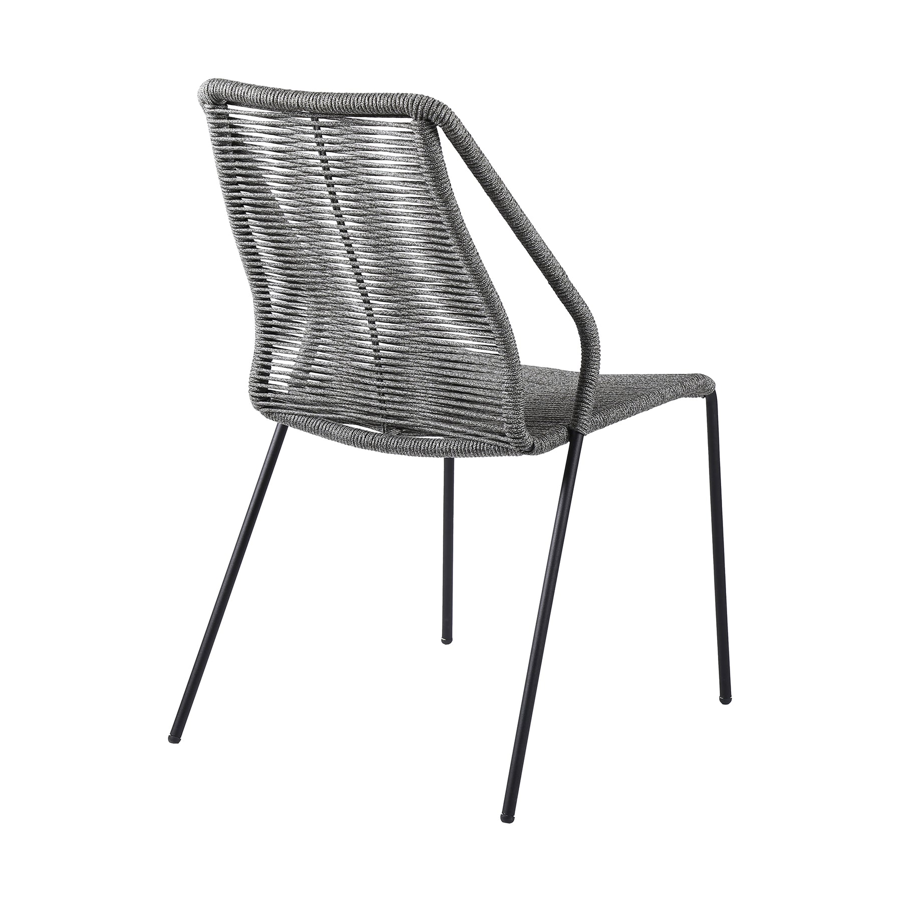 The Clip Indoor Outdoor Steel Dining Chair with Black Rope - from Armen Living are the epitome of comfort and dependability. The Clip outdoor dining chairs come in a set of two - perfect for mixing and matching to create your ideal preferred outdoor atmosphere. The intricately woven rope featured on the durable metal frame form to offer you extreme comfort and relaxation. This outdoor chair is wrapped in resilient regatta rope cording, providing supple support while still allowing for element passthrough. - also enhancing your seating experience with a softness that rivals most fabrics. Each chair is made with the best craftsmanship, with these chairs standing on top of durable metal legs in a black finish for a modern look. For use indoors and out, the soft UV coated nylon cords are hand dyed resulting in subtle tonal variations. This classic midcentury chair, with a black powder-coated steel frame is available in your color choice of black, brick red, gray, or blue - choose your favorite to match your outdoor decor. The Clip chairs are sold as a pair and are stackable. Product Dimensions: 22"W x 25"D x 35"H SH: 18.6"