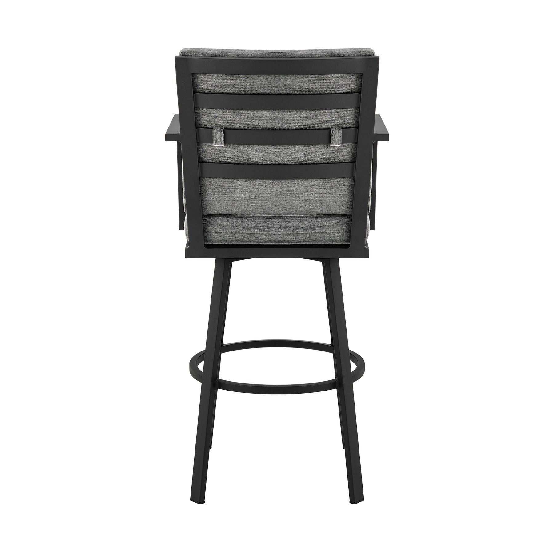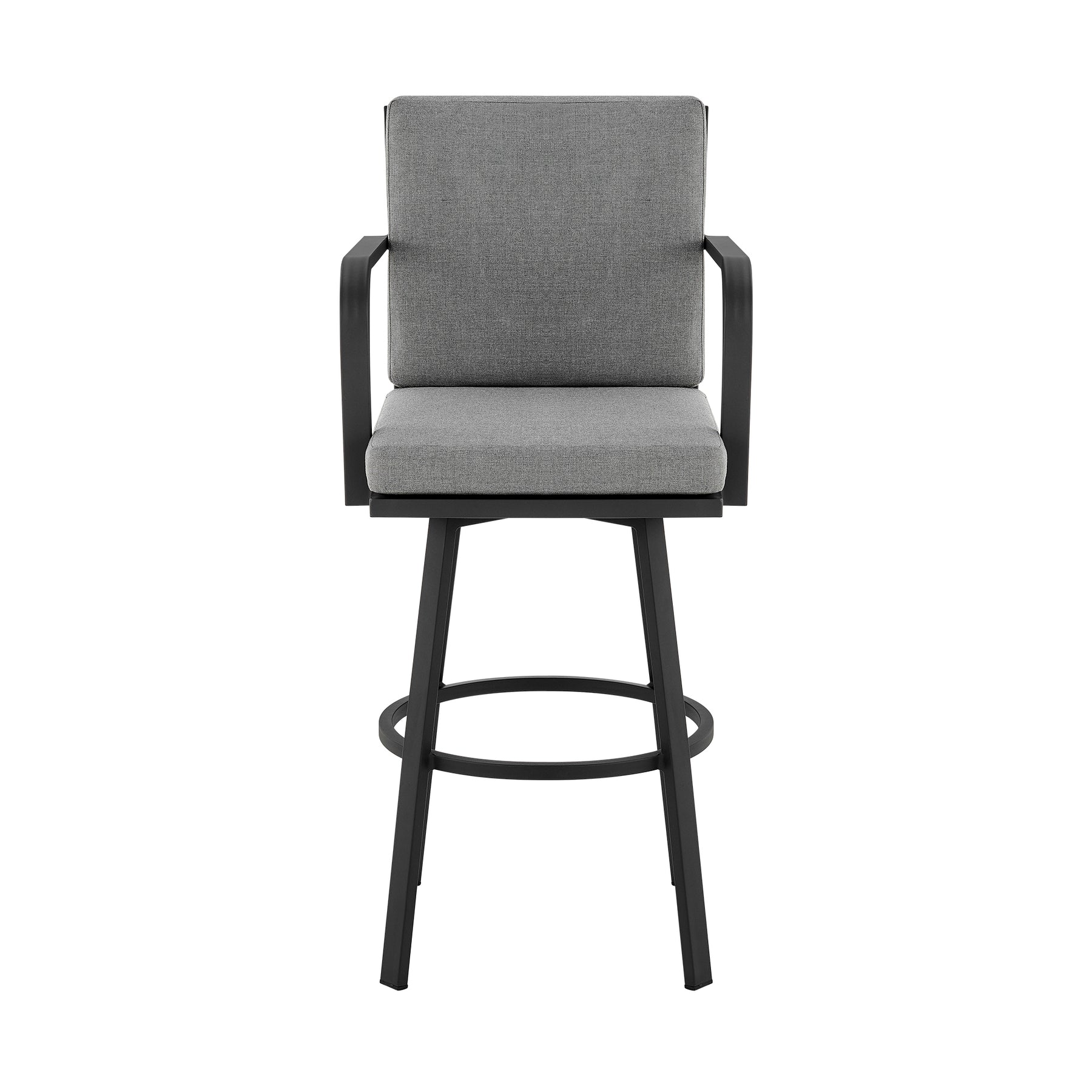Enjoy an outdoor happy hour, entertain, or dine alfresco with the Don Outdoor Patio Bar Stool in Aluminum with Cushions. This armed barstool is crafted from weather resistant materials that allow it to be used indoor or outdoor. The strong aluminum frame is resistant to rust and it’s 360-degree swivel functionality allows for optimal mobility. The Don features a sturdy 4 leg base and its ring footrest gives additional comfort for extended seating periods. The back and seat cushions are upholstered from polyester and have a convenient zipper closure that makes clean up a breeze! Polyester is strong, flexible and resists water damage and staining. It’s tear-resistant and dries quickly. Minimal maintenance is required for the stool frame. Often, using a typical garden hose to rinse off the patio furniture will do. For more stubborn residue, a little warm water and soap will usually suffice. The Don Outdoor Patio Bar Stool in Aluminum with Cushions is available in a black aluminum finish with grey cushions or a brown aluminum finish with brown cushions.