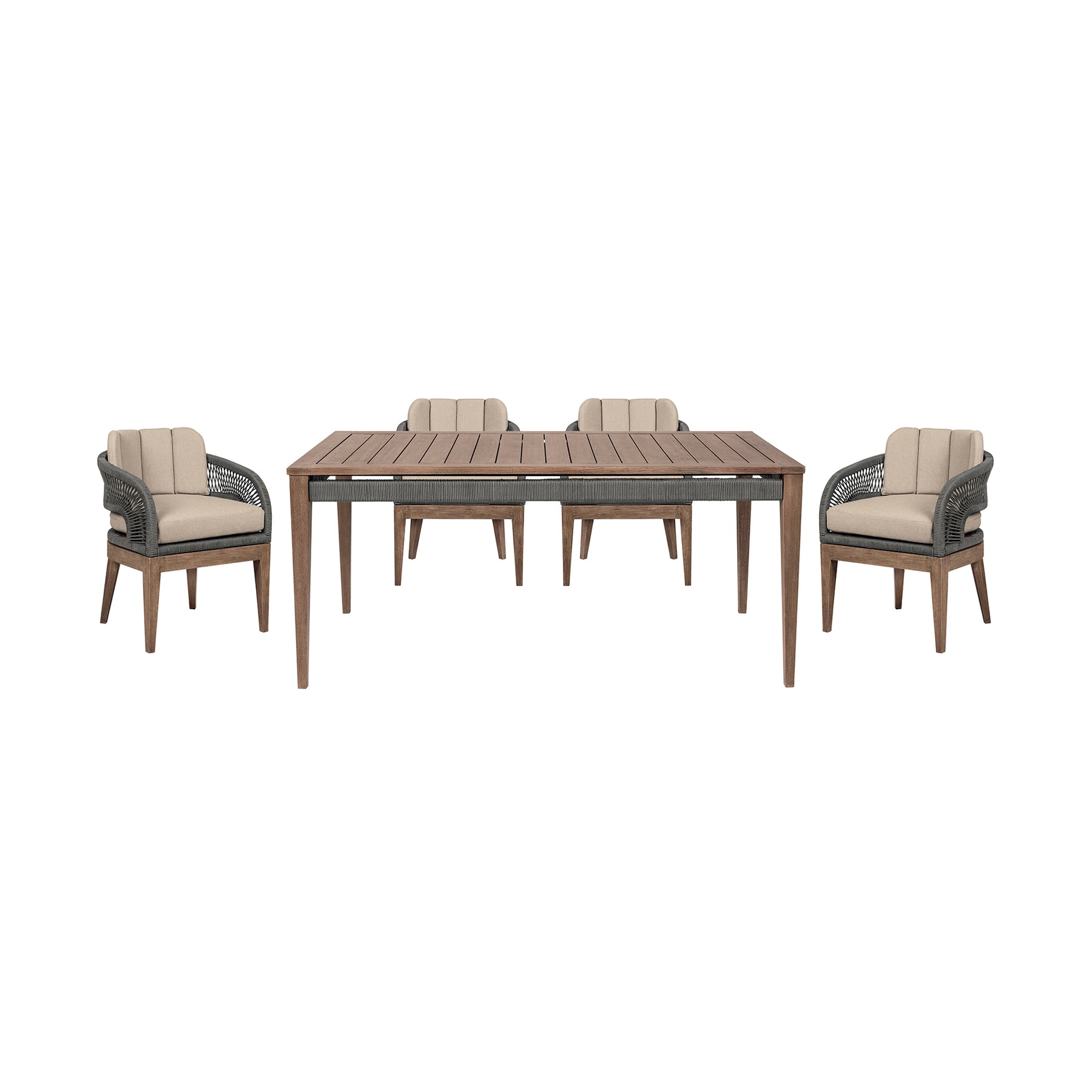 Meet the Orbit Outdoor Patio Dining Set - a seamless fusion of modern design and natural allure meticulously crafted to elevate your outdoor lounging experience. The weathered Eucalyptus wood frames of both the Orbit Dining Table and Dining Chair introduce a touch of rustic elegance, infusing your patio with character and warmth. Each knot and grain tells a story, creating an atmosphere of timeless charm that complements various outdoor settings. Designed to endure the elements, this dining set boasts water-resistant and UV-resistant properties, ensuring resilience and style in changing weather conditions. The Orbit Dining Table stands as a steadfast symbol of modern outdoor luxury, while the Dining Chair adds a contemporary flair with gray rope accents and plush Olefin cushions. The visually appealing contrast between the weathered Eucalyptus wood and modern elements creates a striking piece of outdoor furniture. Enjoy the perfect fusion of comfort and style with the Orbit Dining Set. The water-resistant capabilities and easily removable cushion covers make maintenance effortless, allowing you to revel in outdoor luxury with ease. Elevate your outdoor aesthetic with the Orbit Outdoor Patio Dining Set in Weathered Eucalyptus Wood and Taupe Fabric.