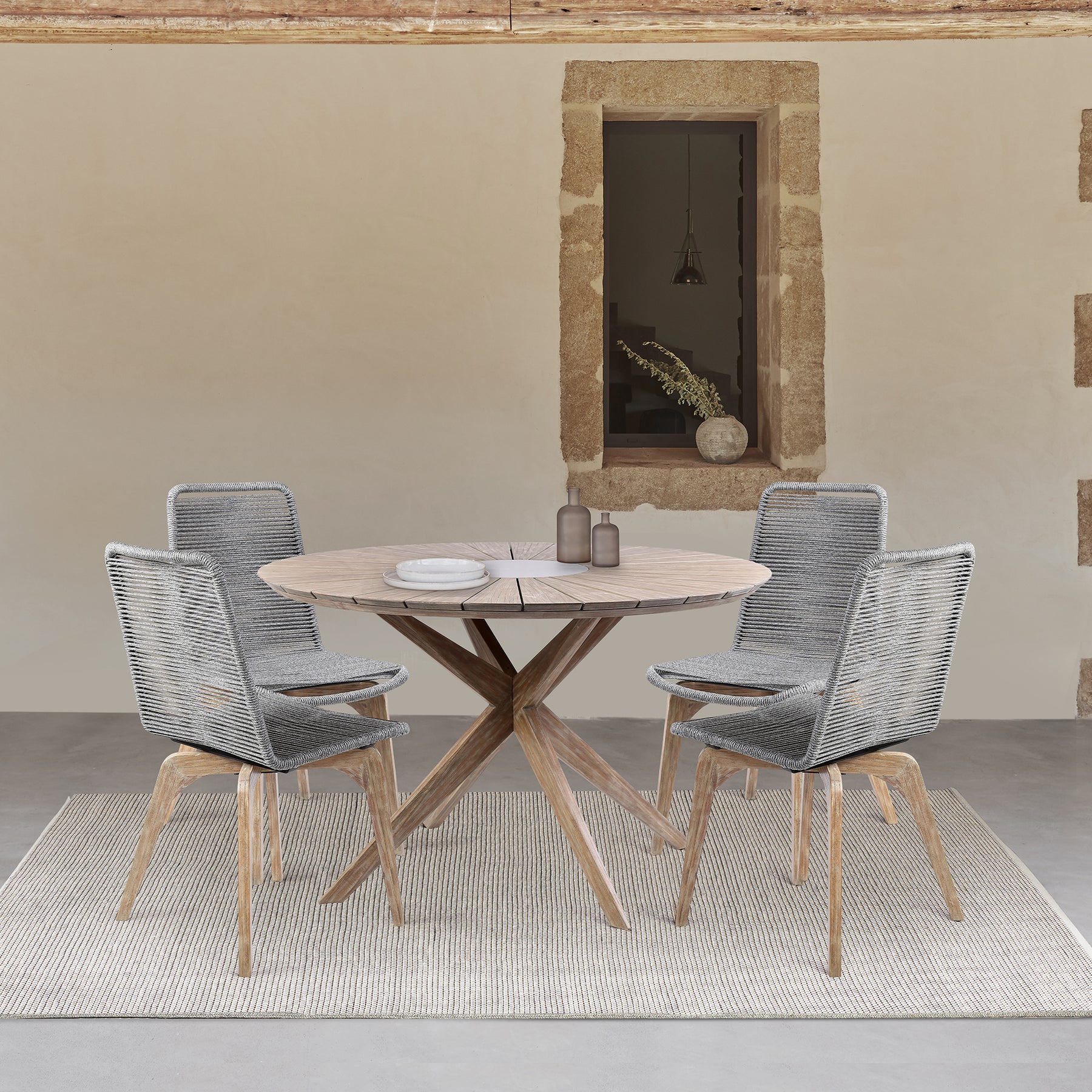 The Armen Living Sachi and Island 5 Piece Light Eucalyptus and Stone Outdoor Patio Dining Set is ideal for any outdoor space. Each individual table surface slat expands geometrically outward, while a super stone concrete center tastefully juxtaposes the rest of the table. Built from solid eucalyptus, the Sachi naturally repels moisture to keep the elements from affecting its resilient design. Below, crossed legs maximize leg space while maintaining a solid foundation for the table above. The Sachi table comes with 4 Island chairs, wrapped in resilient regatta rope cording, the seat and back provide a remarkable level of comfort while still allowing the elements to pass through. The beauty of this pairing lies in the subtle interplay of soft and neutral colors with a contemporary design structure. The Sachi and Island dining set is available in your choice of dark or light Eucalyptus.