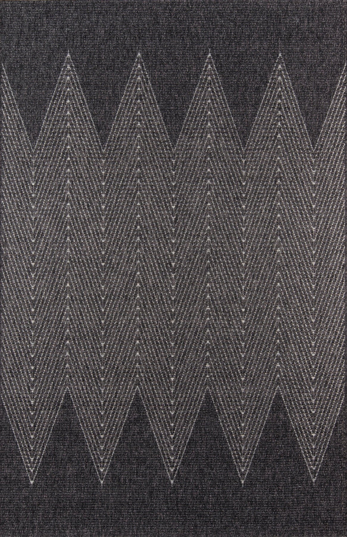 Primitive patterns meet Park Avenue aesthetic in the dramatic design of this indoor/outdoor area rug. The decorative rug is at once exotic and architectural with bold geometric lines that zigzag across the center of the black rug field. Precision made from polypropylene fibers, the all-weather rug is a stain-resistant floorcovering suitable for styling both interior and exterior environments.