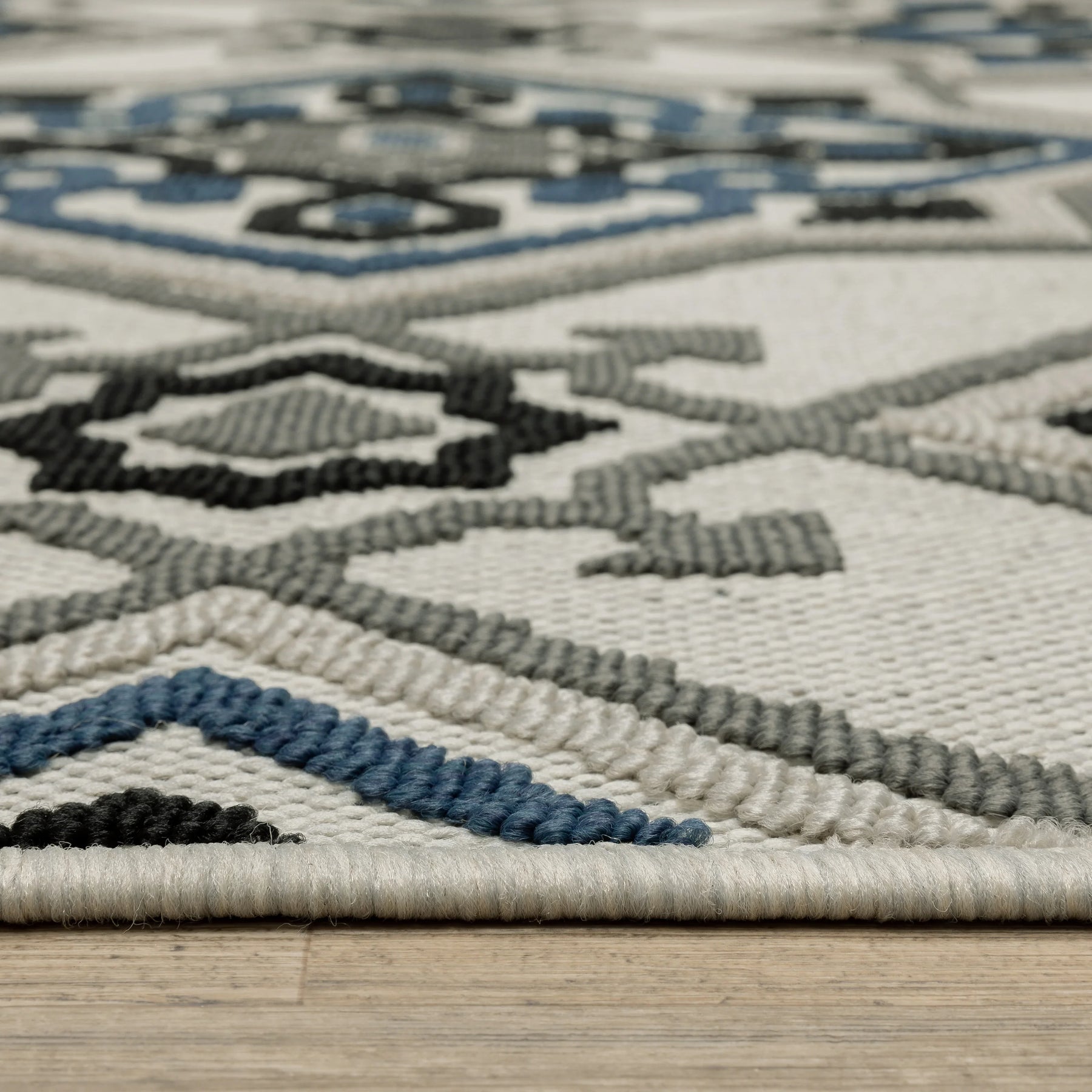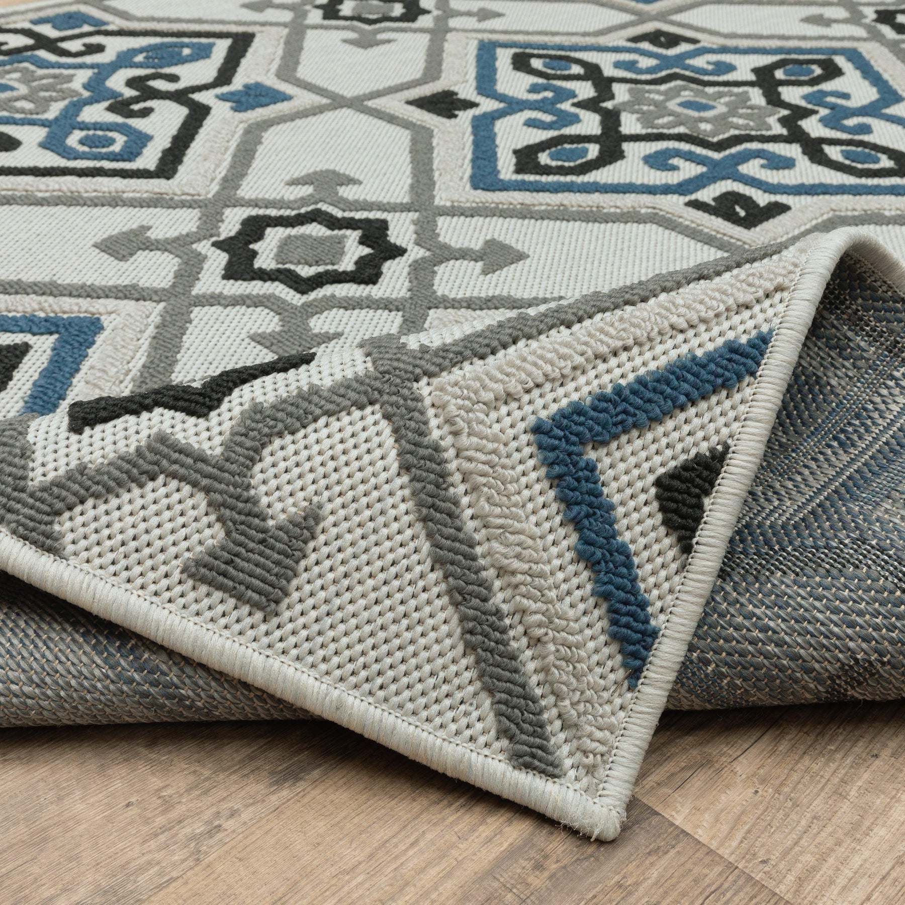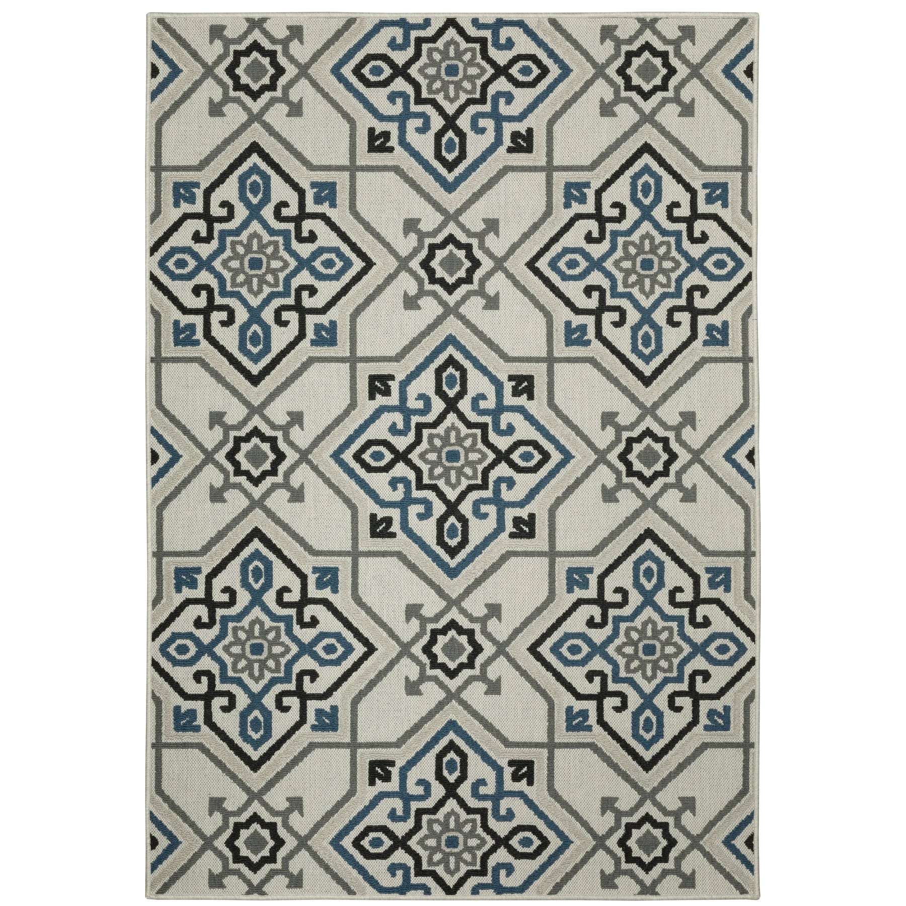The unique construction of our new Torrey collection features both flatwoven and loop textures giving the line a tactile hand and interesting surface texture. The patterned loop pile in tri-colored shades of deep marine blue, dark charcoal and soft gray pops on the flatwoven base which is a beautiful, light neutral shade of soft platinum. Torrey designs range from classic border and stripe styles to updated medallions as well as global looks and more modern abstract pieces. The collection is constructed of 100% easy care polypropylene making it perfect for use in either indoor or outdoor spaces.