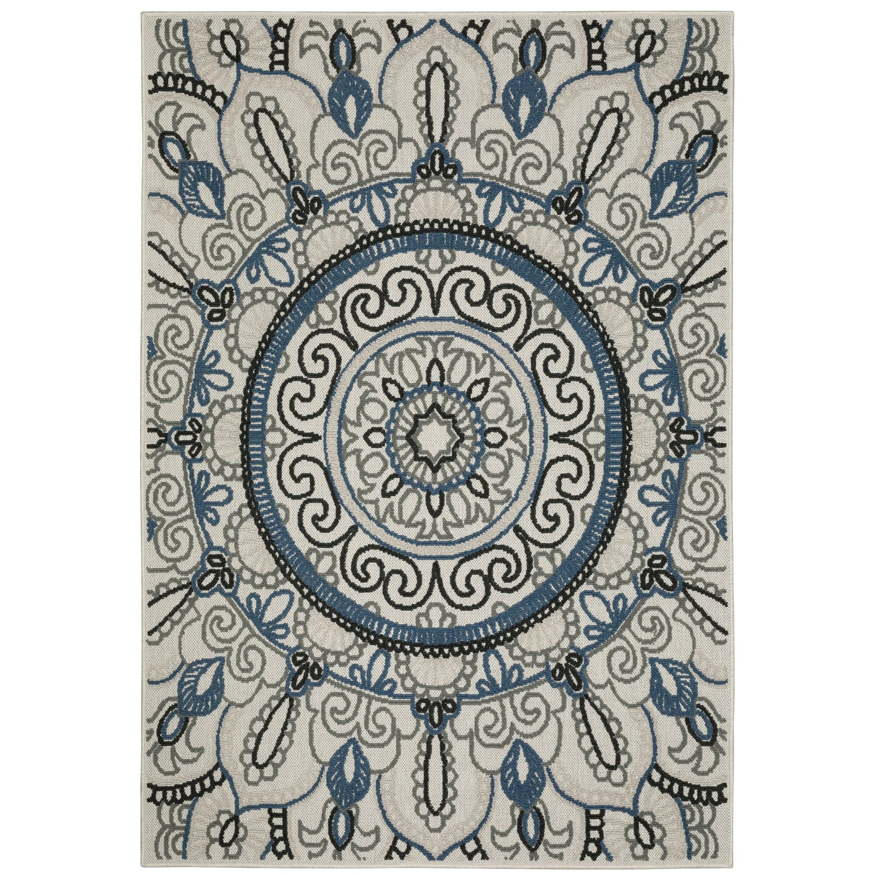 The unique construction of our new Torrey collection features both flatwoven and loop textures giving the line a tactile hand and interesting surface texture. The patterned loop pile in tri-colored shades of deep marine blue, dark charcoal and soft gray pops on the flatwoven base which is a beautiful, light neutral shade of soft platinum. Torrey designs range from classic border and stripe styles to updated medallions as well as global looks and more modern abstract pieces. The collection is constructed of 100% easy care polypropylene making it perfect for use in either indoor or outdoor spaces.