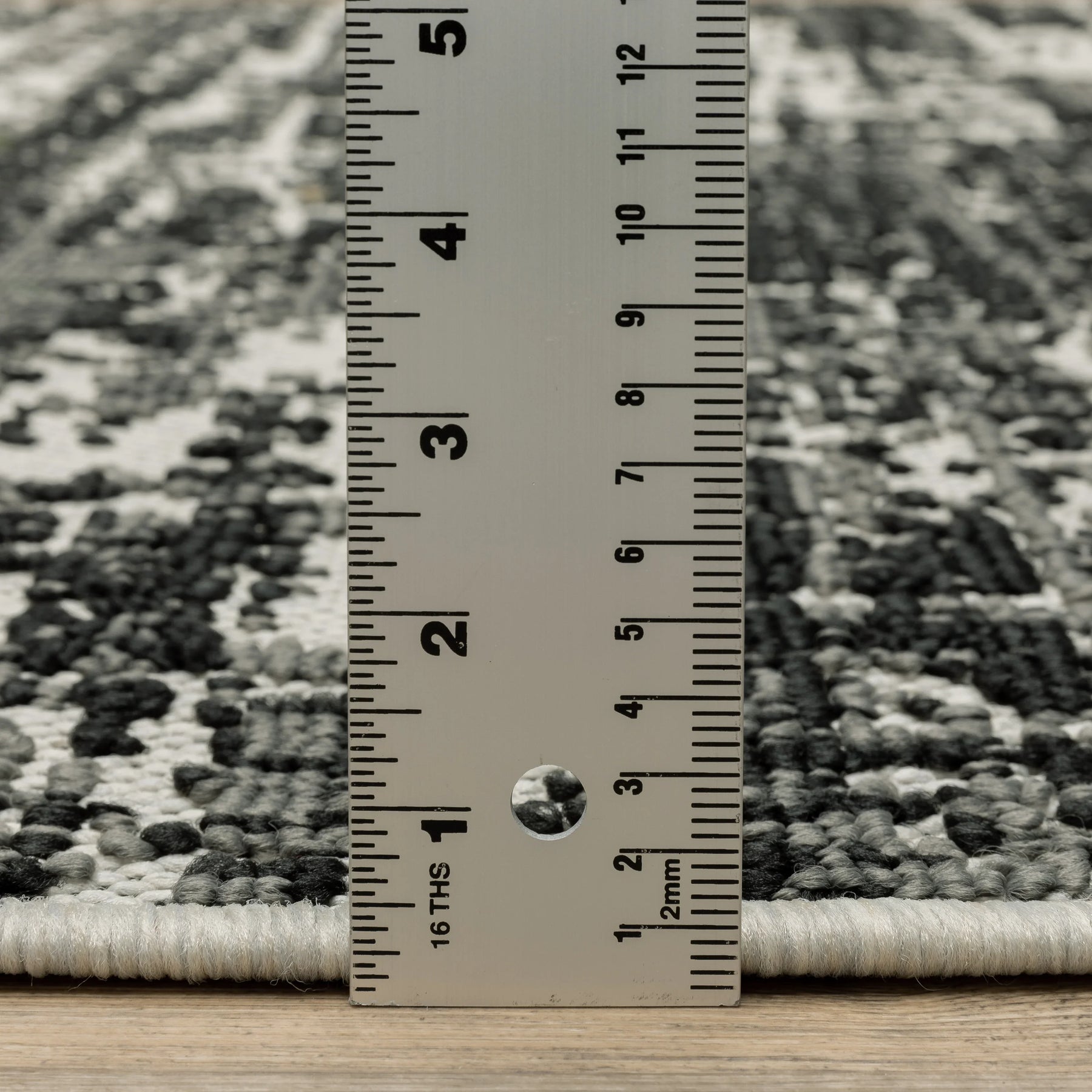 The unique construction of our new Torrey collection features both flatwoven and loop textures giving the line a tactile hand and interesting surface texture. The patterned loop pile in tri-colored shades of deep marine blue, dark charcoal and soft gray pops on the flatwoven base which is a beautiful, light neutral shade of soft platinum. Torrey designs range from classic border and stripe styles to updated medallions as well as global looks and more modern abstract pieces. The collection is constructed of 100% easy care polypropylene making it perfect for use in either indoor or outdoor spaces.