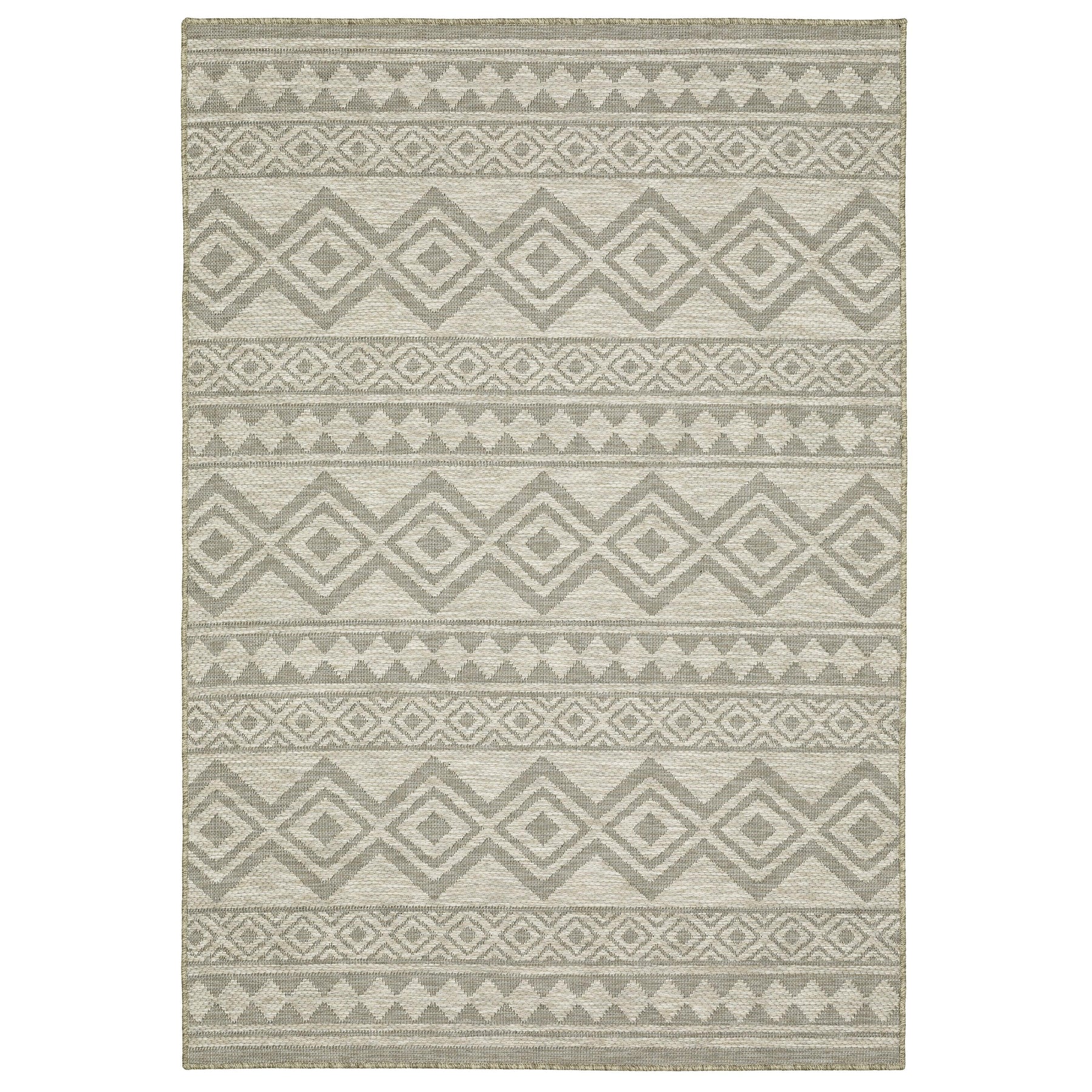 Tortuga, power-loomed of 100% polypropylene, features a textural, multi-level construction that gives the appearance of a high-end woven wool in an affordable, easy-care collection. Global inspired designs using multi-tonal yarns in neutral shades with a fine accent yarn in true black are sure to be the perfect finishing touch adding visual interest and dimension.