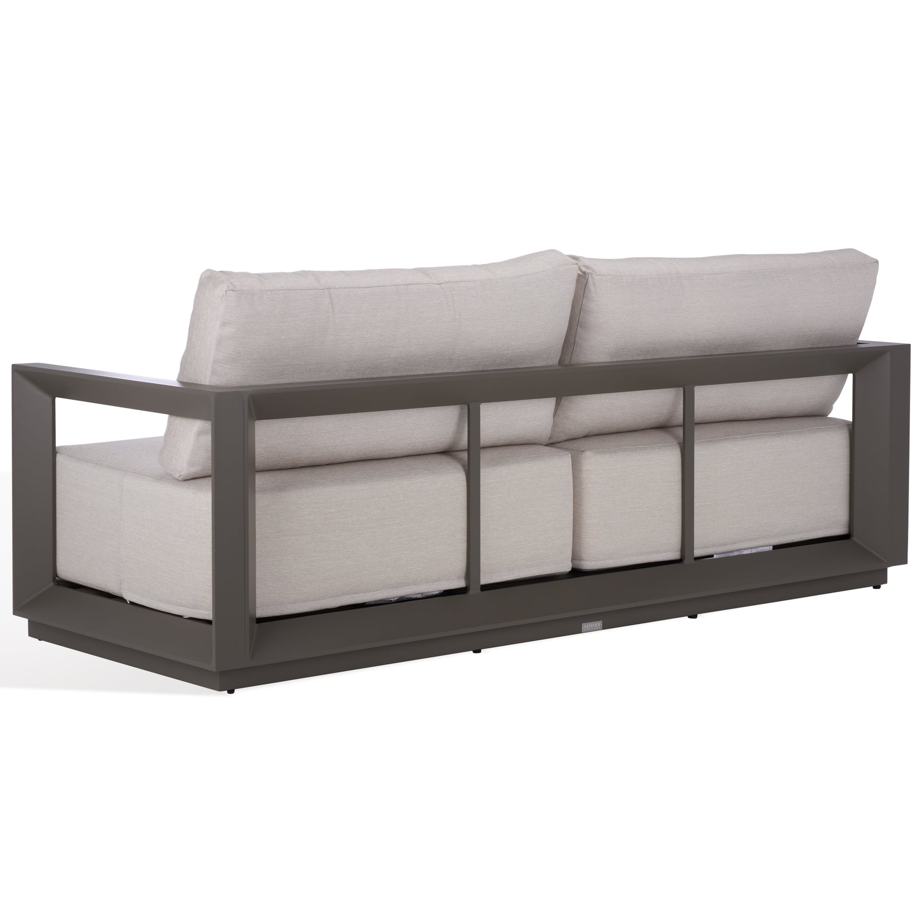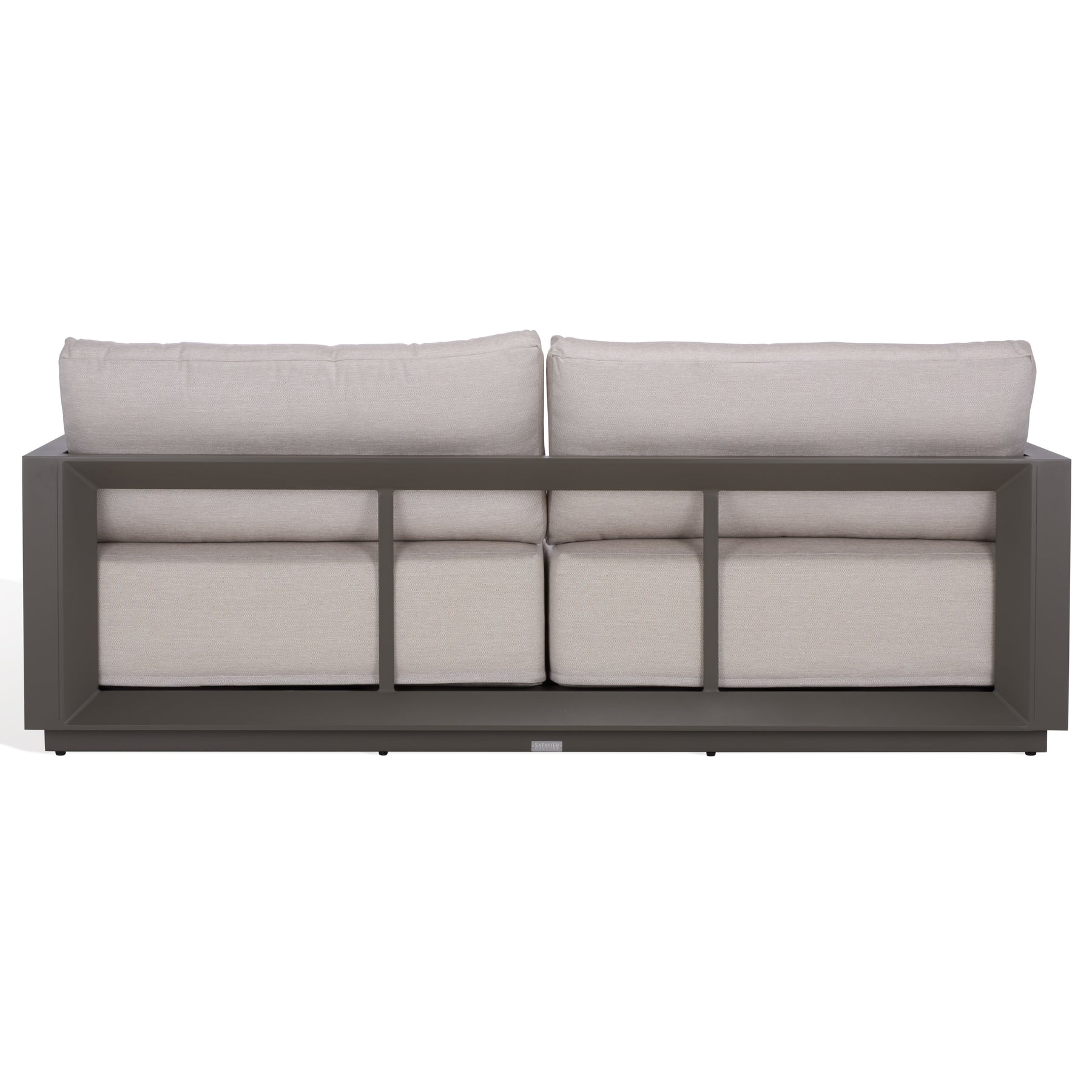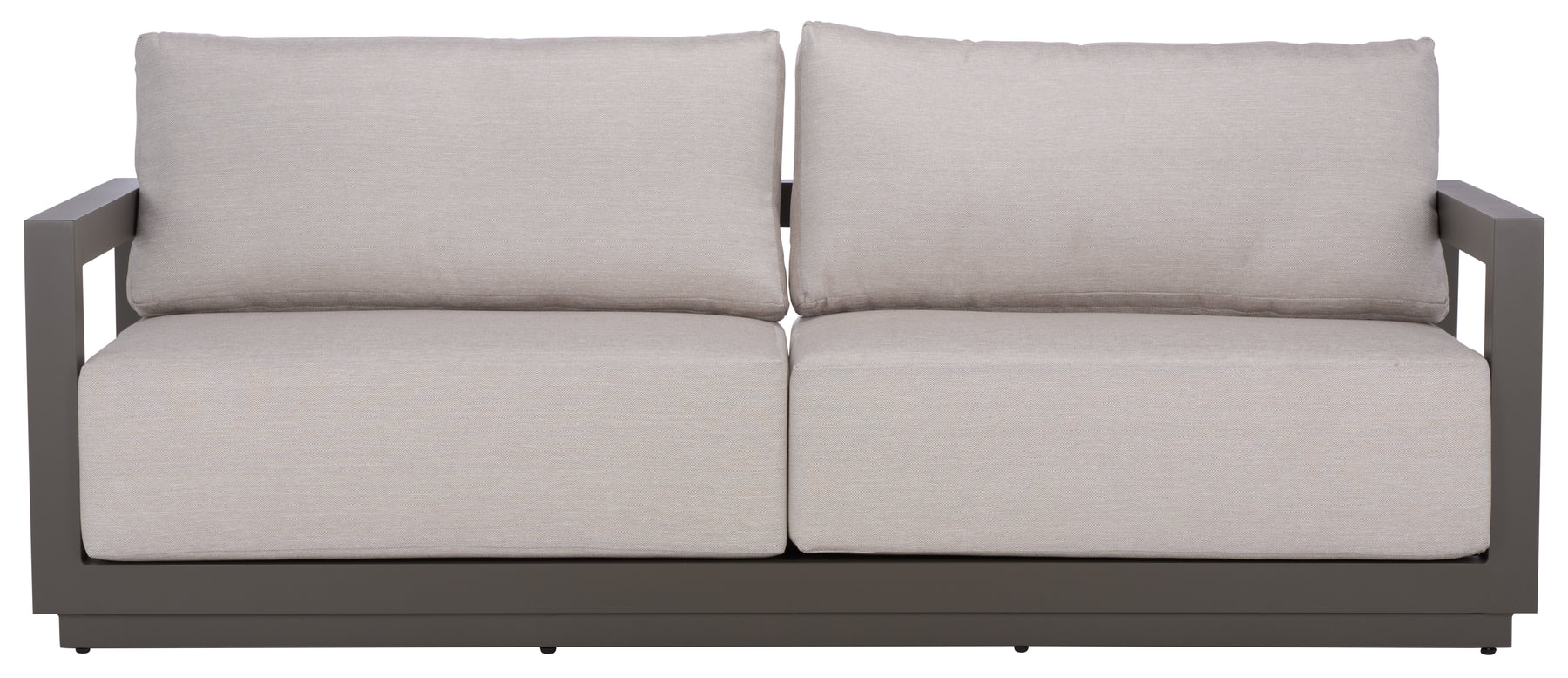 Introducing the Donaldo aluminum outdoor sofa, a blend of style and comfort tailored for your patio or garden. Crafted with a sleek dark grey metal frame, it offers a modern flair to any outdoor setting. Complementing its sturdy build are plush beige cushions made from quality fabric and foam that promise comfort during your leisure time.