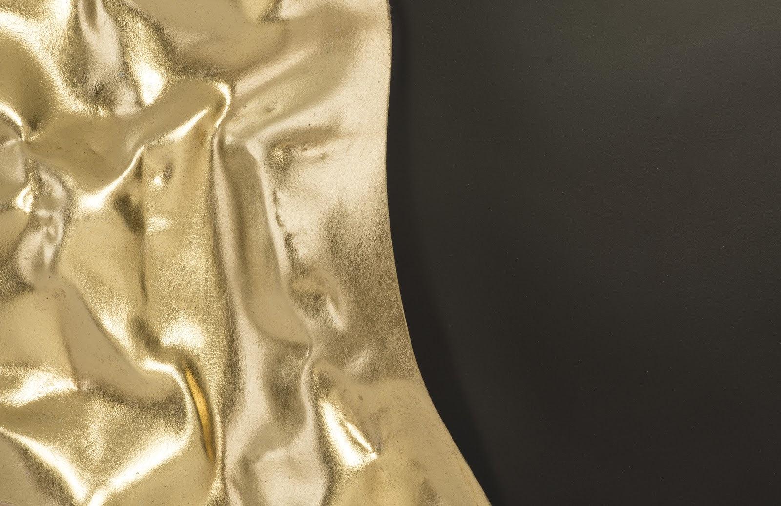 Dramatic in size and finished in black with gold leaf accents with a 23" diameter mirror. Textured finish gives the sense of a crushed design. The perfect piece to be used as both a wall accent piece and a functional mirror.
