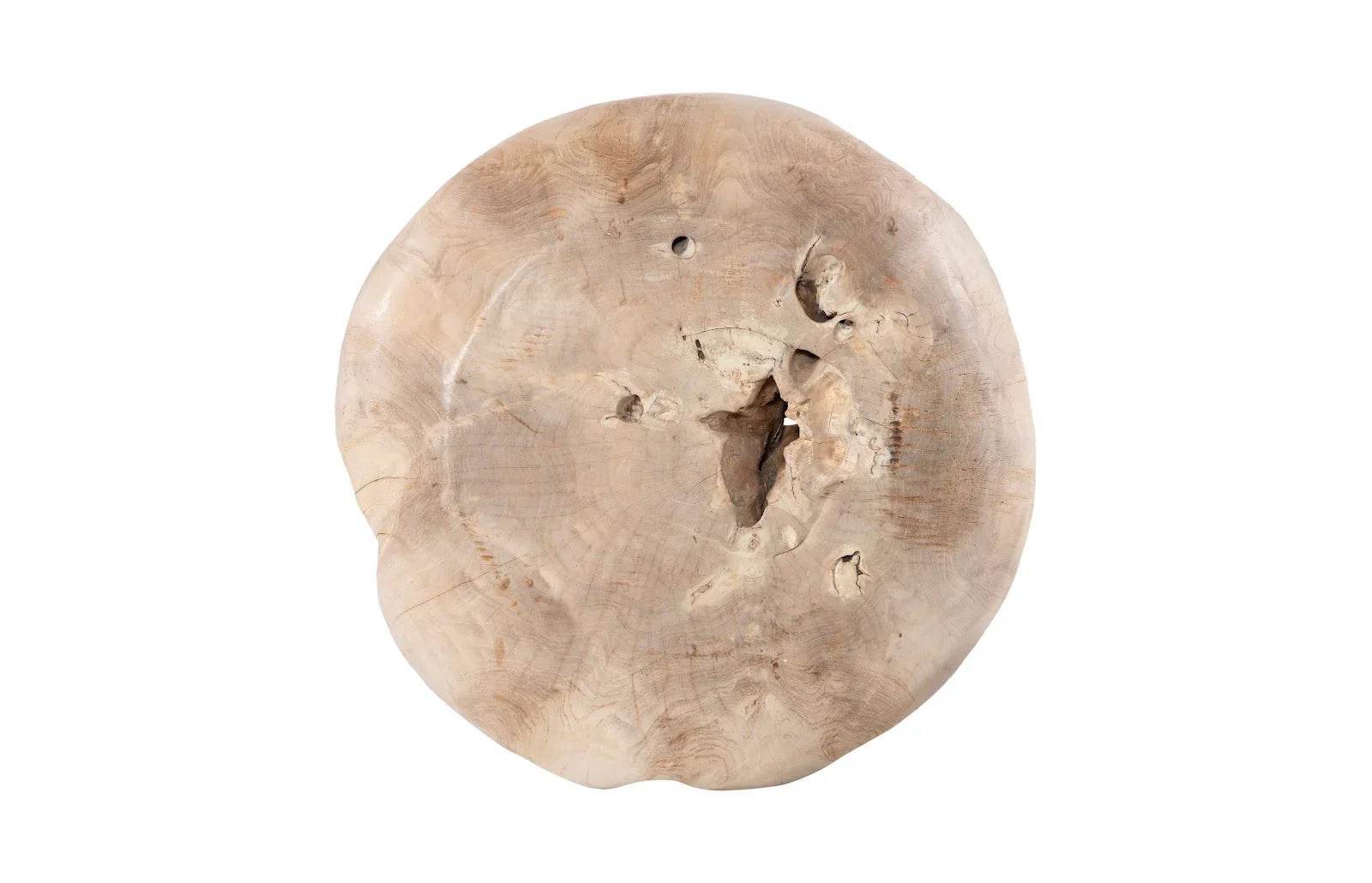 The Teak Wood Ball Sculpture showcases the natural elegance of the material in a bleached finish. The artist's meticulous shaping of the wood forms a spherical sculpture with natural indentations, highlighting the wood's inherent beauty. Placed as an accent piece, these sculptures add a touch of organic sophistication to the space, inviting admiration for its simple yet exquisite design. Please note that each piece will be unique and vary slightly.
