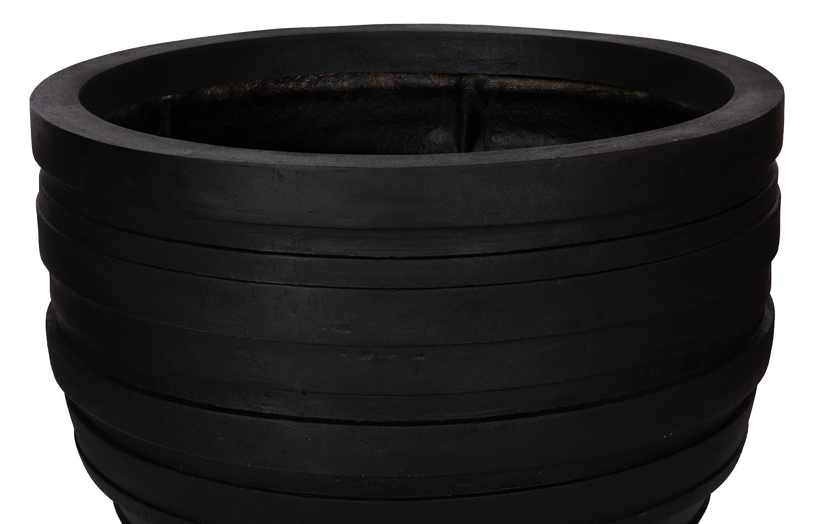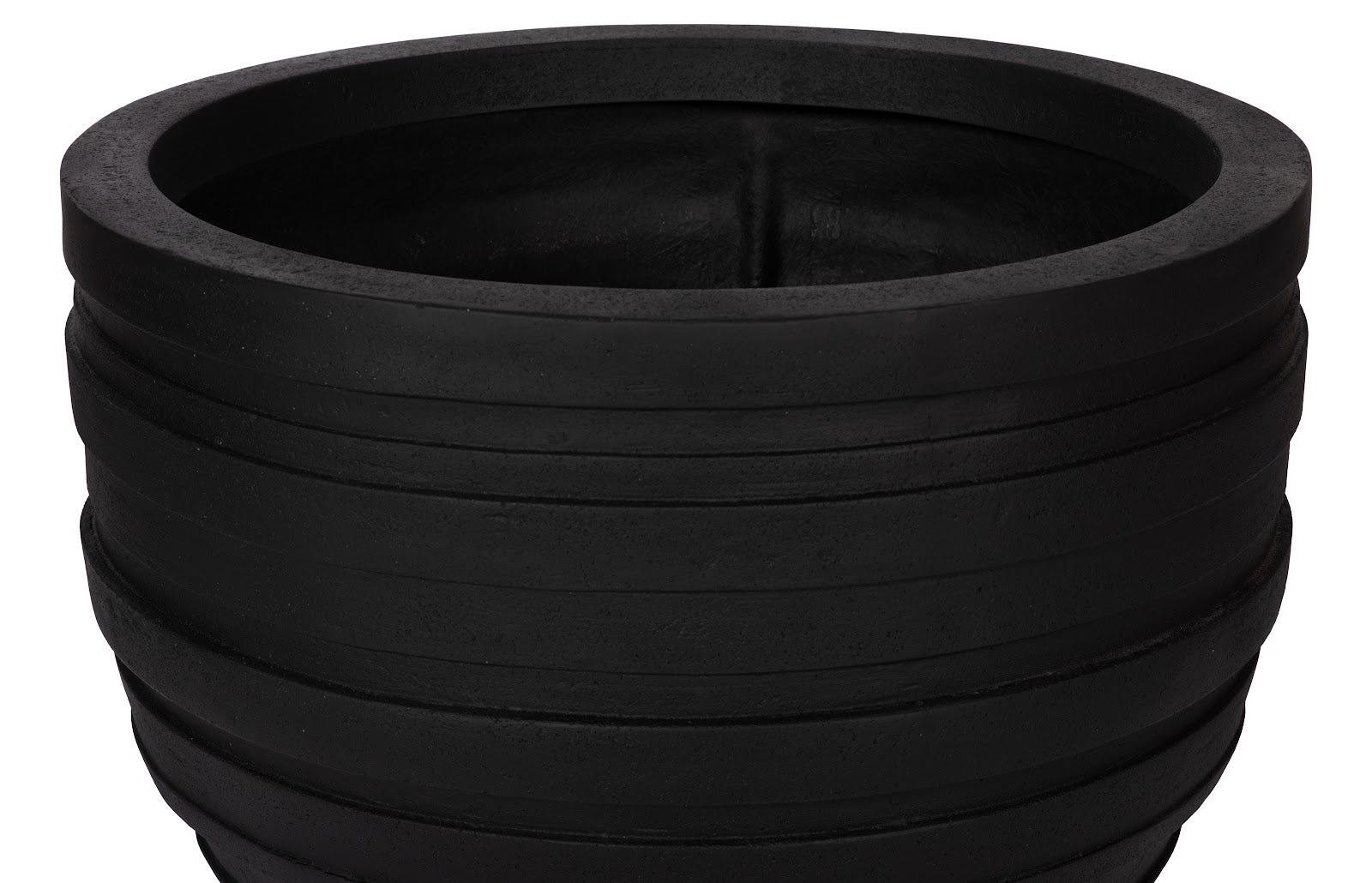 The June Extra Small Black Planter is ethereal in its matte black finish. Made of composite, its surface is striated to mimic fabric that has been wrapped around a vessel and slathered in a beautiful papier-mâché treatment. One of the loveliest aspects of this design is that it is strikingly contemporary for a garden planter thanks to its crisp black finish and the top lip that rolls into its interior to leave the shape clean-lined.