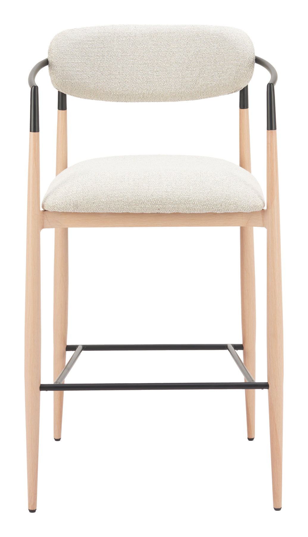 Designed for both style and functionality, the Equinox Barstool in Oyster Gray & Natural is crafted from textured 100% polyester fabric, powder coated steel, and faux wood steel. Its modern design is perfect for hospitality use, enhancing any space with elegance and practicality