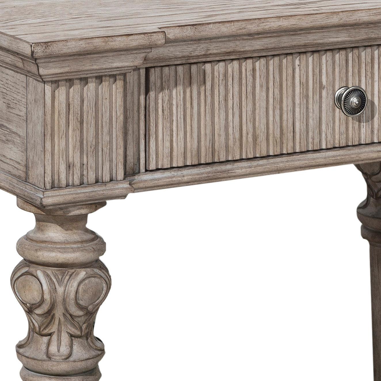 The Kingsbury one-drawer USB Charging Open Nightstand brings together timeless European design, exuberant scale and a relaxed French Gray finish on Oak Veneers to exude casual elegance. Fluted carving on the drawer front and carved, shaped legs create a bespoke yet inviting style. The drawer has English dovetail construction and metal ball bearing side guides, and a convenient USB charging outlet is featured, along with a bottom shelf. Fluted knobs with a pewter finish add a finishing touch.