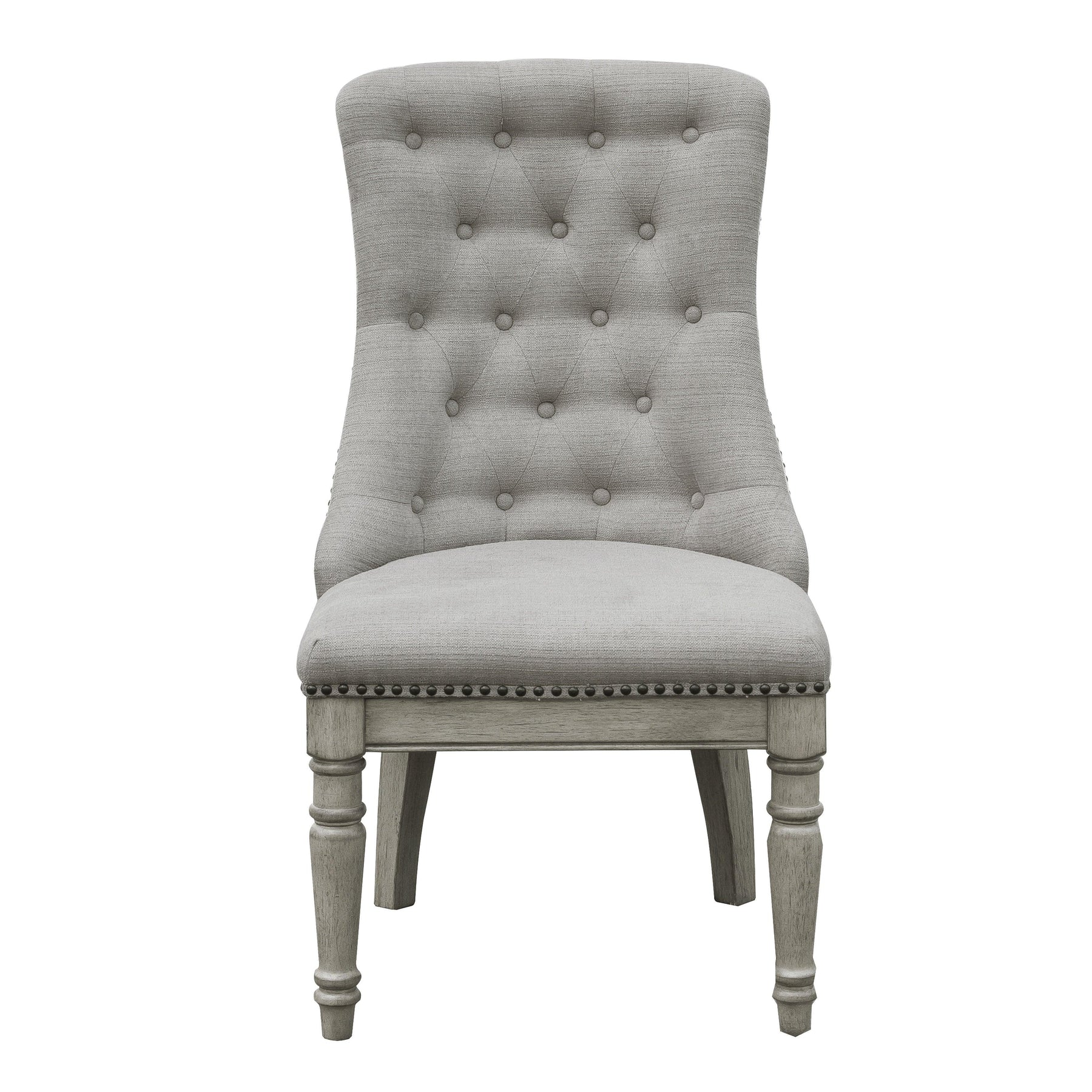 The seat and back are both deeply padded and upholstered, with button tufting on the gracefully shaped back that adds a classic, formal touch to the otherwise relaxed farmhouse aesthetic of the collection. Antique brass nail head trim outlines the upholstered surfaces with a warm, aged-metal accent that reinforces the traditional character of the design while adding a layer of sophisticated detail that elevates the host chair above the standard farmhouse dining chair.