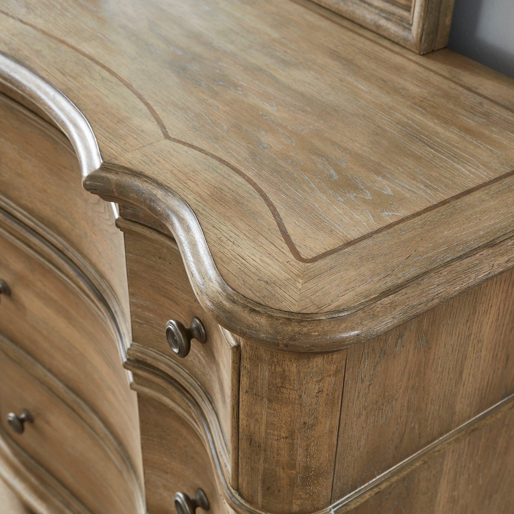 Bring the essence of an elegant home in the French countryside to your bedroom with the Weston Hills Dresser. Six spacious drawers allow you to neatly store away your belongings, while the surface is perfect for bedroom decor and jewelry stands. The knob hardware has an understated pewter finish for an effortless look. White cerusing on cathedral hickory veneers enhances the grain and adds softness to the warm tones of the wood. Shapley fronts, rounded corners, and walnut inlays add distinction and character. Weston Hills --perfectly timeless, perfectly today, perfectly you.
