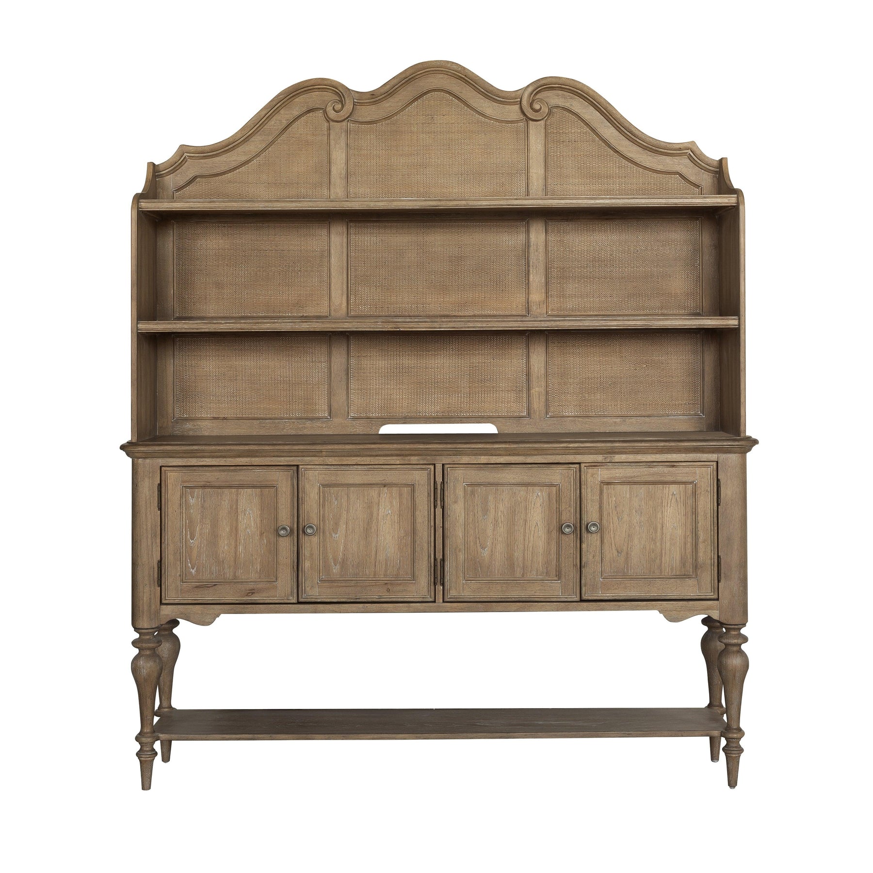 Familiar yet fresh, Weston Hills dining collection combines a casual attitude with traditional French flair. Stylish sideboard features two open shelves with plate grooves, a woven sisal back for textural interest and a shaped top with scroll work. The sideboard hutch has four doors with one adjustable shelf for concealed storage, walnut inlay on top and an open shelf at the bottom to display home decor. Coordinate with our bookcase or dining set to create the perfect dining space.