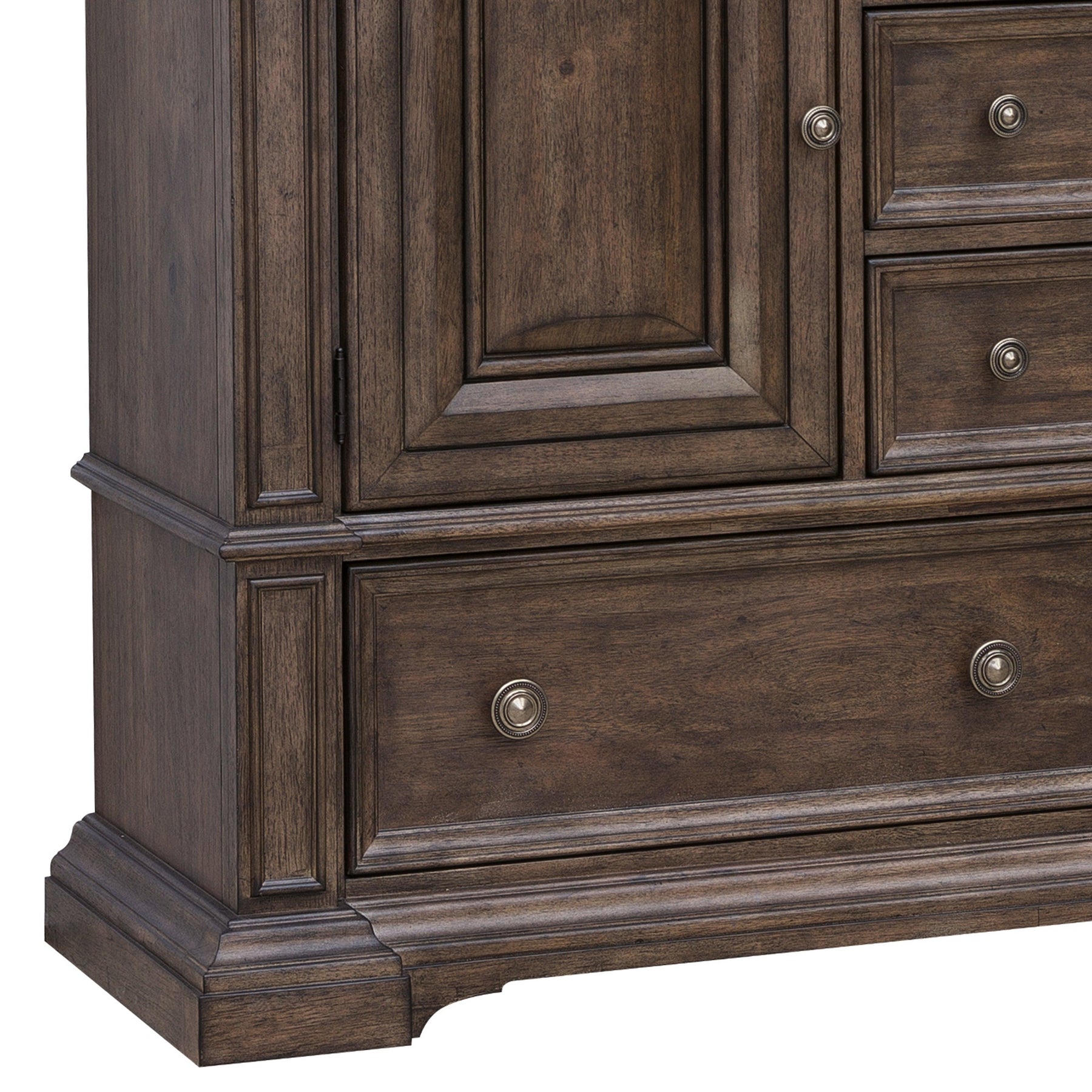 Define the aesthetic and ambiance of the bedroom with the Woodbury Five-Drawer, Two Cabinet Dresser & Mirror set. Five spacious drawers provide ample storage for items such as bed linen, sweaters, and intimate belongings. Shelving behind two cabinet doors on each side of the dresser offers additional storage for other bedroom essentials, and a rectangular-shaped, beveled mirror gives a clear reflection for dressing, applying makeup, and grooming. The warm, earthy Cowboy Boots finish creates a welcoming and cozy atmosphere, while half-cylinder paneling with detailed molding adds character and dimension. This dresser is not just a place to store your belongings; it's a functional piece that elevates the entire room.