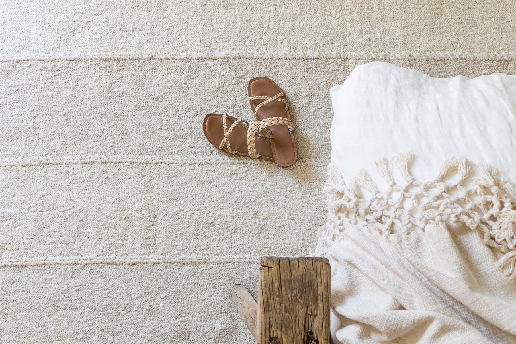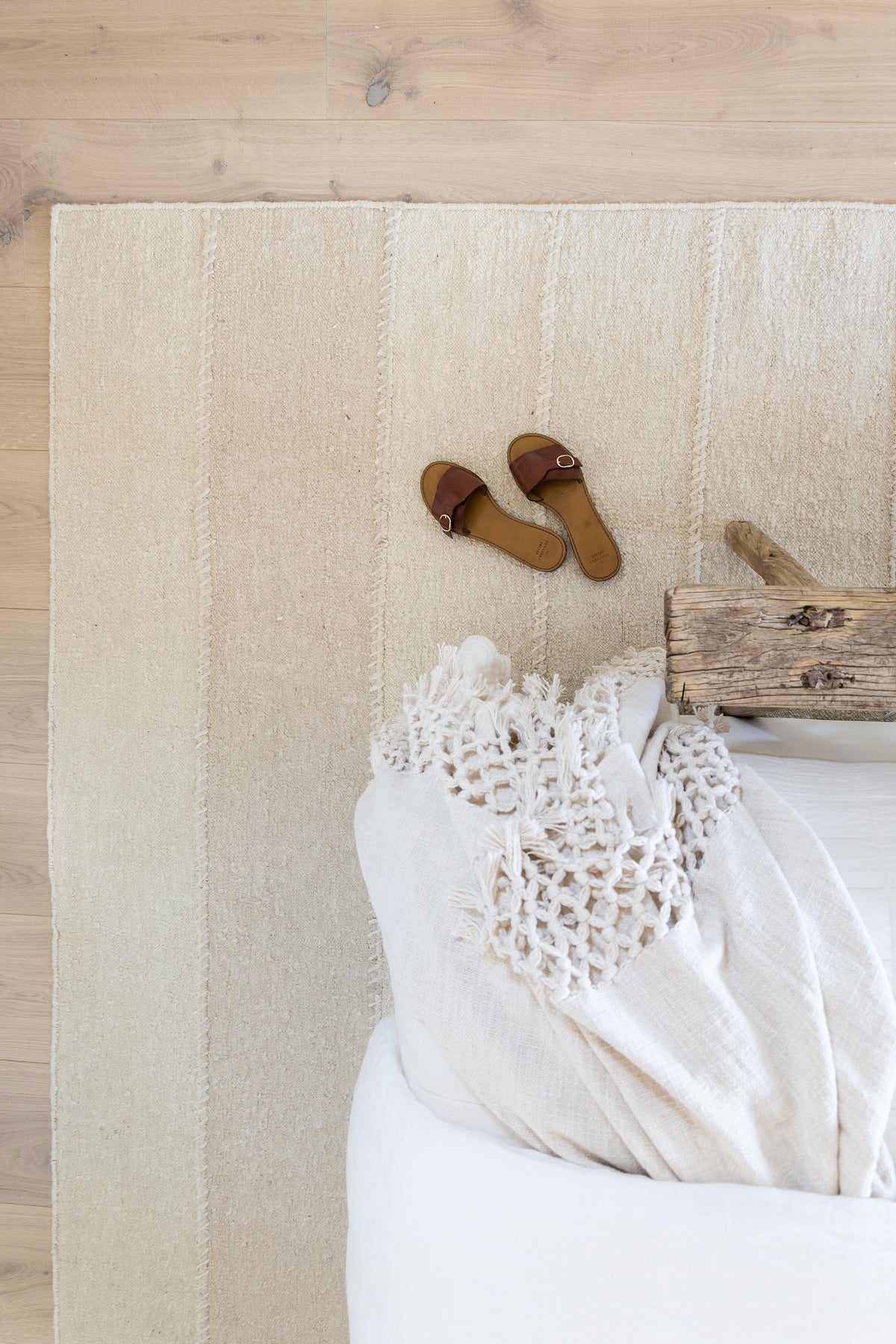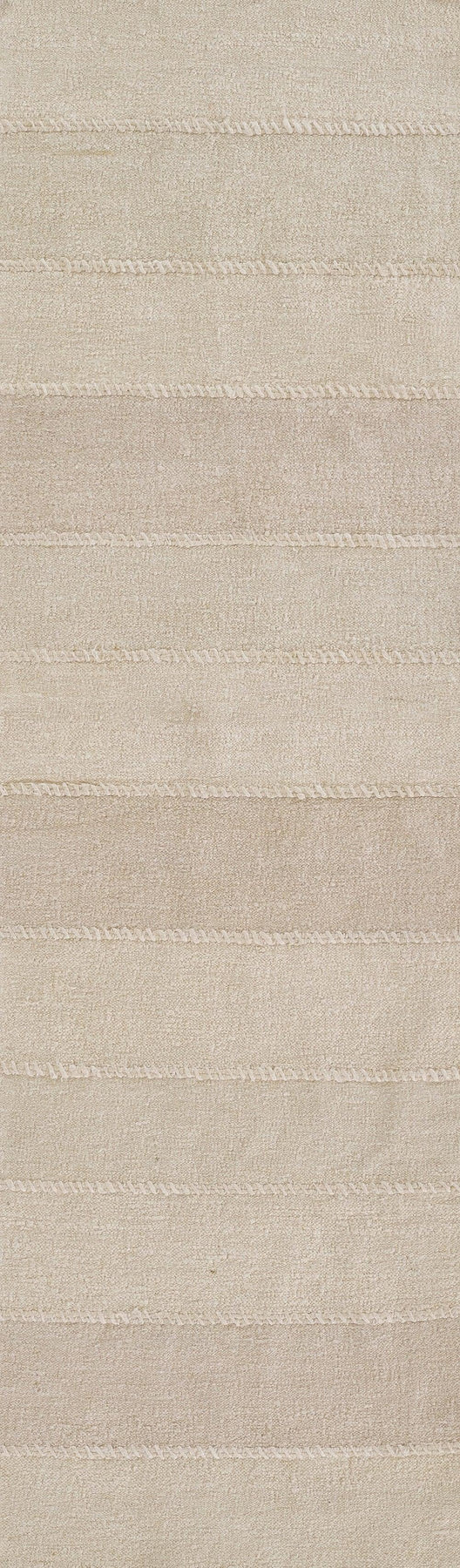 Taking cues from classic kilim, this one hundred percent hand-woven linen rug blends tonal neutrals for a richly layered look. Variations in the pile and stitched details all showcase the craftsmanship that goes into each unique design, and celebrate the history of both aesthetics and quality.