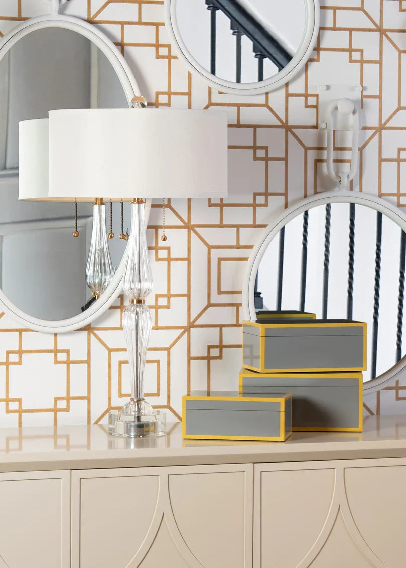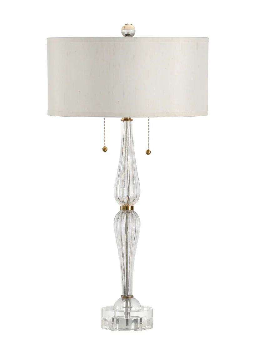 Our Naomi Lamp is an elegant crystal and brass 32" table lamp. Its gracefully curved hourglass silhouette is topped with a beige silkette shallow drum shade for a traditional design with a modern touch. Featuring two lights with pull chains, this accent light is sure to bring beauty and shine to your dining room buffet or formal living room end table.