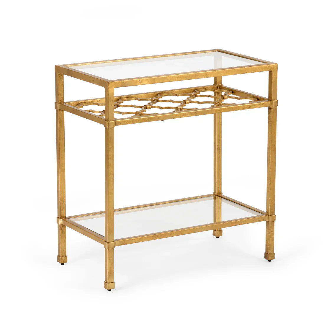 Enhance your living area with our Pacific Coast Table. This elegant 23" side table is crafted of metal with an antique gold leaf finish and has two glass shelves for displaying your treasured photographs, books or accent pieces. It features a shelf with a quatrefoil design shown off through the top glass shelf.