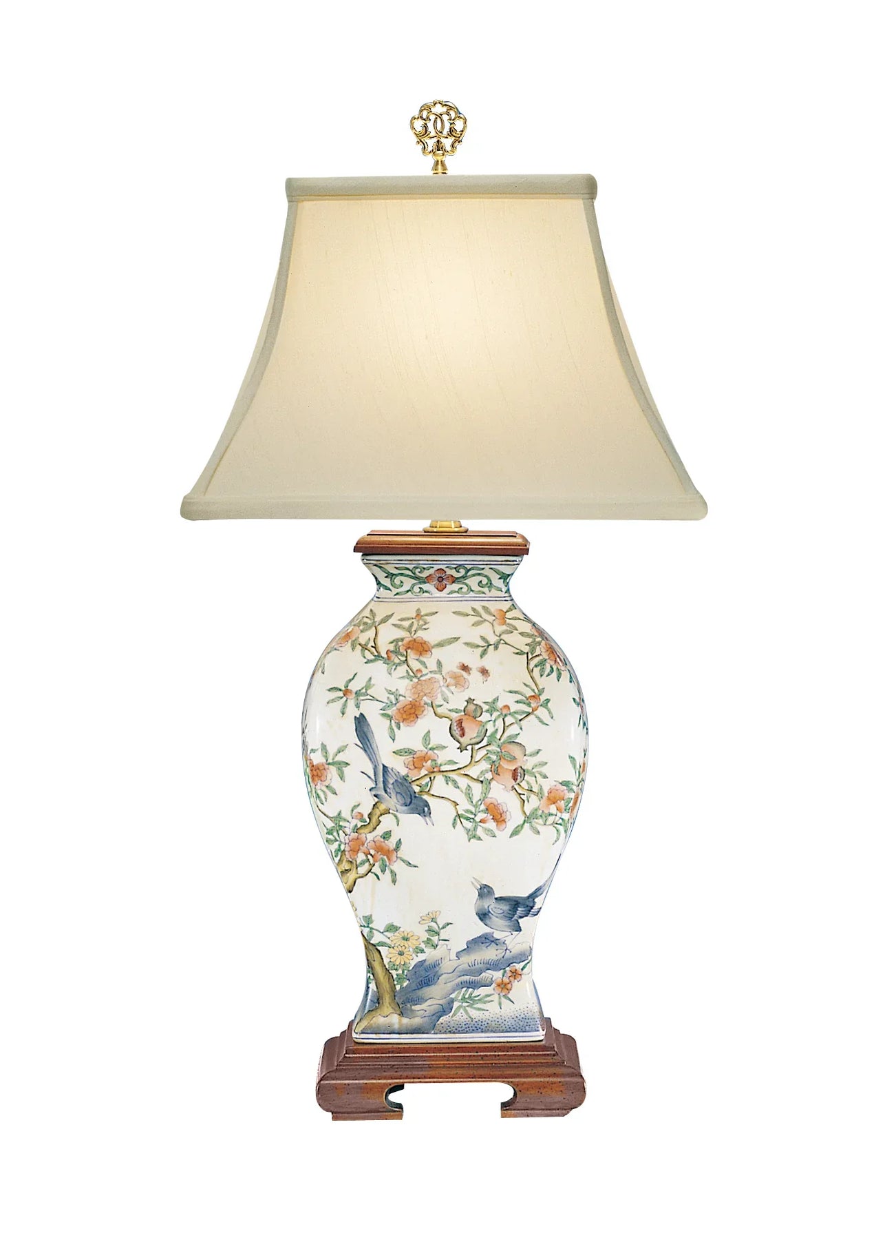 Elegance and tradition, Pom 'n Bird lamp is crafted of a hand painted porcelain vase and features a floral pattern with blue birds. The wood base gives the lamp a sturdy base while the bone silkette shade balances the design and diffuses opulent light. Display this exquisite light source on a console in the entryway, a nightstand in the bedroom or an end table in your living room and enhance your traditional style.