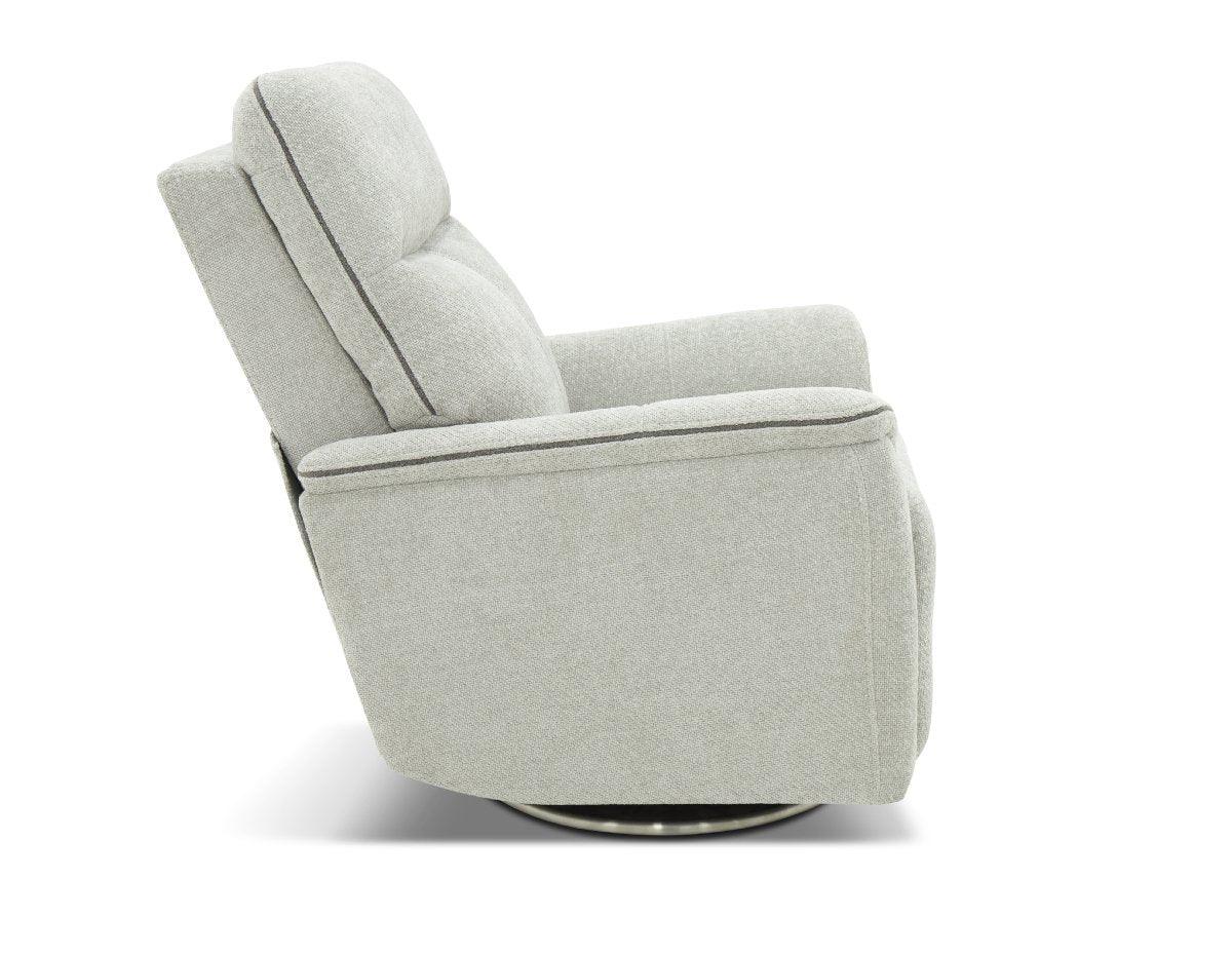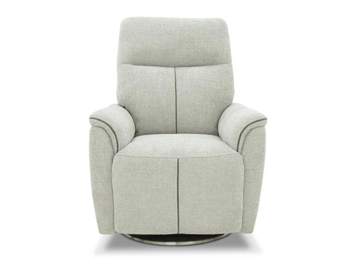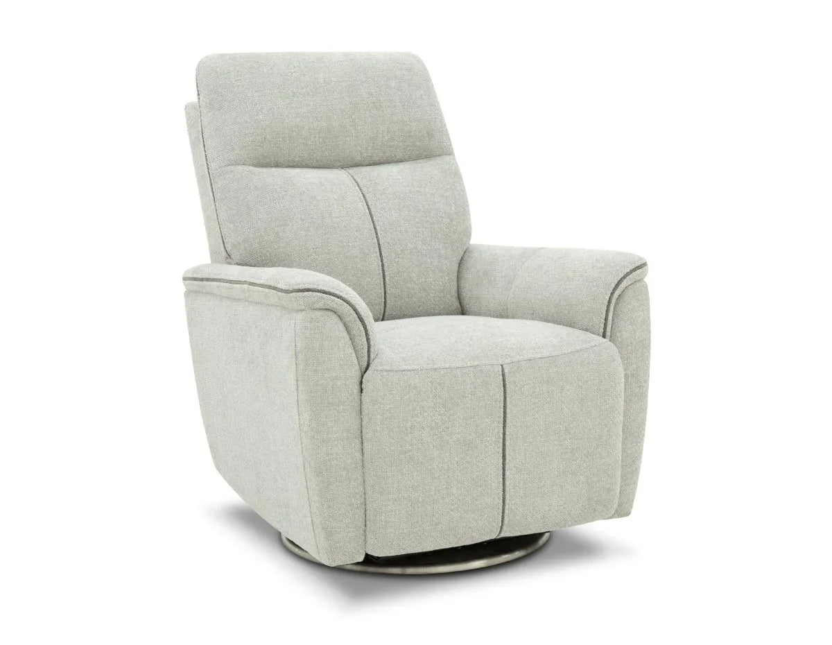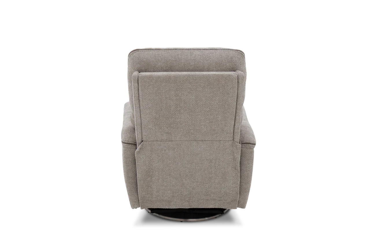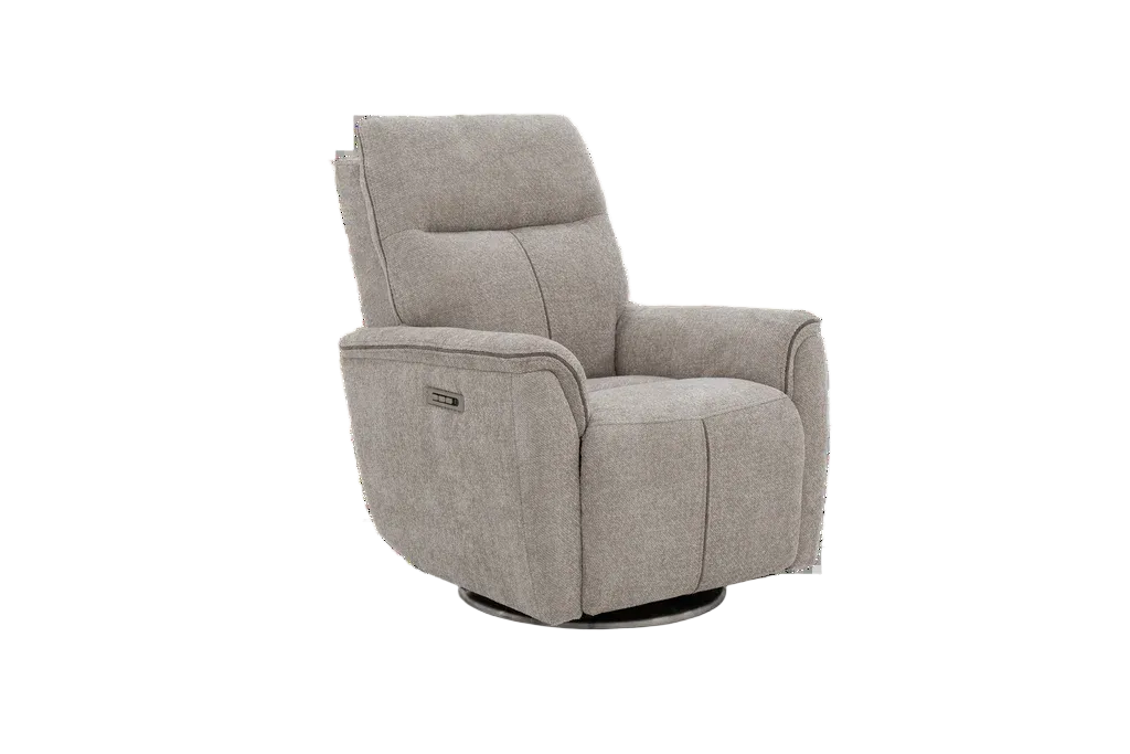 Triple power 360 degree swivel recliner with power recline, power head rest, and power lumbar. Tucked pub back, pad over chaise seat with pocketed coil springs, and steel seat box. Tailored pillow top wedge arms, contrast welts accent the back, arms and footrest. Push button power controller on outside the arm has USB A & C ports.
