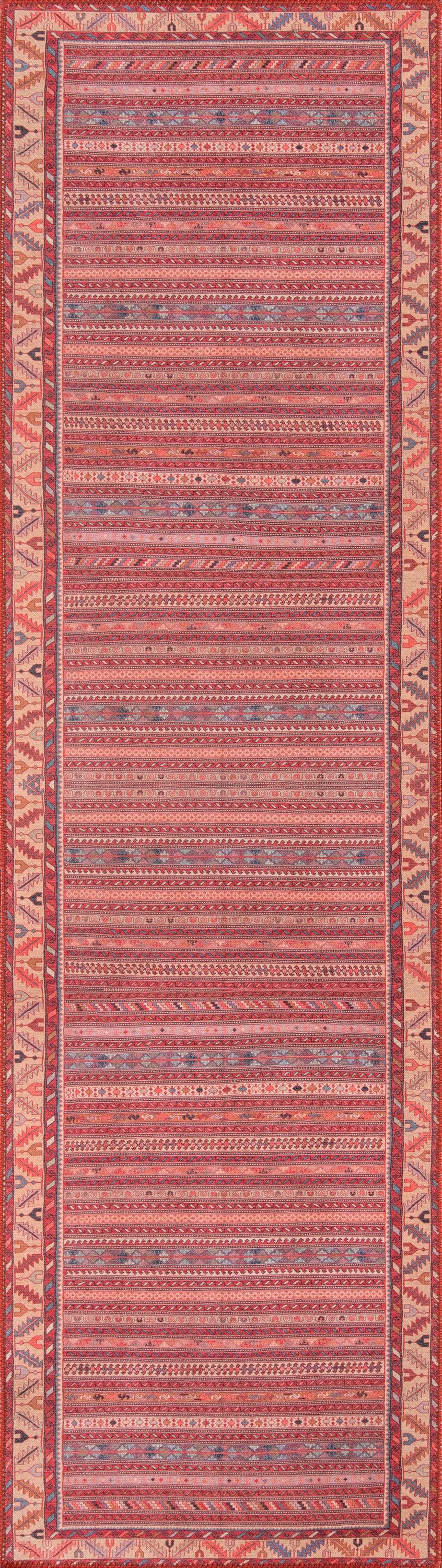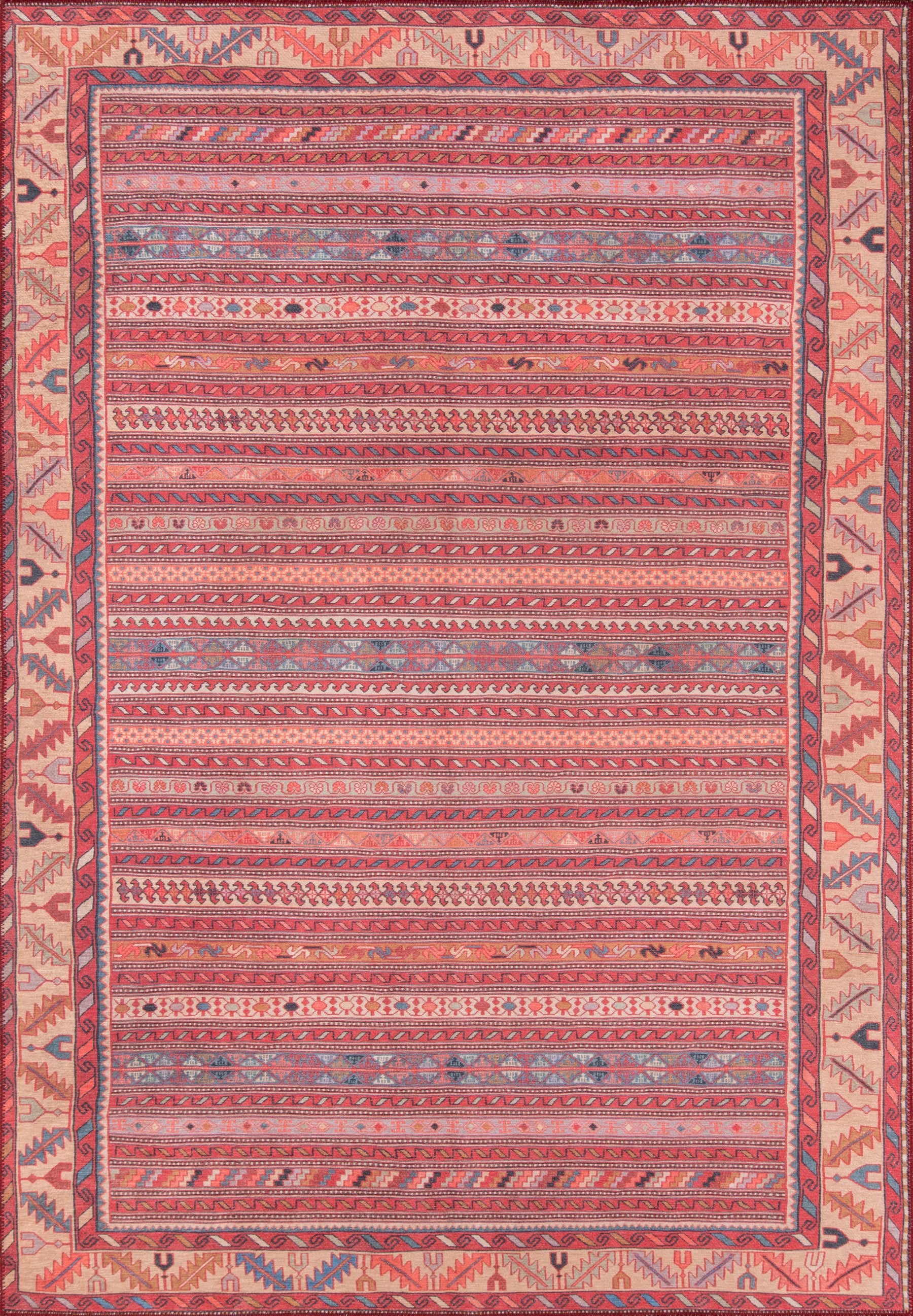 Repeating bands of pattern run the length of this magnificent Turkish rug. With a Navajo-style border filled with fresh, pop-y colors like blue-grey, lilac, blush, and coral it feels decidedly modern. Featuring nods to the past, this carpet is sure to be a favorite far into the future.