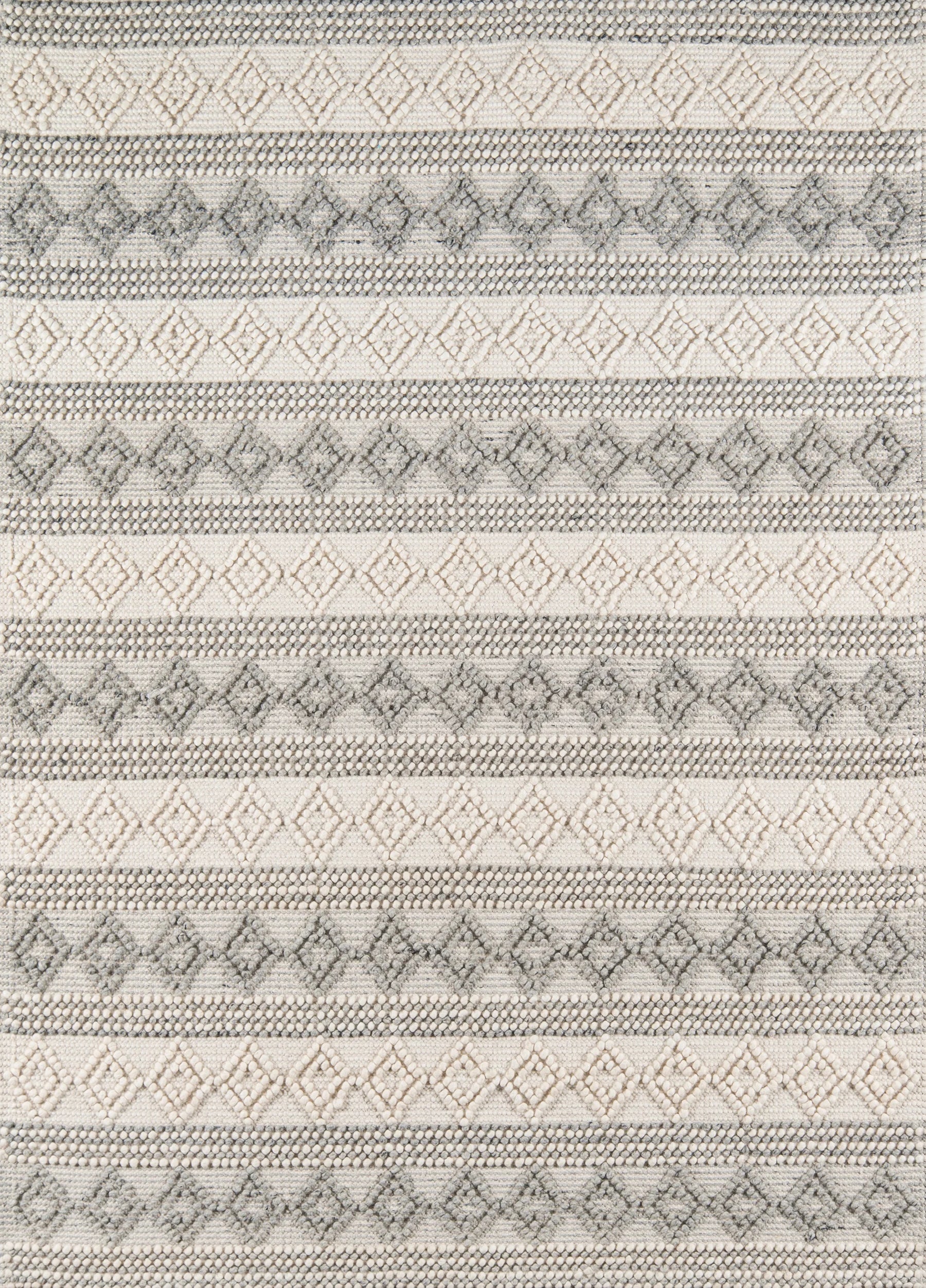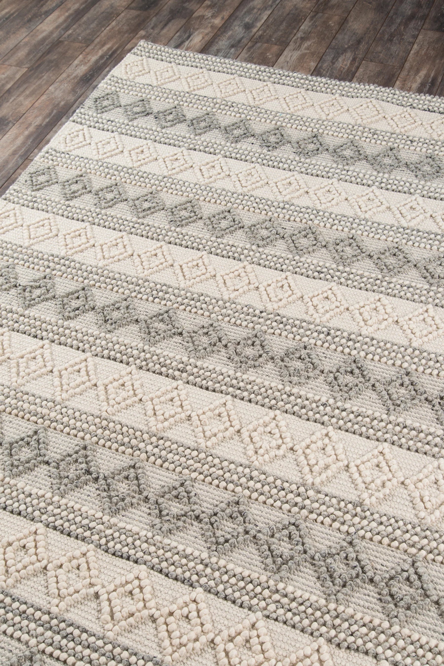 Add a touch of the American Southwest with the earthy styling of this modern area rug. This assortment of decorative floorcoverings features a softly toned grey, beige and blue color palette and high-low pile that accentuates graphic geometric patterns like diamonds and stripes. With balanced, rustic designs, this elegant series of hand-tufted wool rugs brings long-lasting elegance to high-traffic areas and restful spaces alike.