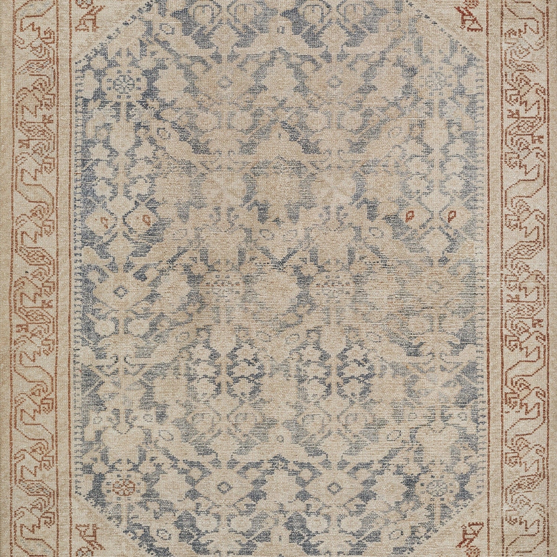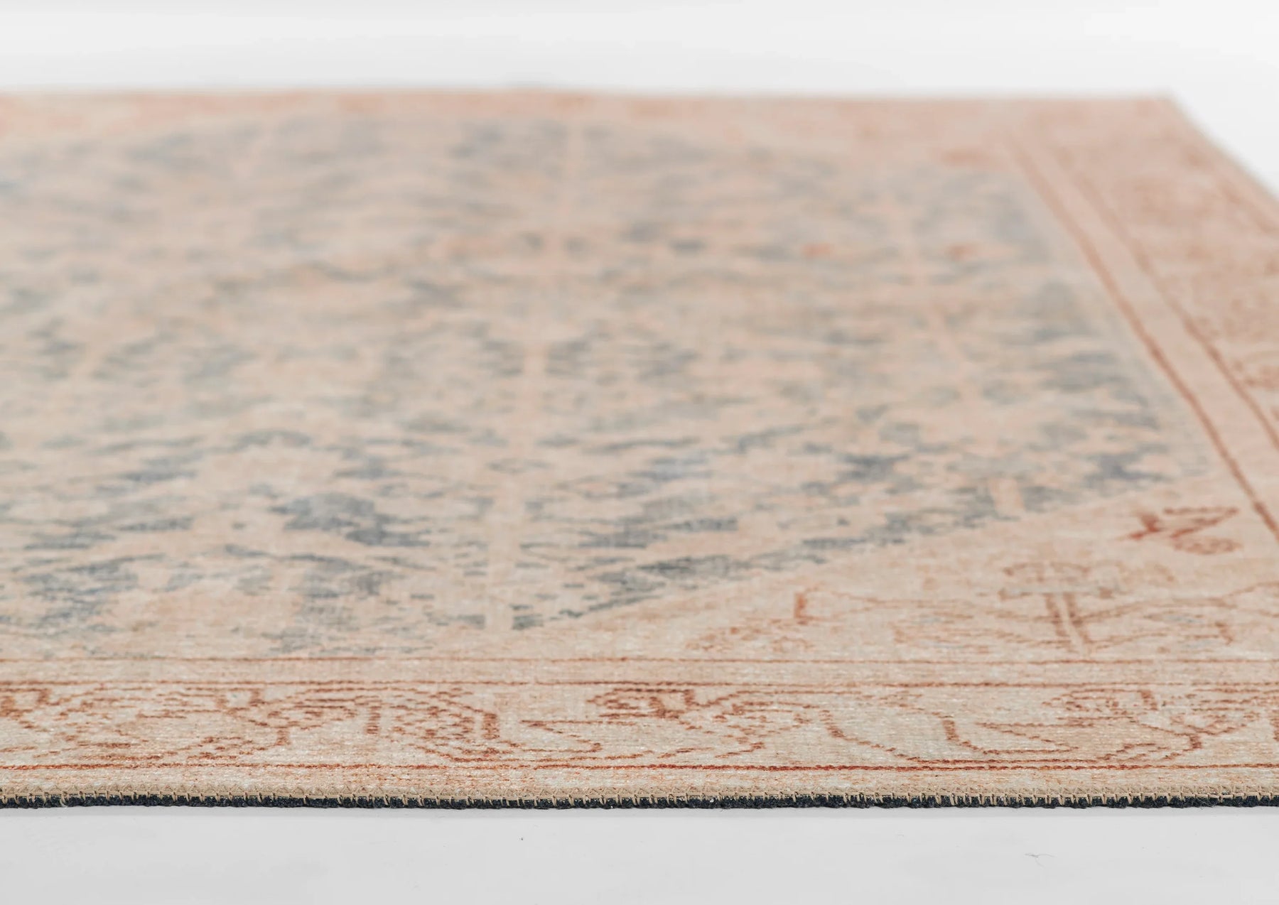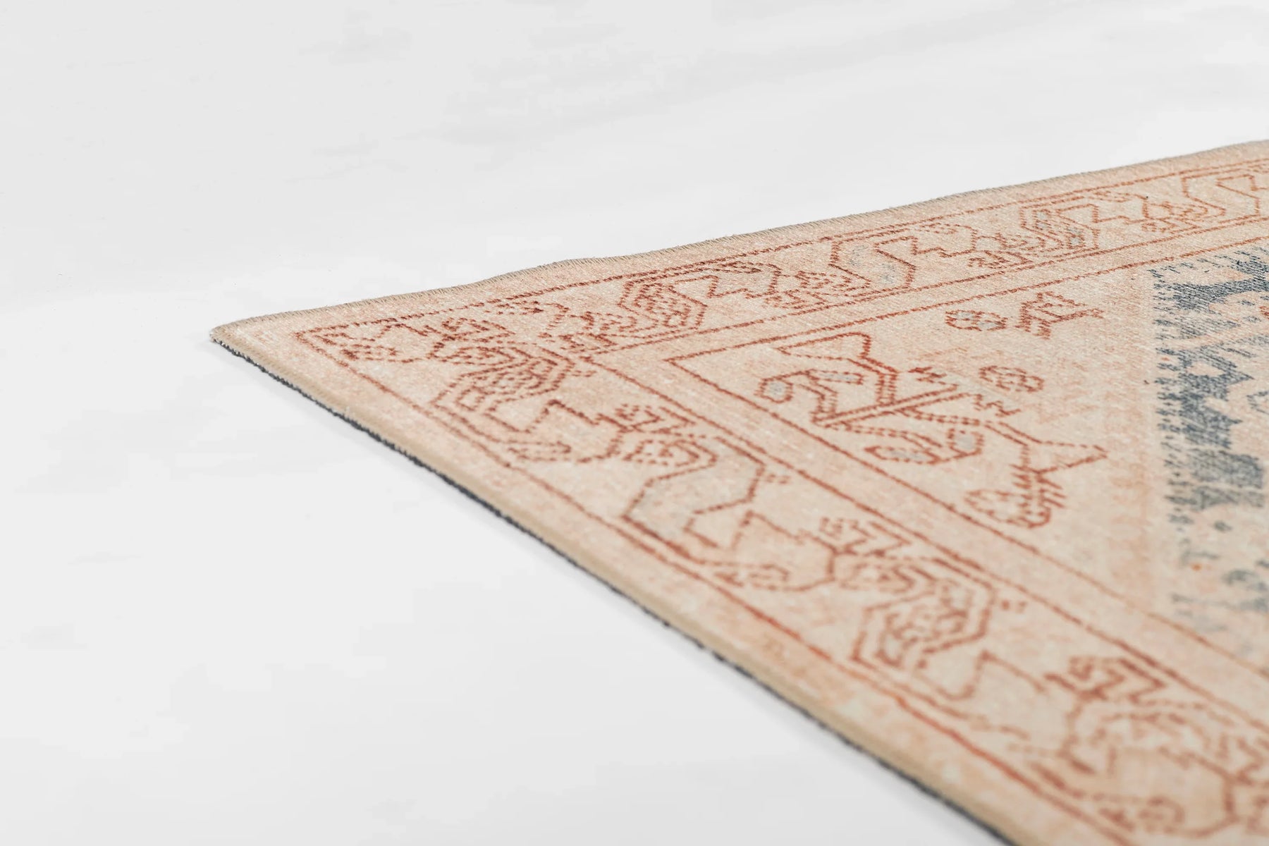 A graceful blend of tradition and modern ease, this rug brings antique beauty into everyday living. Its distinctive octagonal medallion anchors the design, surrounded by a soft, timeworn field of washed blue and beige, framed with a delicate coral-toned border reminiscent of hand-knotted classics. Crafted from lightweight polyester chenille, this printed rug captures the visual richness of a vintage heirloom with none of the upkeep. The flatweave construction offers a smooth, low-profile surface perfect for layering or anchoring furniture with subtle elegance. Whether styled in a cozy den, refined entryway, or relaxed bedroom, this rug delivers global charm, relaxed refinement, and timeless appeal—effortlessly.