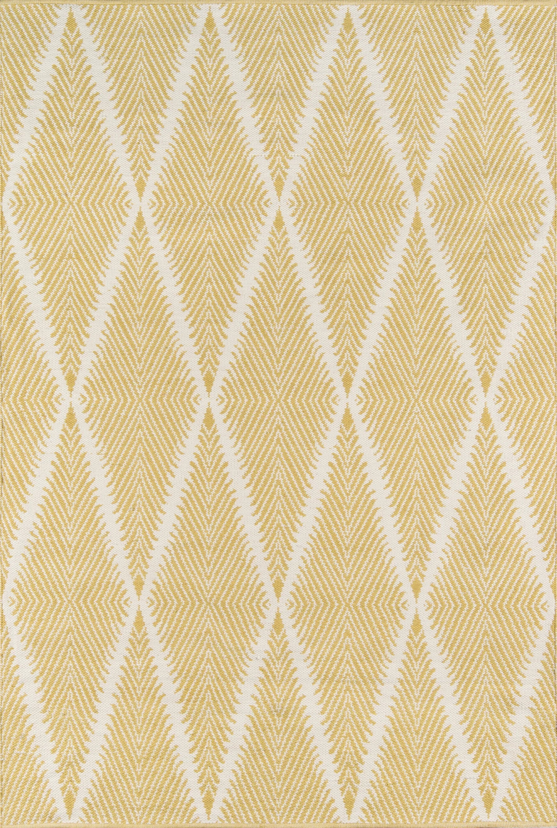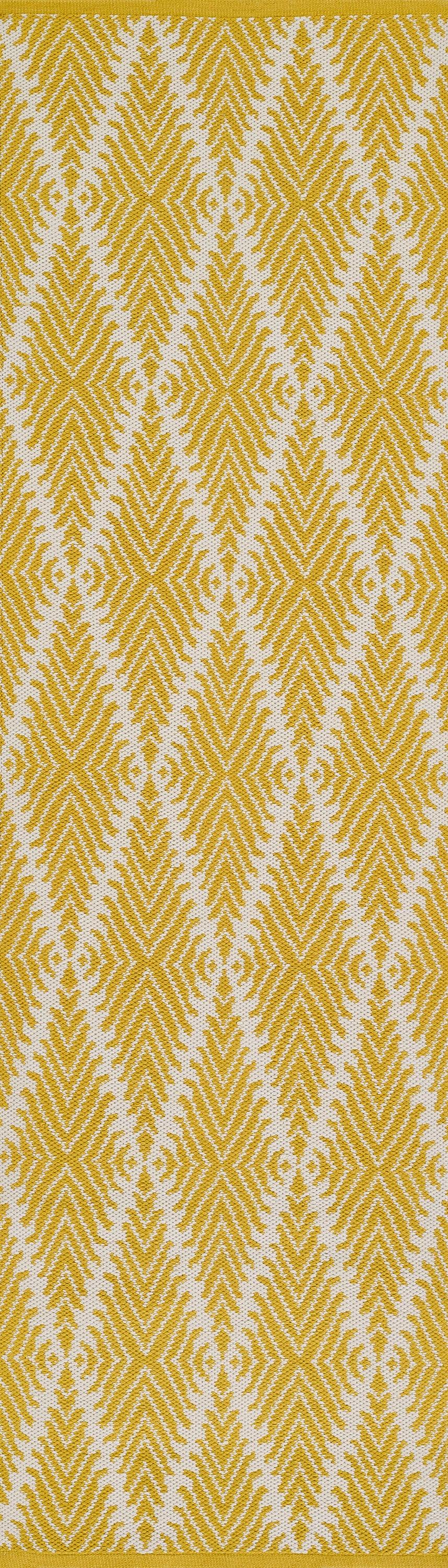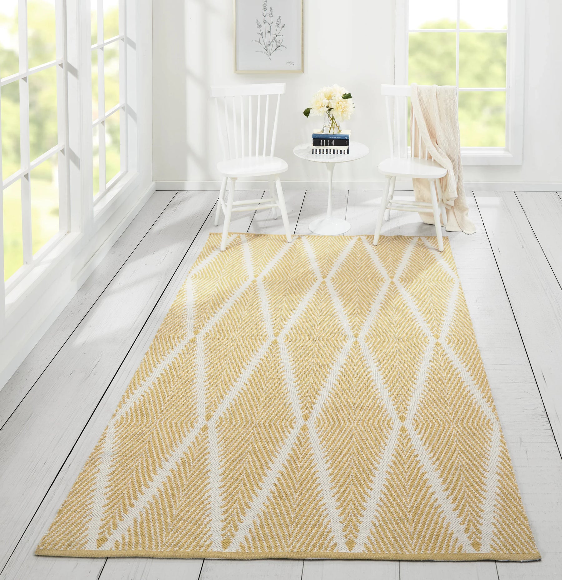 Traditional patterns take new form in the tribal design of this decorative area rug. Each rug is defined by an elongated diamond trellis pattern, filled with stripes in bold shades of black, blue, yellow and orange. Synthetic fibers make each hand-woven floorcovering suitable for well-travelled floors throughout the home.